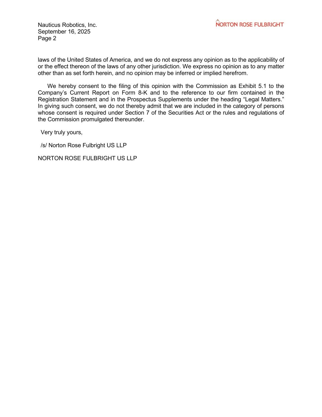 Nauticus Robotics, Inc. September 16, 2025 Page 2 laws of the United States of America, and we do not express any opinion as to the applicability of or the effect thereon of the laws of any other jurisdiction. We express no opinion as to any matter other than as set forth herein, and no opinion may be inferred or implied herefrom. We hereby consent to the filing of this opinion with the Commission as Exhibit 5.1 to the Company’s Current Report on Form 8-K and to the reference to our firm contained in the Registration Statement and in the Prospectus Supplements under the heading “Legal Matters.” In giving such consent, we do not thereby admit that we are included in the category of persons whose consent is required under Section 7 of the Securities Act or the rules and regulations of the Commission promulgated thereunder. Very truly yours, /s/ Norton Rose Fulbright US LLP NORTON ROSE FULBRIGHT US LLP