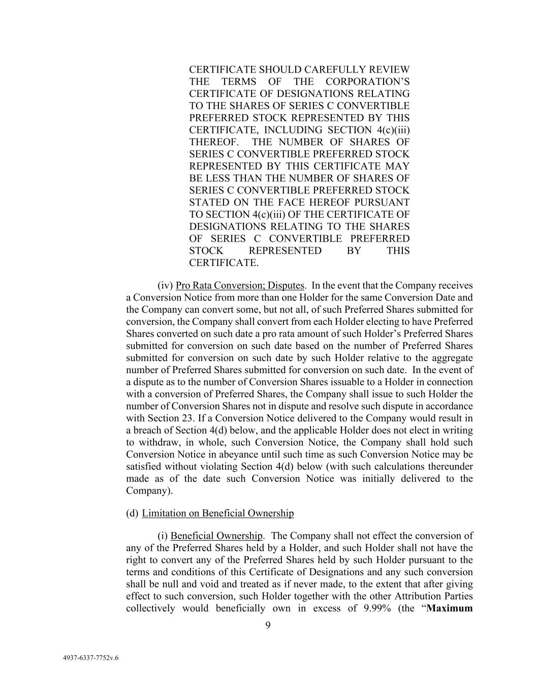 9 4937-6337-7752v.6 CERTIFICATE SHOULD CAREFULLY REVIEW THE TERMS OF THE CORPORATION’S CERTIFICATE OF DESIGNATIONS RELATING TO THE SHARES OF SERIES C CONVERTIBLE PREFERRED STOCK REPRESENTED BY THIS CERTIFICATE, INCLUDING SECTION 4(c)(iii) THEREOF. THE NUMBER OF SHARES OF SERIES C CONVERTIBLE PREFERRED STOCK REPRESENTED BY THIS CERTIFICATE MAY BE LESS THAN THE NUMBER OF SHARES OF SERIES C CONVERTIBLE PREFERRED STOCK STATED ON THE FACE HEREOF PURSUANT TO SECTION 4(c)(iii) OF THE CERTIFICATE OF DESIGNATIONS RELATING TO THE SHARES OF SERIES C CONVERTIBLE PREFERRED STOCK REPRESENTED BY THIS CERTIFICATE. (iv) Pro Rata Conversion; Disputes. In the event that the Company receives a Conversion Notice from more than one Holder for the same Conversion Date and the Company can convert some, but not all, of such Preferred Shares submitted for conversion, the Company shall convert from each Holder electing to have Preferred Shares converted on such date a pro rata amount of such Holder’s Preferred Shares submitted for conversion on such date based on the number of Preferred Shares submitted for conversion on such date by such Holder relative to the aggregate number of Preferred Shares submitted for conversion on such date. In the event of a dispute as to the number of Conversion Shares issuable to a Holder in connection with a conversion of Preferred Shares, the Company shall issue to such Holder the number of Conversion Shares not in dispute and resolve such dispute in accordance with Section 23. If a Conversion Notice delivered to the Company would result in a breach of Section 4(d) below, and the applicable Holder does not elect in writing to withdraw, in whole, such Conversion Notice, the Company shall hold such Conversion Notice in abeyance until such time as such Conversion Notice may be satisfied without violating Section 4(d) below (with such calculations thereunder made as of the date such Conversion Notice was initially delivered to the Company). (d) Limitation on Beneficial Ownership (i) Beneficial Ownership. The Company shall not effect the conversion of any of the Preferred Shares held by a Holder, and such Holder shall not have the right to convert any of the Preferred Shares held by such Holder pursuant to the terms and conditions of this Certificate of Designations and any such conversion shall be null and void and treated as if never made, to the extent that after giving effect to such conversion, such Holder together with the other Attribution Parties collectively would beneficially own in excess of 9.99% (the “Maximum