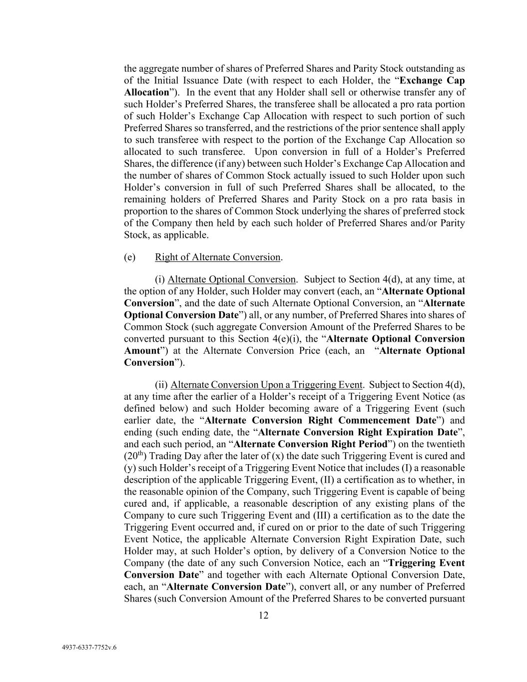 12 4937-6337-7752v.6 the aggregate number of shares of Preferred Shares and Parity Stock outstanding as of the Initial Issuance Date (with respect to each Holder, the “Exchange Cap Allocation”). In the event that any Holder shall sell or otherwise transfer any of such Holder’s Preferred Shares, the transferee shall be allocated a pro rata portion of such Holder’s Exchange Cap Allocation with respect to such portion of such Preferred Shares so transferred, and the restrictions of the prior sentence shall apply to such transferee with respect to the portion of the Exchange Cap Allocation so allocated to such transferee. Upon conversion in full of a Holder’s Preferred Shares, the difference (if any) between such Holder’s Exchange Cap Allocation and the number of shares of Common Stock actually issued to such Holder upon such Holder’s conversion in full of such Preferred Shares shall be allocated, to the remaining holders of Preferred Shares and Parity Stock on a pro rata basis in proportion to the shares of Common Stock underlying the shares of preferred stock of the Company then held by each such holder of Preferred Shares and/or Parity Stock, as applicable. (e) Right of Alternate Conversion. (i) Alternate Optional Conversion. Subject to Section 4(d), at any time, at the option of any Holder, such Holder may convert (each, an “Alternate Optional Conversion”, and the date of such Alternate Optional Conversion, an “Alternate Optional Conversion Date”) all, or any number, of Preferred Shares into shares of Common Stock (such aggregate Conversion Amount of the Preferred Shares to be converted pursuant to this Section 4(e)(i), the “Alternate Optional Conversion Amount”) at the Alternate Conversion Price (each, an “Alternate Optional Conversion”). (ii) Alternate Conversion Upon a Triggering Event. Subject to Section 4(d), at any time after the earlier of a Holder’s receipt of a Triggering Event Notice (as defined below) and such Holder becoming aware of a Triggering Event (such earlier date, the “Alternate Conversion Right Commencement Date”) and ending (such ending date, the “Alternate Conversion Right Expiration Date”, and each such period, an “Alternate Conversion Right Period”) on the twentieth (20th) Trading Day after the later of (x) the date such Triggering Event is cured and (y) such Holder’s receipt of a Triggering Event Notice that includes (I) a reasonable description of the applicable Triggering Event, (II) a certification as to whether, in the reasonable opinion of the Company, such Triggering Event is capable of being cured and, if applicable, a reasonable description of any existing plans of the Company to cure such Triggering Event and (III) a certification as to the date the Triggering Event occurred and, if cured on or prior to the date of such Triggering Event Notice, the applicable Alternate Conversion Right Expiration Date, such Holder may, at such Holder’s option, by delivery of a Conversion Notice to the Company (the date of any such Conversion Notice, each an “Triggering Event Conversion Date” and together with each Alternate Optional Conversion Date, each, an “Alternate Conversion Date”), convert all, or any number of Preferred Shares (such Conversion Amount of the Preferred Shares to be converted pursuant