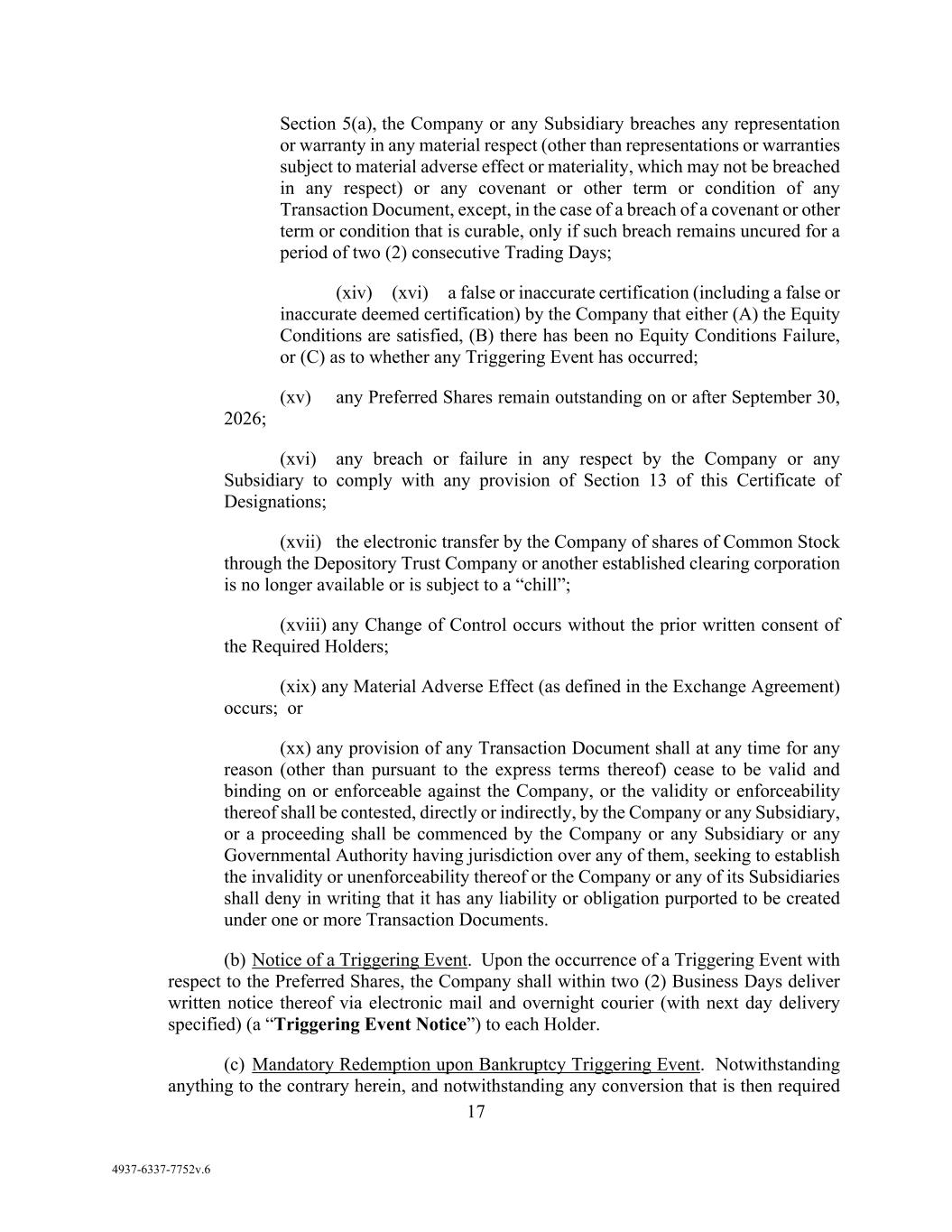 17 4937-6337-7752v.6 Section 5(a), the Company or any Subsidiary breaches any representation or warranty in any material respect (other than representations or warranties subject to material adverse effect or materiality, which may not be breached in any respect) or any covenant or other term or condition of any Transaction Document, except, in the case of a breach of a covenant or other term or condition that is curable, only if such breach remains uncured for a period of two (2) consecutive Trading Days; (xiv) (xvi) a false or inaccurate certification (including a false or inaccurate deemed certification) by the Company that either (A) the Equity Conditions are satisfied, (B) there has been no Equity Conditions Failure, or (C) as to whether any Triggering Event has occurred; (xv) any Preferred Shares remain outstanding on or after September 30, 2026; (xvi) any breach or failure in any respect by the Company or any Subsidiary to comply with any provision of Section 13 of this Certificate of Designations; (xvii) the electronic transfer by the Company of shares of Common Stock through the Depository Trust Company or another established clearing corporation is no longer available or is subject to a “chill”; (xviii) any Change of Control occurs without the prior written consent of the Required Holders; (xix) any Material Adverse Effect (as defined in the Exchange Agreement) occurs; or (xx) any provision of any Transaction Document shall at any time for any reason (other than pursuant to the express terms thereof) cease to be valid and binding on or enforceable against the Company, or the validity or enforceability thereof shall be contested, directly or indirectly, by the Company or any Subsidiary, or a proceeding shall be commenced by the Company or any Subsidiary or any Governmental Authority having jurisdiction over any of them, seeking to establish the invalidity or unenforceability thereof or the Company or any of its Subsidiaries shall deny in writing that it has any liability or obligation purported to be created under one or more Transaction Documents. (b) Notice of a Triggering Event. Upon the occurrence of a Triggering Event with respect to the Preferred Shares, the Company shall within two (2) Business Days deliver written notice thereof via electronic mail and overnight courier (with next day delivery specified) (a “Triggering Event Notice”) to each Holder. (c) Mandatory Redemption upon Bankruptcy Triggering Event. Notwithstanding anything to the contrary herein, and notwithstanding any conversion that is then required