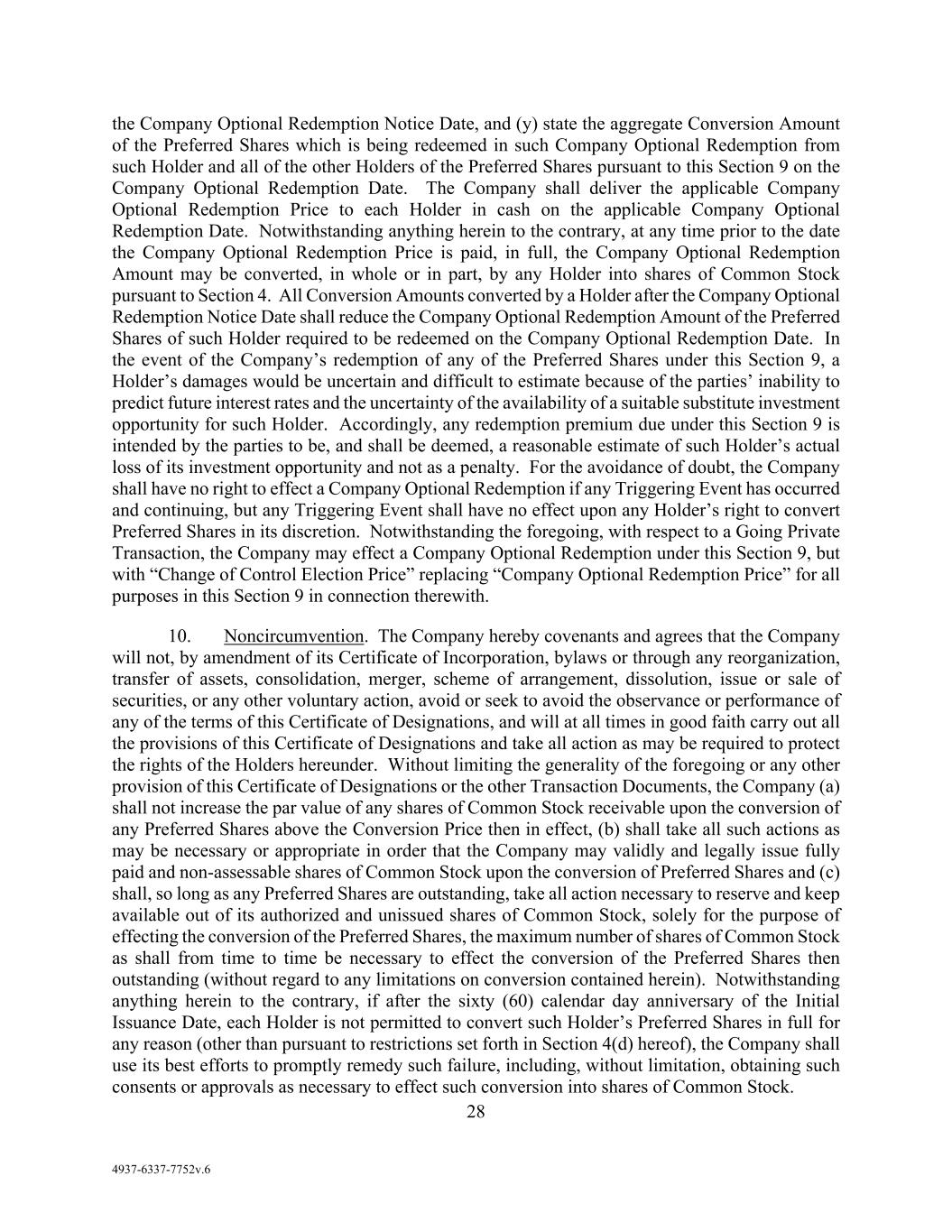 28 4937-6337-7752v.6 the Company Optional Redemption Notice Date, and (y) state the aggregate Conversion Amount of the Preferred Shares which is being redeemed in such Company Optional Redemption from such Holder and all of the other Holders of the Preferred Shares pursuant to this Section 9 on the Company Optional Redemption Date. The Company shall deliver the applicable Company Optional Redemption Price to each Holder in cash on the applicable Company Optional Redemption Date. Notwithstanding anything herein to the contrary, at any time prior to the date the Company Optional Redemption Price is paid, in full, the Company Optional Redemption Amount may be converted, in whole or in part, by any Holder into shares of Common Stock pursuant to Section 4. All Conversion Amounts converted by a Holder after the Company Optional Redemption Notice Date shall reduce the Company Optional Redemption Amount of the Preferred Shares of such Holder required to be redeemed on the Company Optional Redemption Date. In the event of the Company’s redemption of any of the Preferred Shares under this Section 9, a Holder’s damages would be uncertain and difficult to estimate because of the parties’ inability to predict future interest rates and the uncertainty of the availability of a suitable substitute investment opportunity for such Holder. Accordingly, any redemption premium due under this Section 9 is intended by the parties to be, and shall be deemed, a reasonable estimate of such Holder’s actual loss of its investment opportunity and not as a penalty. For the avoidance of doubt, the Company shall have no right to effect a Company Optional Redemption if any Triggering Event has occurred and continuing, but any Triggering Event shall have no effect upon any Holder’s right to convert Preferred Shares in its discretion. Notwithstanding the foregoing, with respect to a Going Private Transaction, the Company may effect a Company Optional Redemption under this Section 9, but with “Change of Control Election Price” replacing “Company Optional Redemption Price” for all purposes in this Section 9 in connection therewith. 10. Noncircumvention. The Company hereby covenants and agrees that the Company will not, by amendment of its Certificate of Incorporation, bylaws or through any reorganization, transfer of assets, consolidation, merger, scheme of arrangement, dissolution, issue or sale of securities, or any other voluntary action, avoid or seek to avoid the observance or performance of any of the terms of this Certificate of Designations, and will at all times in good faith carry out all the provisions of this Certificate of Designations and take all action as may be required to protect the rights of the Holders hereunder. Without limiting the generality of the foregoing or any other provision of this Certificate of Designations or the other Transaction Documents, the Company (a) shall not increase the par value of any shares of Common Stock receivable upon the conversion of any Preferred Shares above the Conversion Price then in effect, (b) shall take all such actions as may be necessary or appropriate in order that the Company may validly and legally issue fully paid and non-assessable shares of Common Stock upon the conversion of Preferred Shares and (c) shall, so long as any Preferred Shares are outstanding, take all action necessary to reserve and keep available out of its authorized and unissued shares of Common Stock, solely for the purpose of effecting the conversion of the Preferred Shares, the maximum number of shares of Common Stock as shall from time to time be necessary to effect the conversion of the Preferred Shares then outstanding (without regard to any limitations on conversion contained herein). Notwithstanding anything herein to the contrary, if after the sixty (60) calendar day anniversary of the Initial Issuance Date, each Holder is not permitted to convert such Holder’s Preferred Shares in full for any reason (other than pursuant to restrictions set forth in Section 4(d) hereof), the Company shall use its best efforts to promptly remedy such failure, including, without limitation, obtaining such consents or approvals as necessary to effect such conversion into shares of Common Stock.