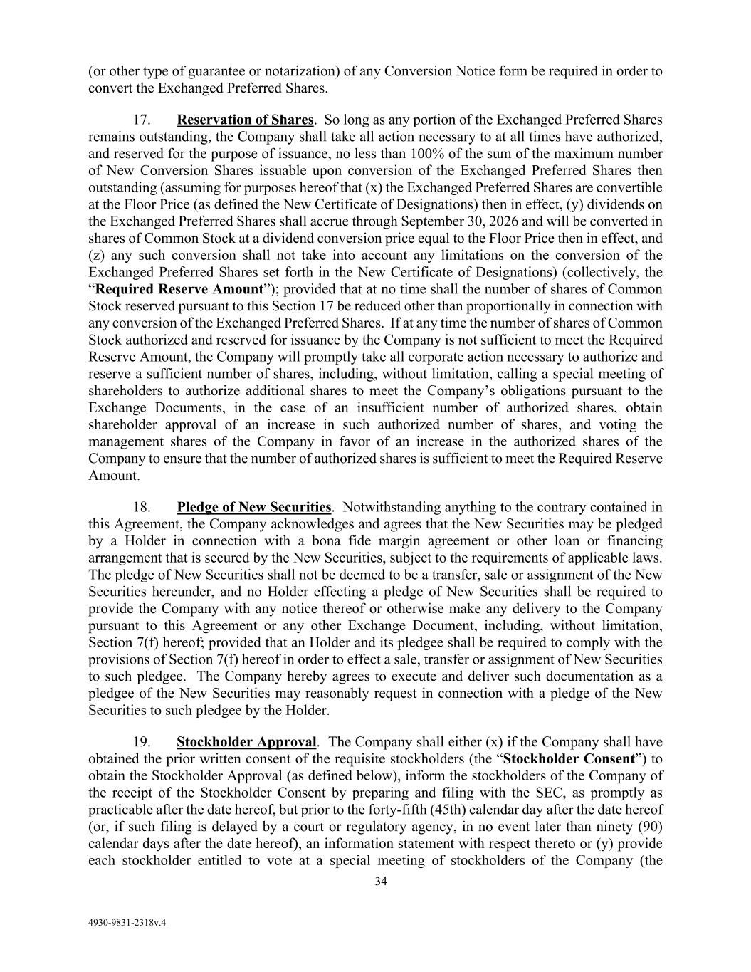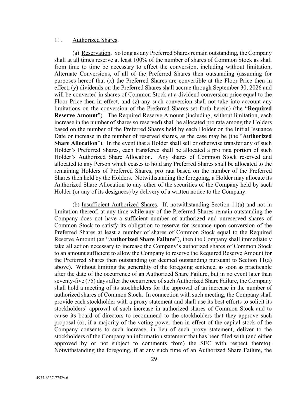 29 4937-6337-7752v.6 11. Authorized Shares. (a) Reservation. So long as any Preferred Shares remain outstanding, the Company shall at all times reserve at least 100% of the number of shares of Common Stock as shall from time to time be necessary to effect the conversion, including without limitation, Alternate Conversions, of all of the Preferred Shares then outstanding (assuming for purposes hereof that (x) the Preferred Shares are convertible at the Floor Price then in effect, (y) dividends on the Preferred Shares shall accrue through September 30, 2026 and will be converted in shares of Common Stock at a dividend conversion price equal to the Floor Price then in effect, and (z) any such conversion shall not take into account any limitations on the conversion of the Preferred Shares set forth herein) (the “Required Reserve Amount”). The Required Reserve Amount (including, without limitation, each increase in the number of shares so reserved) shall be allocated pro rata among the Holders based on the number of the Preferred Shares held by each Holder on the Initial Issuance Date or increase in the number of reserved shares, as the case may be (the “Authorized Share Allocation”). In the event that a Holder shall sell or otherwise transfer any of such Holder’s Preferred Shares, each transferee shall be allocated a pro rata portion of such Holder’s Authorized Share Allocation. Any shares of Common Stock reserved and allocated to any Person which ceases to hold any Preferred Shares shall be allocated to the remaining Holders of Preferred Shares, pro rata based on the number of the Preferred Shares then held by the Holders. Notwithstanding the foregoing, a Holder may allocate its Authorized Share Allocation to any other of the securities of the Company held by such Holder (or any of its designees) by delivery of a written notice to the Company. (b) Insufficient Authorized Shares. If, notwithstanding Section 11(a) and not in limitation thereof, at any time while any of the Preferred Shares remain outstanding the Company does not have a sufficient number of authorized and unreserved shares of Common Stock to satisfy its obligation to reserve for issuance upon conversion of the Preferred Shares at least a number of shares of Common Stock equal to the Required Reserve Amount (an “Authorized Share Failure”), then the Company shall immediately take all action necessary to increase the Company’s authorized shares of Common Stock to an amount sufficient to allow the Company to reserve the Required Reserve Amount for the Preferred Shares then outstanding (or deemed outstanding pursuant to Section 11(a) above). Without limiting the generality of the foregoing sentence, as soon as practicable after the date of the occurrence of an Authorized Share Failure, but in no event later than seventy-five (75) days after the occurrence of such Authorized Share Failure, the Company shall hold a meeting of its stockholders for the approval of an increase in the number of authorized shares of Common Stock. In connection with such meeting, the Company shall provide each stockholder with a proxy statement and shall use its best efforts to solicit its stockholders’ approval of such increase in authorized shares of Common Stock and to cause its board of directors to recommend to the stockholders that they approve such proposal (or, if a majority of the voting power then in effect of the capital stock of the Company consents to such increase, in lieu of such proxy statement, deliver to the stockholders of the Company an information statement that has been filed with (and either approved by or not subject to comments from) the SEC with respect thereto). Notwithstanding the foregoing, if at any such time of an Authorized Share Failure, the