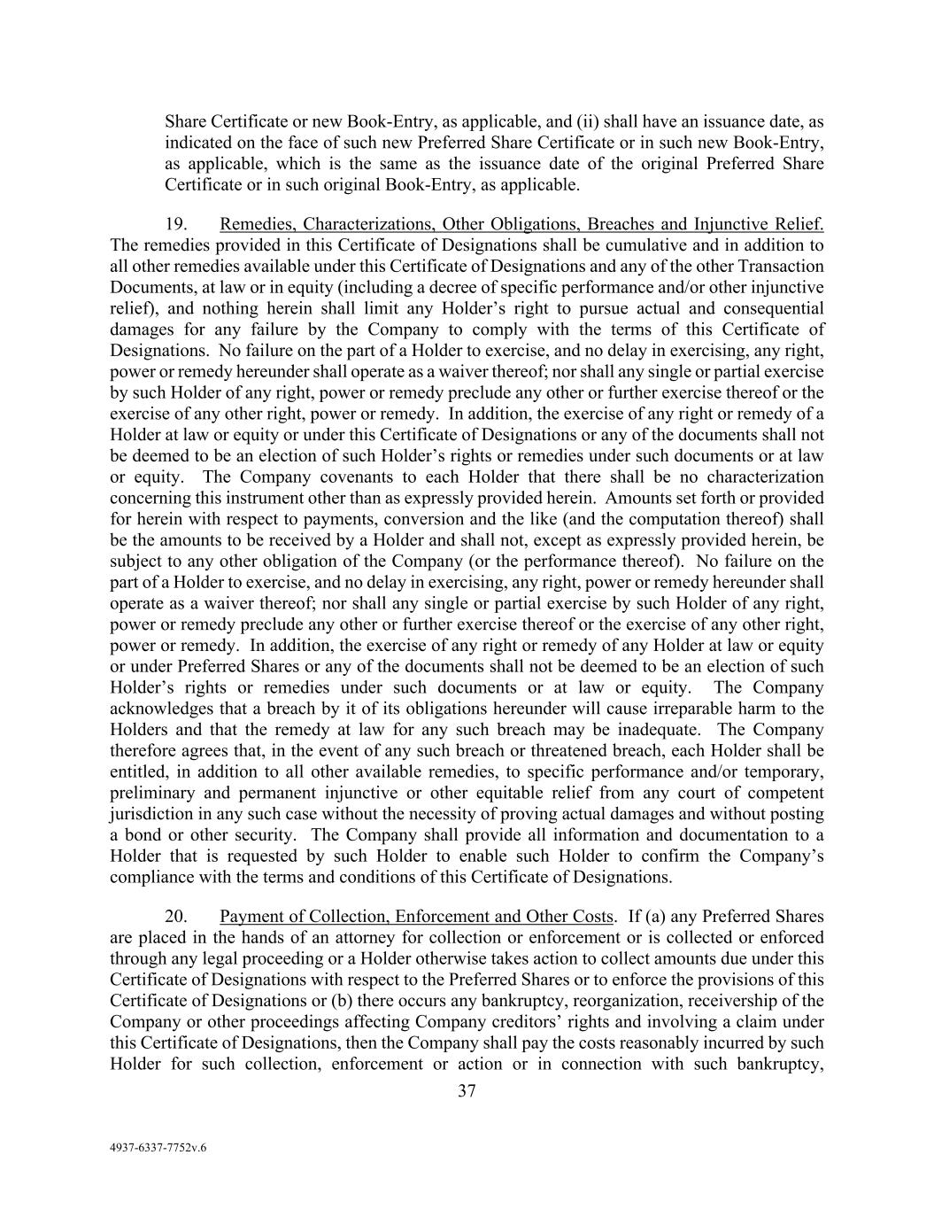 37 4937-6337-7752v.6 Share Certificate or new Book-Entry, as applicable, and (ii) shall have an issuance date, as indicated on the face of such new Preferred Share Certificate or in such new Book-Entry, as applicable, which is the same as the issuance date of the original Preferred Share Certificate or in such original Book-Entry, as applicable. 19. Remedies, Characterizations, Other Obligations, Breaches and Injunctive Relief. The remedies provided in this Certificate of Designations shall be cumulative and in addition to all other remedies available under this Certificate of Designations and any of the other Transaction Documents, at law or in equity (including a decree of specific performance and/or other injunctive relief), and nothing herein shall limit any Holder’s right to pursue actual and consequential damages for any failure by the Company to comply with the terms of this Certificate of Designations. No failure on the part of a Holder to exercise, and no delay in exercising, any right, power or remedy hereunder shall operate as a waiver thereof; nor shall any single or partial exercise by such Holder of any right, power or remedy preclude any other or further exercise thereof or the exercise of any other right, power or remedy. In addition, the exercise of any right or remedy of a Holder at law or equity or under this Certificate of Designations or any of the documents shall not be deemed to be an election of such Holder’s rights or remedies under such documents or at law or equity. The Company covenants to each Holder that there shall be no characterization concerning this instrument other than as expressly provided herein. Amounts set forth or provided for herein with respect to payments, conversion and the like (and the computation thereof) shall be the amounts to be received by a Holder and shall not, except as expressly provided herein, be subject to any other obligation of the Company (or the performance thereof). No failure on the part of a Holder to exercise, and no delay in exercising, any right, power or remedy hereunder shall operate as a waiver thereof; nor shall any single or partial exercise by such Holder of any right, power or remedy preclude any other or further exercise thereof or the exercise of any other right, power or remedy. In addition, the exercise of any right or remedy of any Holder at law or equity or under Preferred Shares or any of the documents shall not be deemed to be an election of such Holder’s rights or remedies under such documents or at law or equity. The Company acknowledges that a breach by it of its obligations hereunder will cause irreparable harm to the Holders and that the remedy at law for any such breach may be inadequate. The Company therefore agrees that, in the event of any such breach or threatened breach, each Holder shall be entitled, in addition to all other available remedies, to specific performance and/or temporary, preliminary and permanent injunctive or other equitable relief from any court of competent jurisdiction in any such case without the necessity of proving actual damages and without posting a bond or other security. The Company shall provide all information and documentation to a Holder that is requested by such Holder to enable such Holder to confirm the Company’s compliance with the terms and conditions of this Certificate of Designations. 20. Payment of Collection, Enforcement and Other Costs. If (a) any Preferred Shares are placed in the hands of an attorney for collection or enforcement or is collected or enforced through any legal proceeding or a Holder otherwise takes action to collect amounts due under this Certificate of Designations with respect to the Preferred Shares or to enforce the provisions of this Certificate of Designations or (b) there occurs any bankruptcy, reorganization, receivership of the Company or other proceedings affecting Company creditors’ rights and involving a claim under this Certificate of Designations, then the Company shall pay the costs reasonably incurred by such Holder for such collection, enforcement or action or in connection with such bankruptcy,
