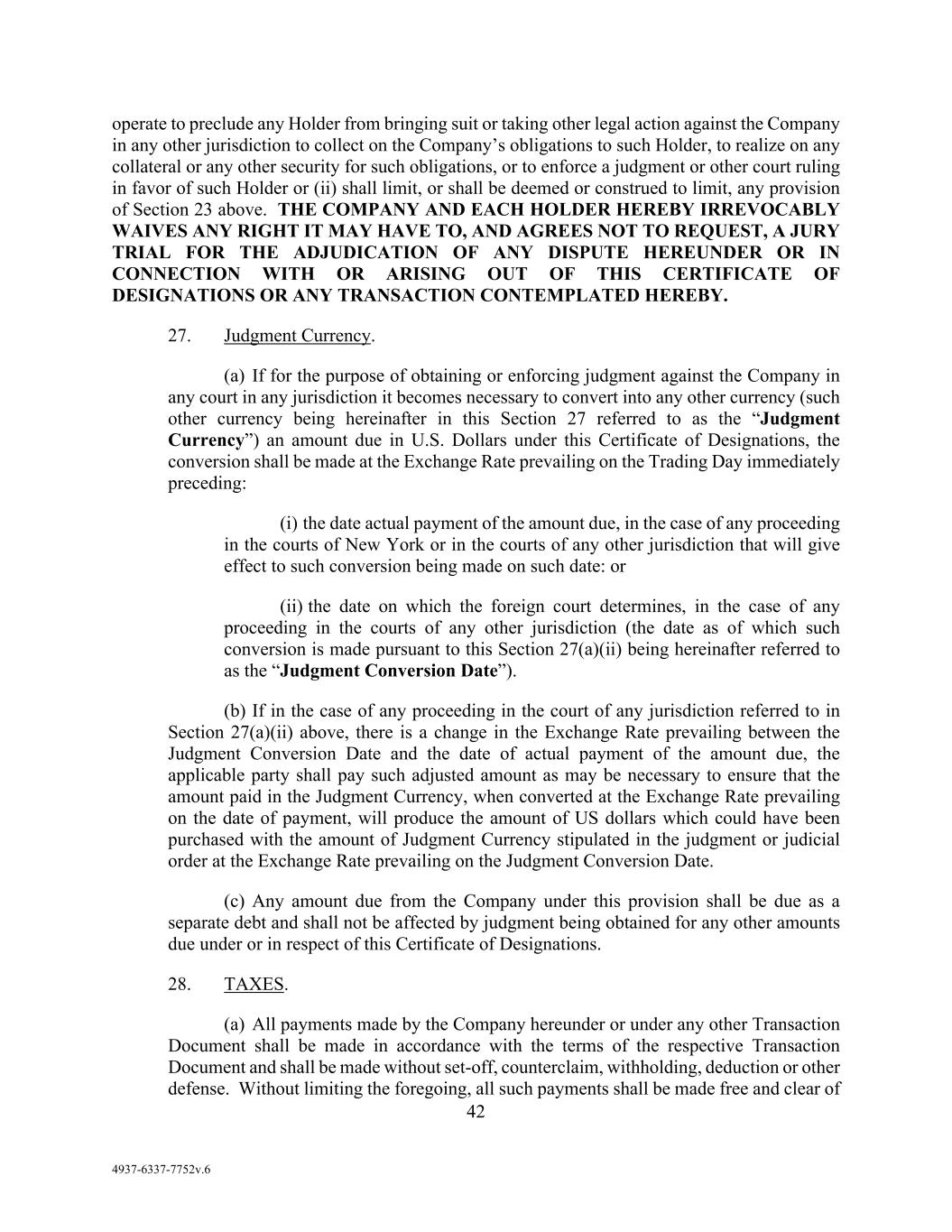 42 4937-6337-7752v.6 operate to preclude any Holder from bringing suit or taking other legal action against the Company in any other jurisdiction to collect on the Company’s obligations to such Holder, to realize on any collateral or any other security for such obligations, or to enforce a judgment or other court ruling in favor of such Holder or (ii) shall limit, or shall be deemed or construed to limit, any provision of Section 23 above. THE COMPANY AND EACH HOLDER HEREBY IRREVOCABLY WAIVES ANY RIGHT IT MAY HAVE TO, AND AGREES NOT TO REQUEST, A JURY TRIAL FOR THE ADJUDICATION OF ANY DISPUTE HEREUNDER OR IN CONNECTION WITH OR ARISING OUT OF THIS CERTIFICATE OF DESIGNATIONS OR ANY TRANSACTION CONTEMPLATED HEREBY. 27. Judgment Currency. (a) If for the purpose of obtaining or enforcing judgment against the Company in any court in any jurisdiction it becomes necessary to convert into any other currency (such other currency being hereinafter in this Section 27 referred to as the “Judgment Currency”) an amount due in U.S. Dollars under this Certificate of Designations, the conversion shall be made at the Exchange Rate prevailing on the Trading Day immediately preceding: (i) the date actual payment of the amount due, in the case of any proceeding in the courts of New York or in the courts of any other jurisdiction that will give effect to such conversion being made on such date: or (ii) the date on which the foreign court determines, in the case of any proceeding in the courts of any other jurisdiction (the date as of which such conversion is made pursuant to this Section 27(a)(ii) being hereinafter referred to as the “Judgment Conversion Date”). (b) If in the case of any proceeding in the court of any jurisdiction referred to in Section 27(a)(ii) above, there is a change in the Exchange Rate prevailing between the Judgment Conversion Date and the date of actual payment of the amount due, the applicable party shall pay such adjusted amount as may be necessary to ensure that the amount paid in the Judgment Currency, when converted at the Exchange Rate prevailing on the date of payment, will produce the amount of US dollars which could have been purchased with the amount of Judgment Currency stipulated in the judgment or judicial order at the Exchange Rate prevailing on the Judgment Conversion Date. (c) Any amount due from the Company under this provision shall be due as a separate debt and shall not be affected by judgment being obtained for any other amounts due under or in respect of this Certificate of Designations. 28. TAXES. (a) All payments made by the Company hereunder or under any other Transaction Document shall be made in accordance with the terms of the respective Transaction Document and shall be made without set-off, counterclaim, withholding, deduction or other defense. Without limiting the foregoing, all such payments shall be made free and clear of