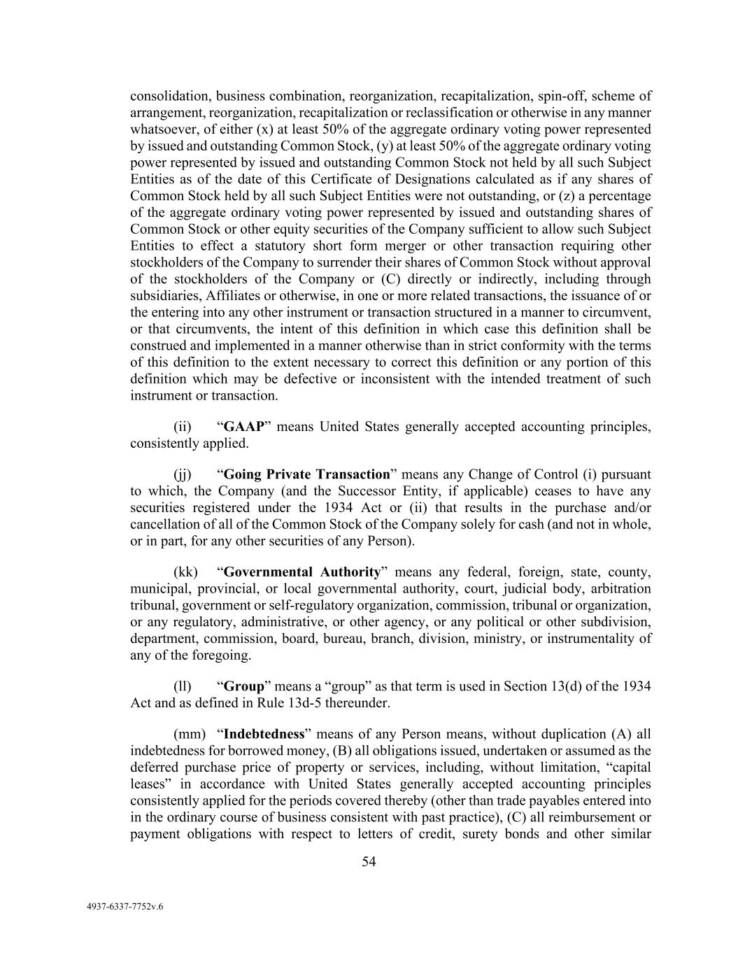 54 4937-6337-7752v.6 consolidation, business combination, reorganization, recapitalization, spin-off, scheme of arrangement, reorganization, recapitalization or reclassification or otherwise in any manner whatsoever, of either (x) at least 50% of the aggregate ordinary voting power represented by issued and outstanding Common Stock, (y) at least 50% of the aggregate ordinary voting power represented by issued and outstanding Common Stock not held by all such Subject Entities as of the date of this Certificate of Designations calculated as if any shares of Common Stock held by all such Subject Entities were not outstanding, or (z) a percentage of the aggregate ordinary voting power represented by issued and outstanding shares of Common Stock or other equity securities of the Company sufficient to allow such Subject Entities to effect a statutory short form merger or other transaction requiring other stockholders of the Company to surrender their shares of Common Stock without approval of the stockholders of the Company or (C) directly or indirectly, including through subsidiaries, Affiliates or otherwise, in one or more related transactions, the issuance of or the entering into any other instrument or transaction structured in a manner to circumvent, or that circumvents, the intent of this definition in which case this definition shall be construed and implemented in a manner otherwise than in strict conformity with the terms of this definition to the extent necessary to correct this definition or any portion of this definition which may be defective or inconsistent with the intended treatment of such instrument or transaction. (ii) “GAAP” means United States generally accepted accounting principles, consistently applied. (jj) “Going Private Transaction” means any Change of Control (i) pursuant to which, the Company (and the Successor Entity, if applicable) ceases to have any securities registered under the 1934 Act or (ii) that results in the purchase and/or cancellation of all of the Common Stock of the Company solely for cash (and not in whole, or in part, for any other securities of any Person). (kk) “Governmental Authority” means any federal, foreign, state, county, municipal, provincial, or local governmental authority, court, judicial body, arbitration tribunal, government or self-regulatory organization, commission, tribunal or organization, or any regulatory, administrative, or other agency, or any political or other subdivision, department, commission, board, bureau, branch, division, ministry, or instrumentality of any of the foregoing. (ll) “Group” means a “group” as that term is used in Section 13(d) of the 1934 Act and as defined in Rule 13d-5 thereunder. (mm) “Indebtedness” means of any Person means, without duplication (A) all indebtedness for borrowed money, (B) all obligations issued, undertaken or assumed as the deferred purchase price of property or services, including, without limitation, “capital leases” in accordance with United States generally accepted accounting principles consistently applied for the periods covered thereby (other than trade payables entered into in the ordinary course of business consistent with past practice), (C) all reimbursement or payment obligations with respect to letters of credit, surety bonds and other similar