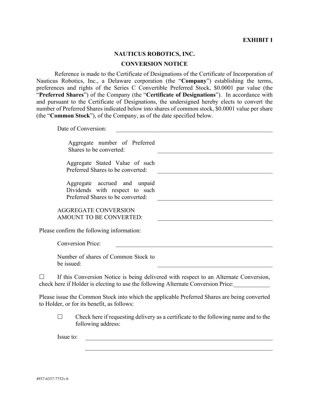 4937-6337-7752v.6 EXHIBIT I NAUTICUS ROBOTICS, INC. CONVERSION NOTICE Reference is made to the Certificate of Designations of the Certificate of Incorporation of Nauticus Robotics, Inc., a Delaware corporation (the “Company”) establishing the terms, preferences and rights of the Series C Convertible Preferred Stock, $0.0001 par value (the “Preferred Shares”) of the Company (the “Certificate of Designations”). In accordance with and pursuant to the Certificate of Designations, the undersigned hereby elects to convert the number of Preferred Shares indicated below into shares of common stock, $0.0001 value per share (the “Common Stock”), of the Company, as of the date specified below. Date of Conversion: Aggregate number of Preferred Shares to be converted: Aggregate Stated Value of such Preferred Shares to be converted: Aggregate accrued and unpaid Dividends with respect to such Preferred Shares to be converted: AGGREGATE CONVERSION AMOUNT TO BE CONVERTED: Please confirm the following information: Conversion Price: Number of shares of Common Stock to be issued: If this Conversion Notice is being delivered with respect to an Alternate Conversion, check here if Holder is electing to use the following Alternate Conversion Price:____________ Please issue the Common Stock into which the applicable Preferred Shares are being converted to Holder, or for its benefit, as follows: Check here if requesting delivery as a certificate to the following name and to the following address: Issue to: