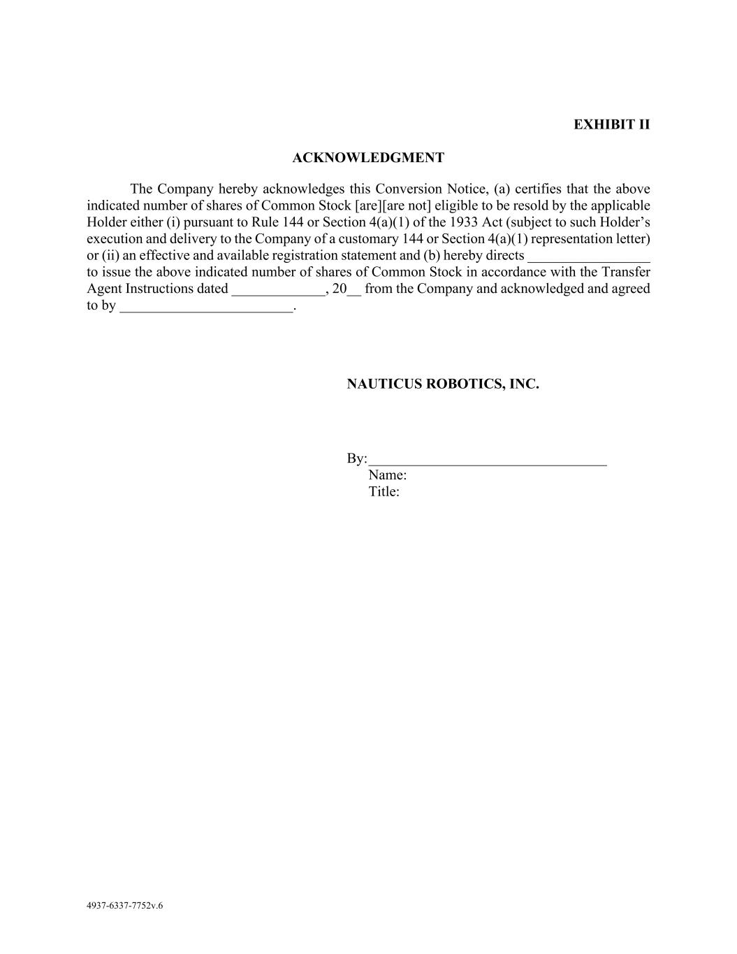 4937-6337-7752v.6 EXHIBIT II ACKNOWLEDGMENT The Company hereby acknowledges this Conversion Notice, (a) certifies that the above indicated number of shares of Common Stock [are][are not] eligible to be resold by the applicable Holder either (i) pursuant to Rule 144 or Section 4(a)(1) of the 1933 Act (subject to such Holder’s execution and delivery to the Company of a customary 144 or Section 4(a)(1) representation letter) or (ii) an effective and available registration statement and (b) hereby directs _________________ to issue the above indicated number of shares of Common Stock in accordance with the Transfer Agent Instructions dated _____________, 20__ from the Company and acknowledged and agreed to by ________________________. NAUTICUS ROBOTICS, INC. By: _________________________________ Name: Title: