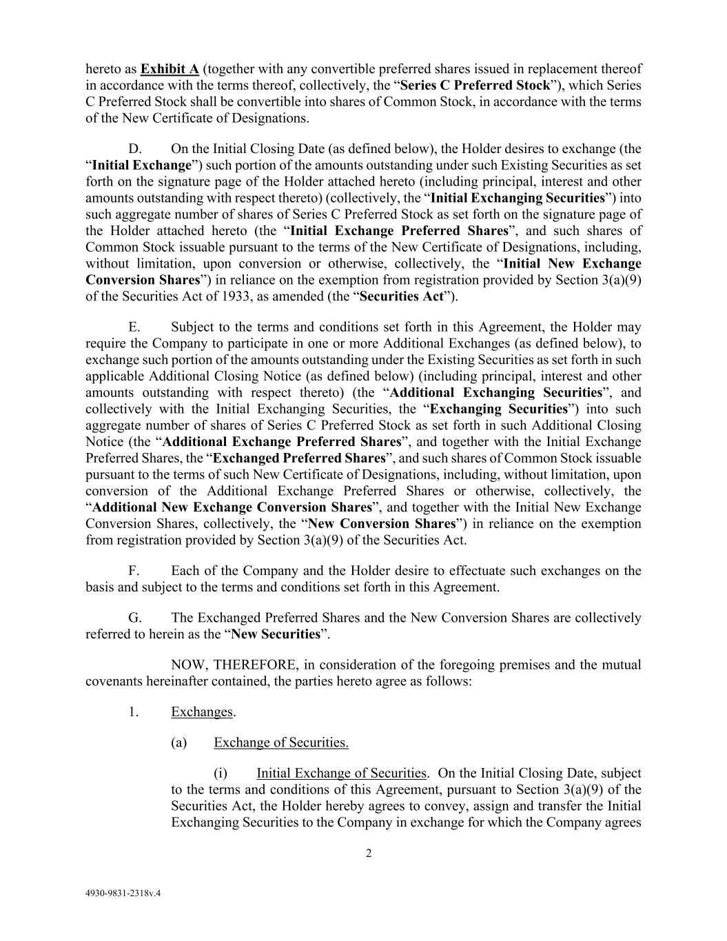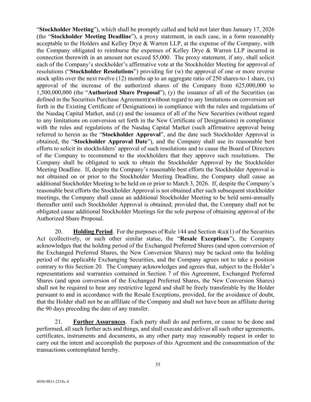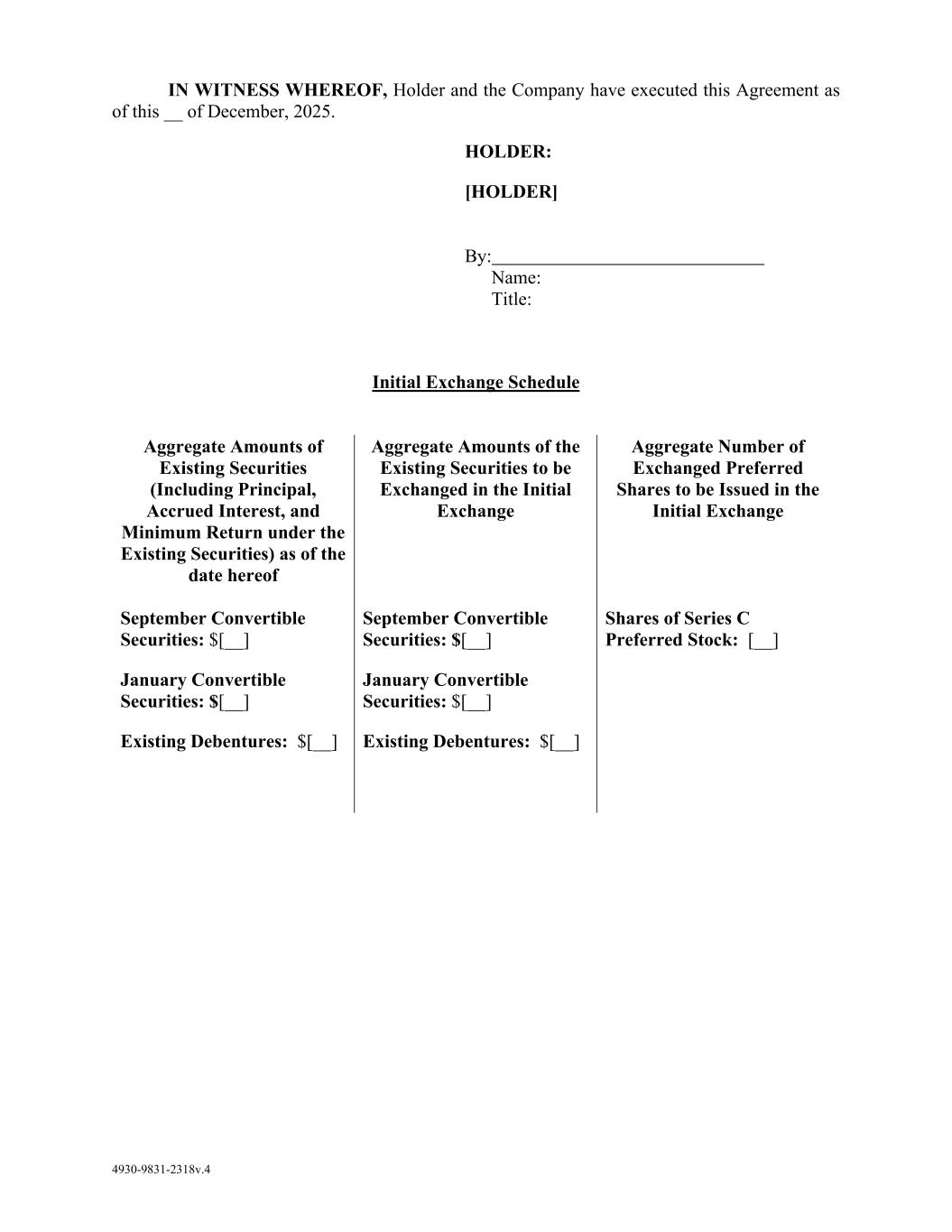 52 4937-6337-7752v.6 the event requiring the satisfaction of the Equity Conditions are duly authorized and listed and eligible for trading without restriction on an Eligible Market. (bb) “Equity Conditions Failure” means that on any day during the period commencing twenty (20) Trading Days prior to such applicable date of determination, the Equity Conditions have not been satisfied (or waived in writing by the applicable Holder). (cc) “Exchange Agreement” means those certain amendment and exchange agreements by and among the Company and each initial holders of Preferred Shares, dated as of the Exchange Date, as may be amended from time in accordance with the terms thereof. (dd) “Exchange Date” means December 3, 2025. (ee) “Excluded Securities” means (i) shares of Common Stock or standard options to purchase Common Stock issued to directors, officers or employees of the Company for services rendered to the Company in their capacity as such pursuant to an Approved Stock Plan (as defined above), provided that (A) all such issuances (taking into account the shares of Common Stock issuable upon exercise of such options) after the Exchange Date pursuant to this clause (i) do not, in the aggregate, exceed more than 10% of the Common Stock issued and outstanding on a fully-diluted basis, giving effect to the exercise or conversion of Convertible Securities, immediately prior to the Exchange Date and (B) the exercise price of any such options is not lowered, none of such options are amended to increase the number of shares issuable thereunder and none of the terms or conditions of any such options are otherwise materially changed in any manner that adversely affects any of the Holders; (ii) shares of Common Stock issued upon the conversion or exercise, as applicable, of Convertible Securities or Options (other than standard options to purchase Common Stock issued pursuant to an Approved Stock Plan that are covered by clause (i) above) issued prior to the Exchange Date, provided that the conversion price or exercise price, as applicable, of any such Convertible Securities or Options (other than standard options to purchase Common Stock issued pursuant to an Approved Stock Plan that are covered by clause (i) above) is not lowered, none of such Convertible Securities or Options (other than standard options to purchase Common Stock issued pursuant to an Approved Stock Plan that are covered by clause (i) above) are amended to increase the number of shares issuable thereunder and none of the terms or conditions of any such Convertible Securities or Options (other than standard options to purchase Common Stock issued pursuant to an Approved Stock Plan that are covered by clause (i) above) are otherwise materially changed in any manner that adversely affects any of the Holders; (iii) the shares of Common Stock issuable upon conversion of the Preferred Shares or otherwise pursuant to the terms of this Certificate of Designations; provided, that the terms of this Certificate of Designations are not amended, modified or changed on or after the Exchange Date (other than antidilution adjustments pursuant to the terms thereof in effect as of the Exchange Date); and (iv) the shares of Common Stock issued or issuable pursuant to a Permitted VRT.