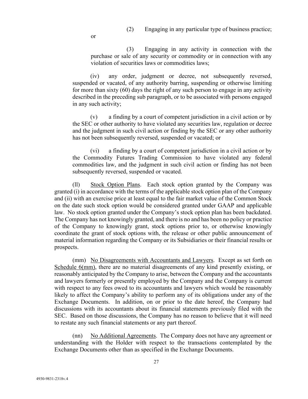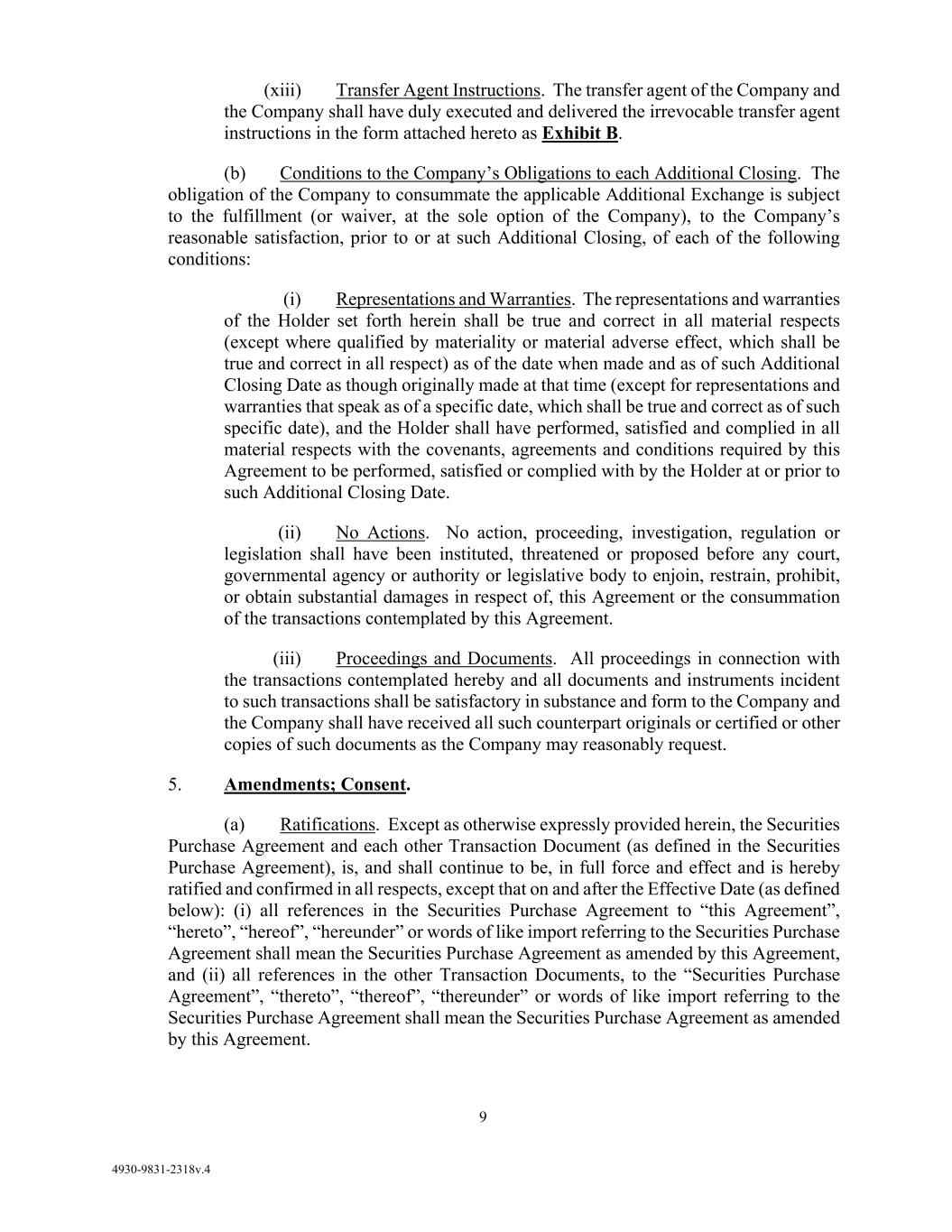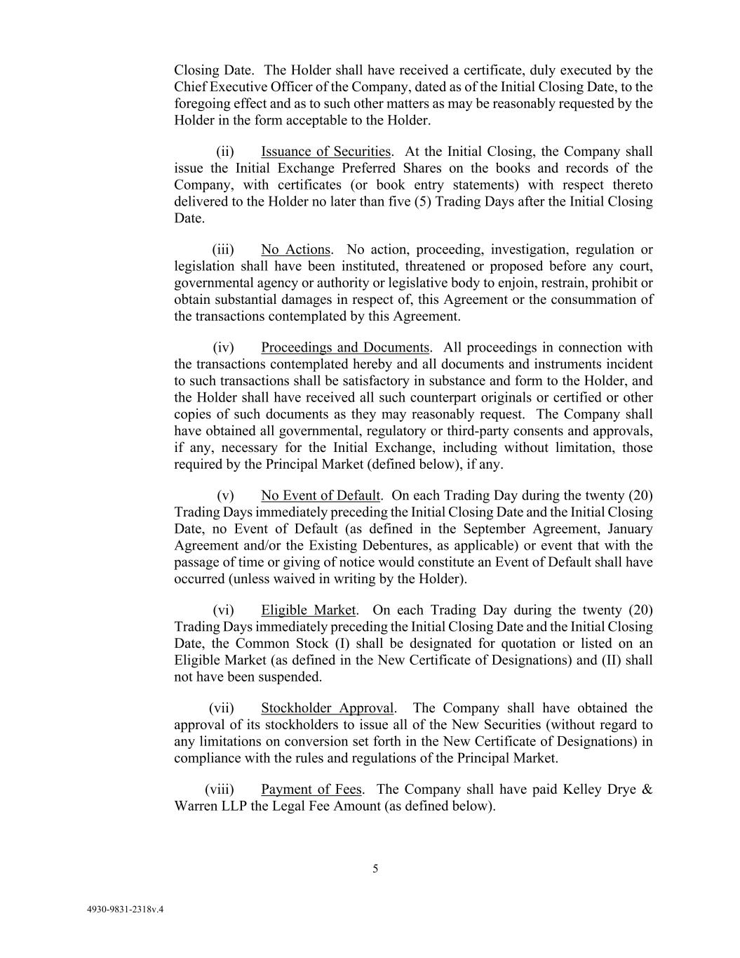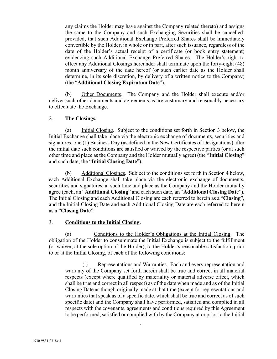 52 4937-6337-7752v.6 the event requiring the satisfaction of the Equity Conditions are duly authorized and listed and eligible for trading without restriction on an Eligible Market. (bb) “Equity Conditions Failure” means that on any day during the period commencing twenty (20) Trading Days prior to such applicable date of determination, the Equity Conditions have not been satisfied (or waived in writing by the applicable Holder). (cc) “Exchange Agreement” means those certain amendment and exchange agreements by and among the Company and each initial holders of Preferred Shares, dated as of the Exchange Date, as may be amended from time in accordance with the terms thereof. (dd) “Exchange Date” means December 3, 2025. (ee) “Excluded Securities” means (i) shares of Common Stock or standard options to purchase Common Stock issued to directors, officers or employees of the Company for services rendered to the Company in their capacity as such pursuant to an Approved Stock Plan (as defined above), provided that (A) all such issuances (taking into account the shares of Common Stock issuable upon exercise of such options) after the Exchange Date pursuant to this clause (i) do not, in the aggregate, exceed more than 10% of the Common Stock issued and outstanding on a fully-diluted basis, giving effect to the exercise or conversion of Convertible Securities, immediately prior to the Exchange Date and (B) the exercise price of any such options is not lowered, none of such options are amended to increase the number of shares issuable thereunder and none of the terms or conditions of any such options are otherwise materially changed in any manner that adversely affects any of the Holders; (ii) shares of Common Stock issued upon the conversion or exercise, as applicable, of Convertible Securities or Options (other than standard options to purchase Common Stock issued pursuant to an Approved Stock Plan that are covered by clause (i) above) issued prior to the Exchange Date, provided that the conversion price or exercise price, as applicable, of any such Convertible Securities or Options (other than standard options to purchase Common Stock issued pursuant to an Approved Stock Plan that are covered by clause (i) above) is not lowered, none of such Convertible Securities or Options (other than standard options to purchase Common Stock issued pursuant to an Approved Stock Plan that are covered by clause (i) above) are amended to increase the number of shares issuable thereunder and none of the terms or conditions of any such Convertible Securities or Options (other than standard options to purchase Common Stock issued pursuant to an Approved Stock Plan that are covered by clause (i) above) are otherwise materially changed in any manner that adversely affects any of the Holders; (iii) the shares of Common Stock issuable upon conversion of the Preferred Shares or otherwise pursuant to the terms of this Certificate of Designations; provided, that the terms of this Certificate of Designations are not amended, modified or changed on or after the Exchange Date (other than antidilution adjustments pursuant to the terms thereof in effect as of the Exchange Date); and (iv) the shares of Common Stock issued or issuable pursuant to a Permitted VRT.