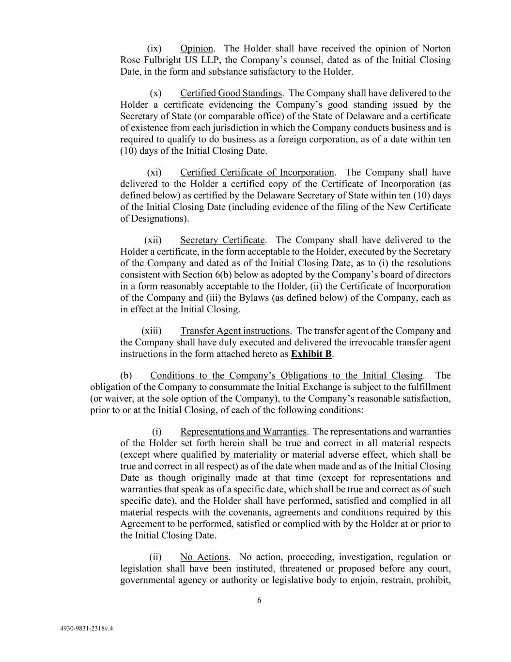 30 4937-6337-7752v.6 Company is able to obtain the written consent of a majority of the shares of its issued and outstanding shares of Common Stock to approve the increase in the number of authorized shares of Common Stock, the Company may satisfy this obligation by obtaining such consent and submitting for filing with the SEC an Information Statement on Schedule 14C. In the event that the Company is prohibited from issuing shares of Common Stock to a Holder upon any conversion due to the failure by the Company to have sufficient shares of Common Stock available out of the authorized but unissued shares of Common Stock (such unavailable number of shares of Common Stock, the “Authorized Failure Shares”), in lieu of delivering such Authorized Failure Shares to such Holder, the Company shall pay cash in exchange for the redemption of such portion of the Conversion Amount of the Preferred Shares convertible into such Authorized Failure Shares at a price equal to the sum of (i) the product of (x) such number of Authorized Failure Shares and (y) the greatest Closing Sale Price of the Common Stock on any Trading Day during the period commencing on the date such Holder delivers the applicable Conversion Notice with respect to such Authorized Failure Shares to the Company and ending on the date of such issuance and payment under this Section 11(b); and (ii) to the extent such Holder purchases (in an open market transaction or otherwise) shares of Common Stock to deliver in satisfaction of a sale by such Holder of Authorized Failure Shares, any brokerage commissions and other out-of-pocket expenses, if any, of such Holder incurred in connection therewith. Nothing contained in Section 11(a) or this Section 11(b) shall limit any obligations of the Company under any provision of the Exchange Agreement. 12. Voting Rights. The holders of the Preferred Shares shall have no voting power and no right to vote on any matter at any time, either as a separate series or class or together with any other series or class of share of capital stock, and shall not be entitled to call a meeting of such holders for any purpose nor shall they be entitled to participate in any meeting of the holders of Common Stock, except as provided in this Section 12 and Section 16 or as otherwise required by the DGCL. To the extent that under the DGCL the vote of the holders of the Preferred Shares, voting separately as a class or series, as applicable, is required to authorize a given action of the Company, the affirmative vote or consent of the Required Holders of the Preferred Shares, voting together in the aggregate and not in separate series unless required under the DGCL, represented at a duly held meeting at which a quorum is presented or by written consent of the Required Holders (except as otherwise may be required under the DGCL), voting together in the aggregate and not in separate series unless required under the DGCL, shall constitute the approval of such action by both the class or the series, as applicable. Holders of the Preferred Shares shall be entitled to written notice of all stockholder meetings or written consents (and copies of proxy materials and other information sent to stockholders) with respect to which they would be entitled to vote, which notice would be provided pursuant to the Company’s bylaws (the “Bylaws”) and the DGCL. 13. Covenants. Without the prior consent of the Required Holders: (a) Incurrence of Indebtedness. The Company shall not, and the Company shall cause each of its Subsidiaries to not, directly or indirectly, incur or guarantee, assume or suffer to exist any Indebtedness (other than Permitted Indebtedness). (b) Existence of Liens. The Company shall not, and the Company shall cause