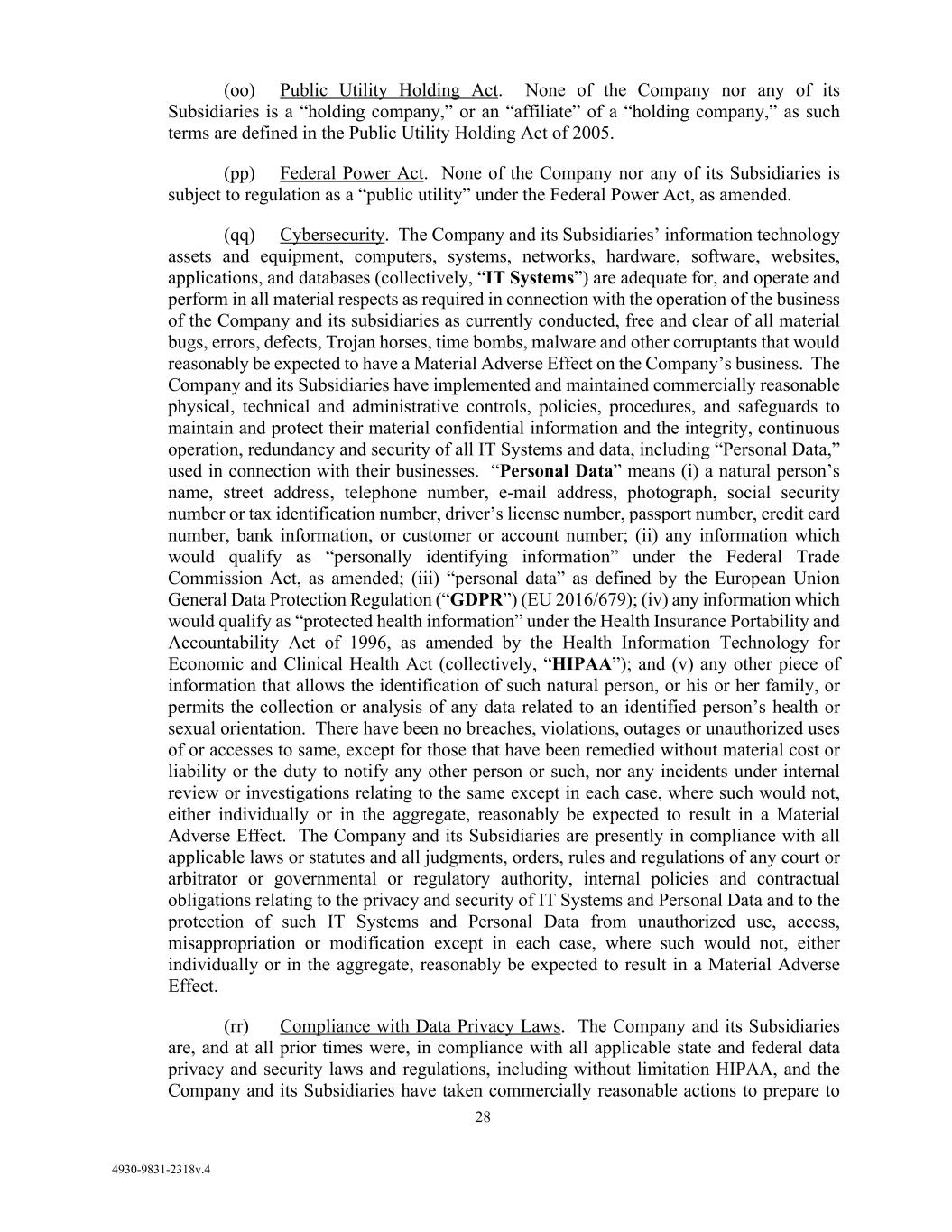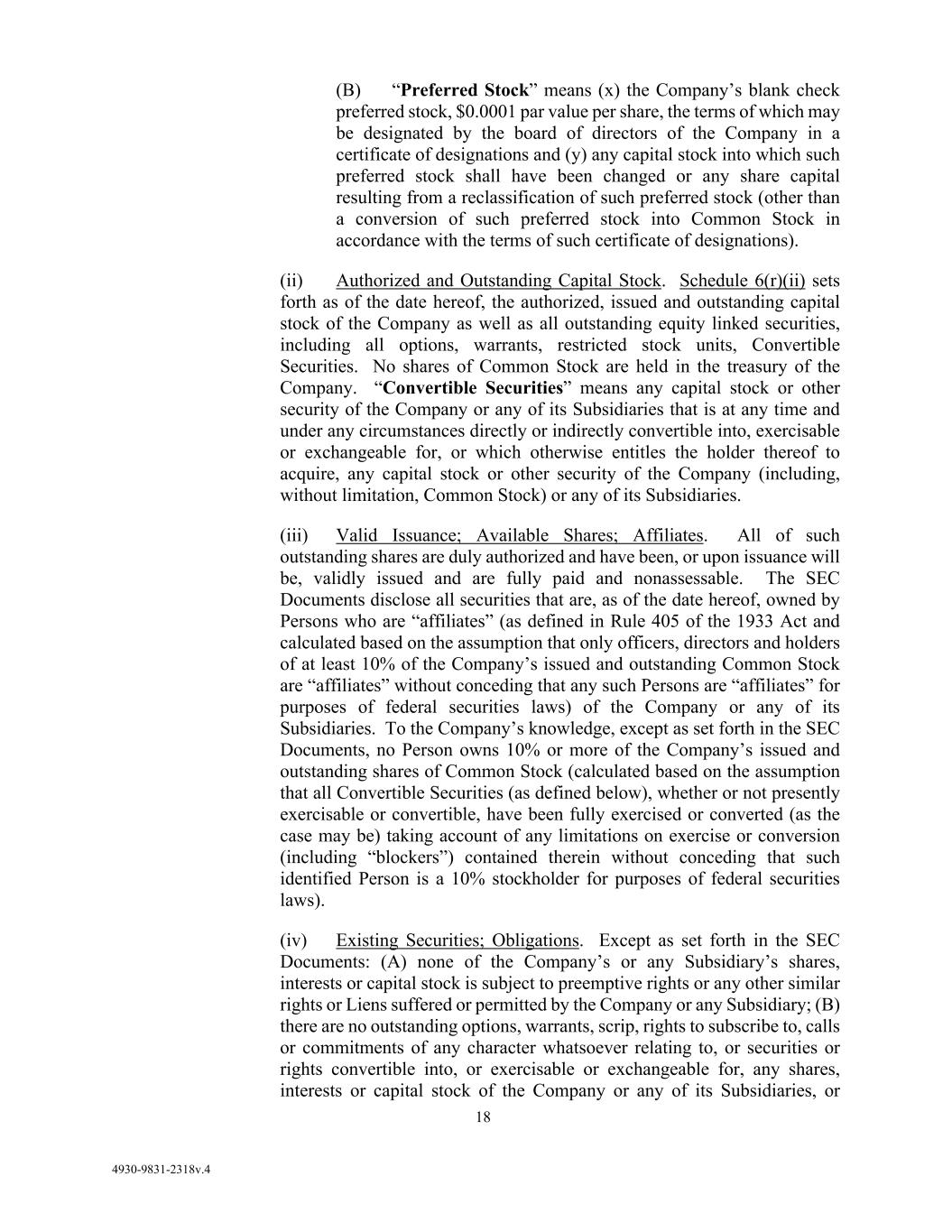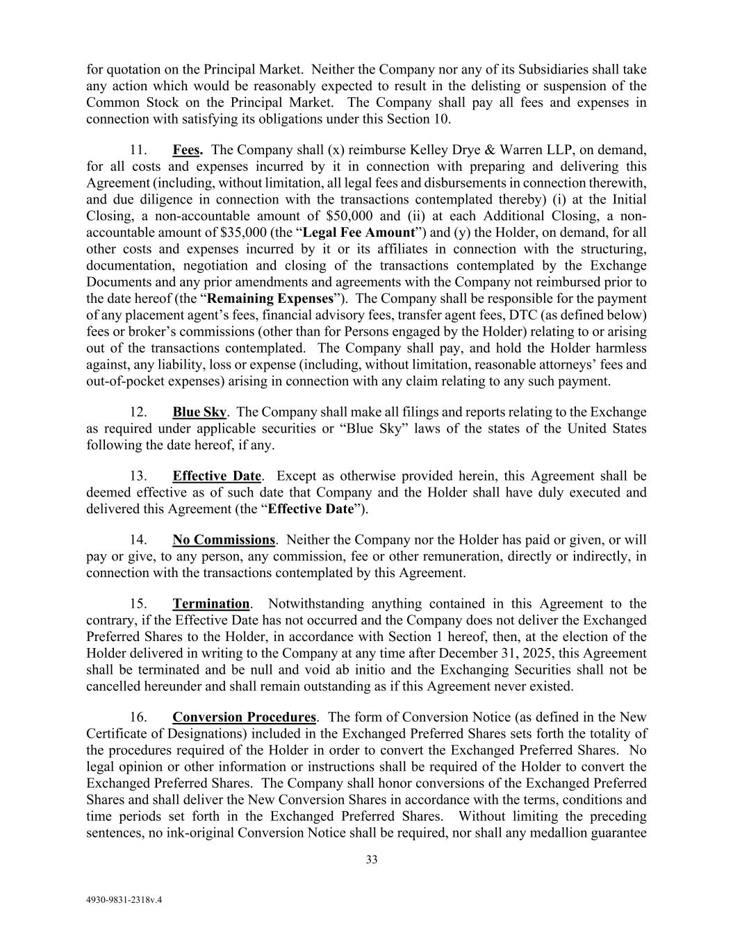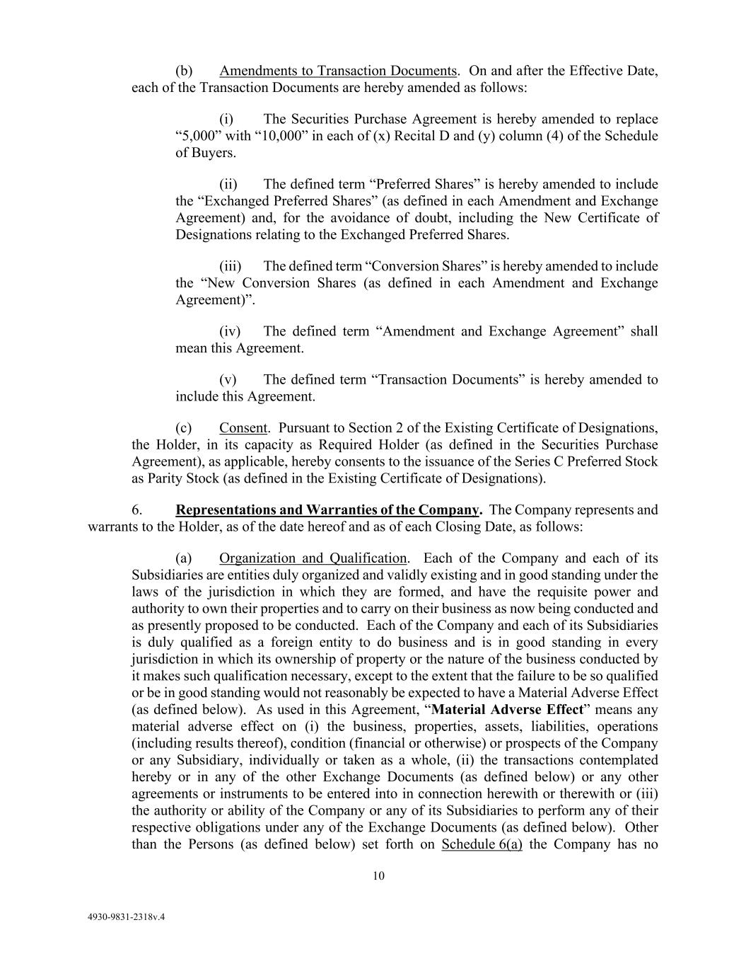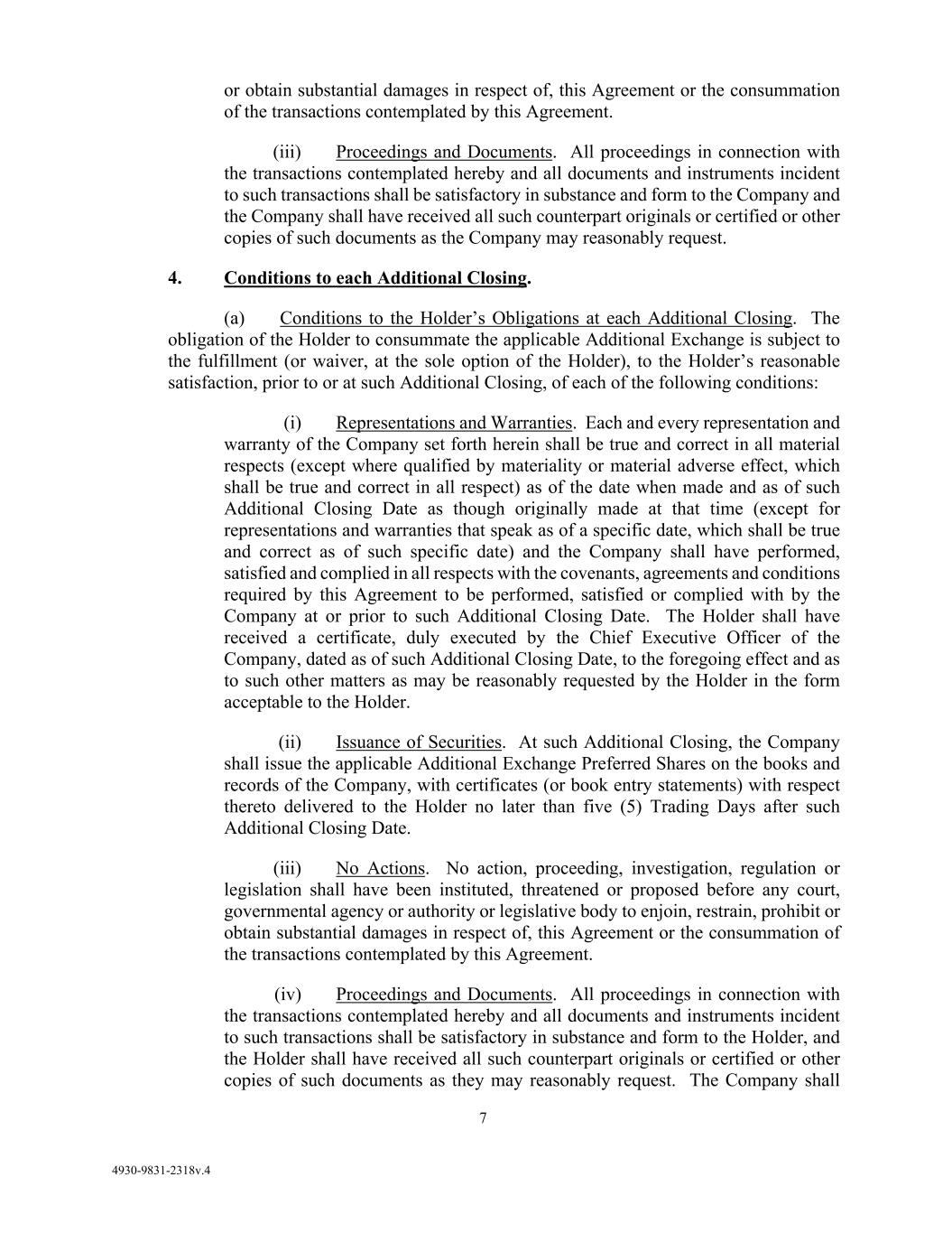 11 4937-6337-7752v.6 beneficially own, in the aggregate, more than the Maximum Percentage of the number of outstanding shares of Common Stock (as determined under Section 13(d) of the 1934 Act), the number of shares so issued by which such Holder’s and the other Attribution Parties’ aggregate beneficial ownership exceeds the Maximum Percentage (the “Excess Shares”) shall be deemed null and void and shall be cancelled ab initio, and such Holder shall not have the power to vote or to transfer the Excess Shares. Upon delivery of a written notice to the Company, any Holder may from time to time increase (with such increase not effective until the sixty-first (61st) day after delivery of such notice) or decrease the Maximum Percentage of such Holder to any other percentage not in excess of 9.99% as specified in such notice; provided that (i) any such increase in the Maximum Percentage will not be effective until the sixty-first (61st) day after such notice is delivered to the Company and (ii) any such increase or decrease will apply only to such Holder and the other Attribution Parties and not to any other Holder that is not an Attribution Party of such Holder. For purposes of clarity, the shares of Common Stock issuable to a Holder pursuant to the terms of this Certificate of Designations in excess of the Maximum Percentage shall not be deemed to be beneficially owned by such Holder for any purpose including for purposes of Section 13(d) or Rule 16a-1(a)(1) of the 1934 Act. No prior inability to convert such Preferred Shares pursuant to this paragraph shall have any effect on the applicability of the provisions of this paragraph with respect to any subsequent determination of convertibility. The provisions of this paragraph shall not be construed and implemented in a manner otherwise than in strict conformity with the terms of this Section 4(d)(i) to the extent necessary to correct this paragraph (or any portion of this paragraph) which may be defective or inconsistent with the intended beneficial ownership limitation contained in this Section 4(d)(i) or to make changes or supplements necessary or desirable to properly give effect to such limitation. The limitation contained in this paragraph may not be amended, modified or waived and shall apply to a successor holder of such Preferred Shares. (ii) Principal Market Regulation. The Company shall not issue any shares of Common Stock upon conversion of any Preferred Shares or otherwise pursuant to the terms of this Certificate of Designations if the issuance of such shares of Common Stock would exceed the aggregate number of shares of Common Stock which the Company may issue upon conversion of the Preferred Shares without breaching the Company’s obligations under the rules and regulations the listing rules of the Principal Market (the maximum number of shares of Common Stock which may be issued without violating such rules and regulations, the “Exchange Cap”), except that such limitation shall not apply in the event that the Company obtains the approval of its stockholders as required by the applicable rules and regulations of the Principal Market for issuances of shares of Common Stock in excess of such amount. Until such approval is obtained, no Holder shall be issued in the aggregate, upon conversion of any Preferred Shares, shares of Common Stock in an amount greater than the product of (i) the Exchange Cap as of the Initial Issuance Date multiplied by (ii) the quotient of (1) the aggregate number of Preferred Shares issued to such Holder on the Initial Issuance Date, divided by (2)
