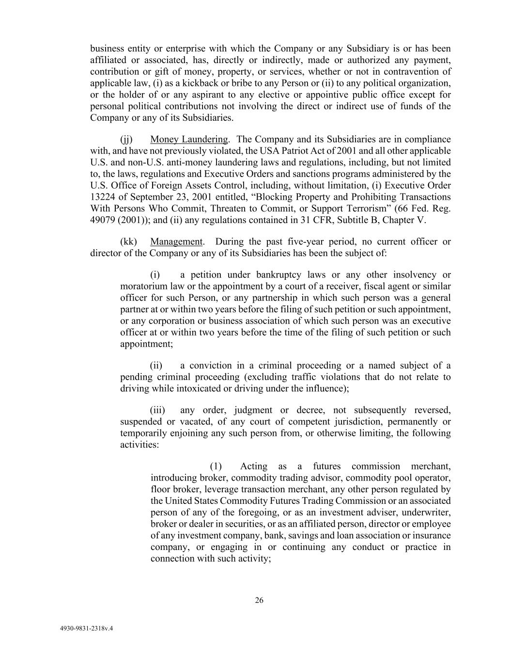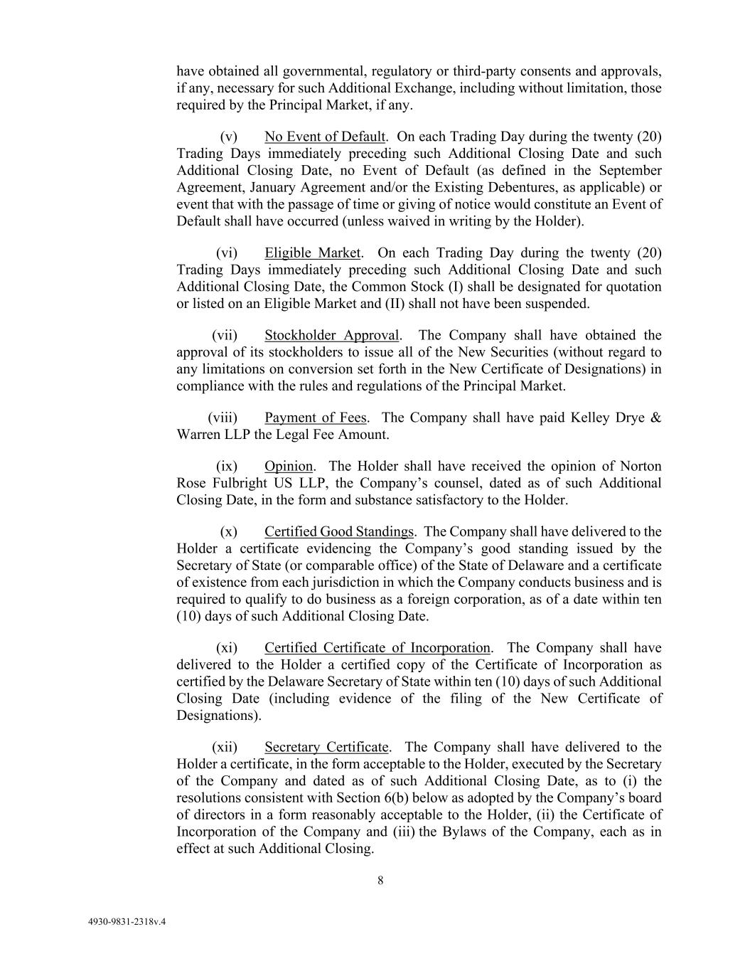 51 4937-6337-7752v.6 not have been suspended from trading on an Eligible Market (other than suspensions of not more than two (2) days and occurring prior to the applicable date of determination due to business announcements by the Company) nor shall delisting or suspension by an Eligible Market have been threatened (with a reasonable prospect of delisting occurring after giving effect to all applicable notice, appeal, compliance and hearing periods) or reasonably likely to occur or pending as evidenced by (A) a writing by such Eligible Market or (B) the Company falling below the minimum listing maintenance requirements of the Eligible Market on which the Common Stock is then listed or designated for quotation, as applicable; (iii) during the Equity Conditions Measuring Period, the Company shall have delivered all shares of Common Stock issuable upon conversion of the Preferred Shares on a timely basis as set forth in Section 4 hereof and all other shares of capital stock required to be delivered by the Company on a timely basis as set forth in the other Transaction Documents; (iv) any shares of Common Stock to be issued in connection with the event requiring determination may be issued in full without violating Section 4(d) hereof; (v) any shares of Common Stock to be issued in connection with the event requiring determination may be issued in full without violating the rules or regulations of the Eligible Market on which the Common Stock is then listed or designated for quotation (as applicable); (vi) on each day during the Equity Conditions Measuring Period, no public announcement of a pending, proposed or intended Fundamental Transaction shall have occurred which has not been abandoned, terminated or consummated; (vii) the Company shall have no knowledge of any fact that would reasonably be expected to cause the applicable Required Minimum Securities Amount of shares of Common Stock issuable in connection with the event requiring such determination to not be eligible for sale pursuant to Rule 144 without the need for registration under any applicable federal or state securities laws (in each case, disregarding any limitation on conversion of the Preferred Shares, other issuance of securities with respect to the Preferred Shares), (viii) none of the Holders shall be in possession of any material, non-public information provided to any of them by the Company, any of its Subsidiaries or any of their respective affiliates, employees, officers, representatives, agents or the like; (ix) on each day during the Equity Conditions Measuring Period, the Company otherwise shall have been in compliance with each, and shall not have breached any representation or warranty in any material respect (other than representations or warranties subject to material adverse effect or materiality, which may not be breached in any respect) or any covenant or other term or condition of any Transaction Document, including, without limitation, the Company shall not have failed to timely make any payment pursuant to any Transaction Document; (x) on each Trading Day during the Equity Conditions Measuring Period, there shall not have occurred any Volume Failure or Price Failure as of such applicable date of determination; (xi) on the applicable date of determination (A) no Authorized Share Failure shall exist or be continuing and the applicable Required Minimum Securities Amount of shares of Common Stock are available under the certificate of incorporation of the Company and reserved by the Company to be issued pursuant to this Certificate of Designations and (B) all shares of Common Stock to be issued in connection with the event requiring this determination may be issued in full without resulting in an Authorized Share Failure; (xii) on each day during the Equity Conditions Measuring Period, there shall not have occurred and there shall not exist a Triggering Event or an event that with the passage of time or giving of notice would constitute a Triggering Event; or (xiii) the shares of Common Stock issuable pursuant to