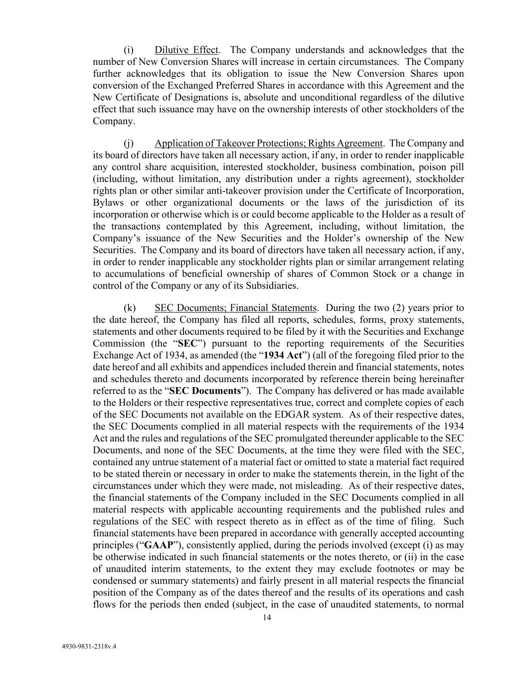22 4937-6337-7752v.6 shares of Common Stock had such shares of Common Stock been held by such Holder upon the consummation of such Corporate Event (without taking into account any limitations or restrictions on the convertibility of the Preferred Shares set forth in this Certificate of Designations) or (ii) in lieu of the shares of Common Stock otherwise receivable upon such conversion, such securities or other assets received by the holders of shares of Common Stock in connection with the consummation of such Corporate Event in such amounts as such Holder would have been entitled to receive had the Preferred Shares held by such Holder initially been issued with conversion rights for the form of such consideration (as opposed to shares of Common Stock) at a conversion rate for such consideration commensurate with the Conversion Rate of an Alternate Conversion. Provision made pursuant the preceding sentence shall be in a form and substance reasonably satisfactory to the Required Holders. The provisions of this Section 7 shall apply similarly and equally to successive Corporate Events and shall be applied without regard to any limitations on the conversion or redemption of the Preferred Shares set forth in this Certificate of Designations. 8. Rights Upon Issuance of Other Securities. (a) Adjustment of Conversion Price upon Issuance of Common Stock. If and whenever on or after the Exchange Date the Company grants, issues or sells (or enters into any agreement to grant, issue or sell), or in accordance with this Section 8(a) is deemed to have granted, issued or sold, any shares of Common Stock (including the granting, issuance or sale of shares of Common Stock owned or held by or for the account of the Company, but excluding any Excluded Securities granted, issued or sold or deemed to have been granted, issued or sold) for a consideration per share (the “New Issuance Price”) less than a price equal to the Conversion Price in effect immediately prior to such granting, issuance or sale or deemed granting, issuance or sale (such Conversion Price then in effect is referred to herein as the “Applicable Price”) (the foregoing a “Dilutive Issuance”), then, immediately after such Dilutive Issuance, the Conversion Price then in effect shall be reduced to an amount equal to the New Issuance Price. For all purposes of the foregoing (including, without limitation, determining the adjusted Conversion Price and the New Issuance Price under this Section 8(a)), the following shall be applicable: (i) Issuance of Options. If the Company in any manner grants, issues or sells (or enters into any agreement to grant, issue or sell) any Options and the lowest price per share for which one share of Common Stock is at any time issuable upon the exercise of any such Option or upon conversion, exercise or exchange of any Convertible Securities issuable upon exercise of any such Option or otherwise pursuant to the terms thereof is less than the Applicable Price, then such share of Common Stock shall be deemed to be outstanding and to have been issued and sold by the Company at the time of the granting, issuance or sale of such Option for such price per share. For purposes of this Section 8(a)(i), the “lowest price per share for which one share of Common Stock is at any time issuable upon the exercise of any such Option or upon conversion, exercise or exchange of any Convertible Securities issuable upon exercise of any such Option or otherwise pursuant to the terms thereof” shall be equal to (1) the lower of (x) the sum of the lowest amounts of