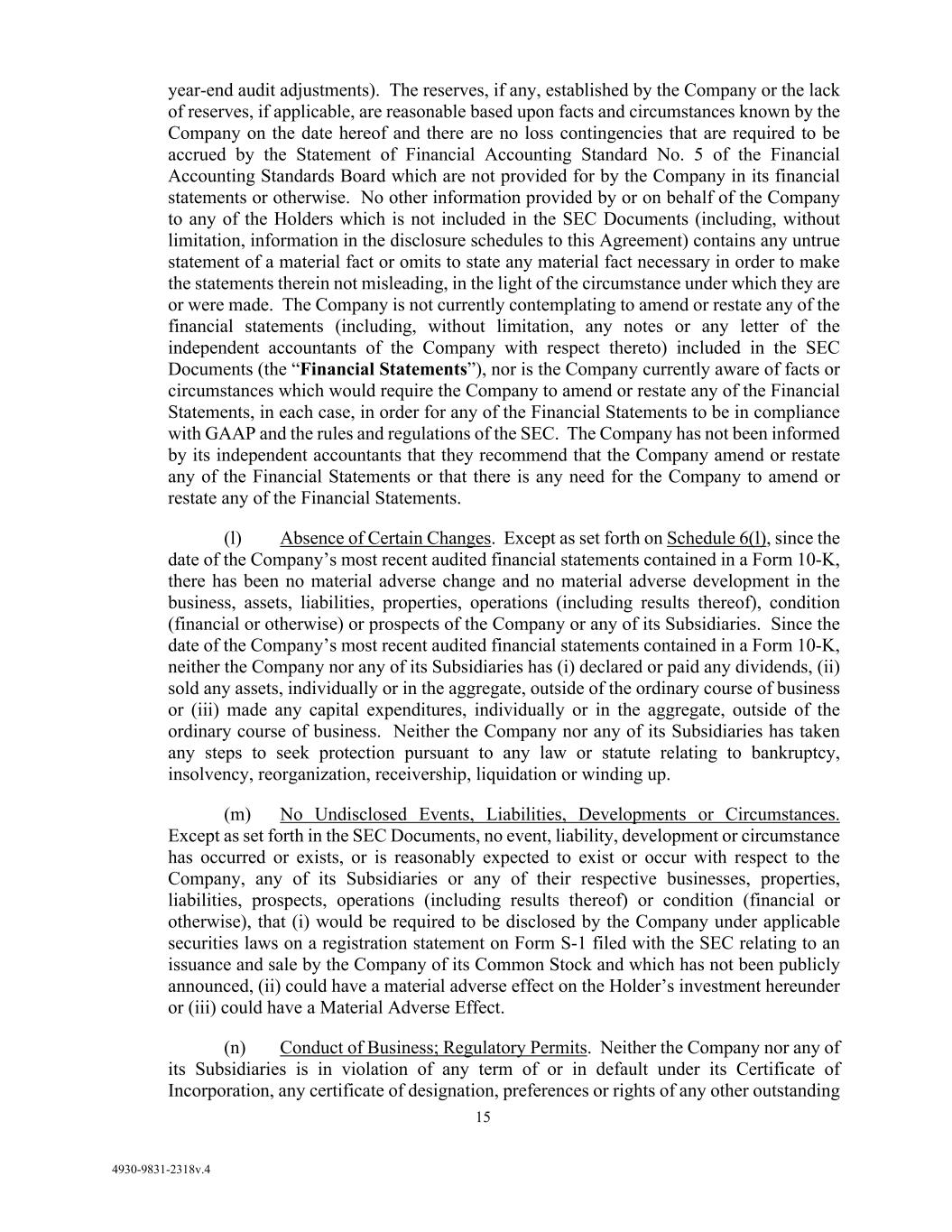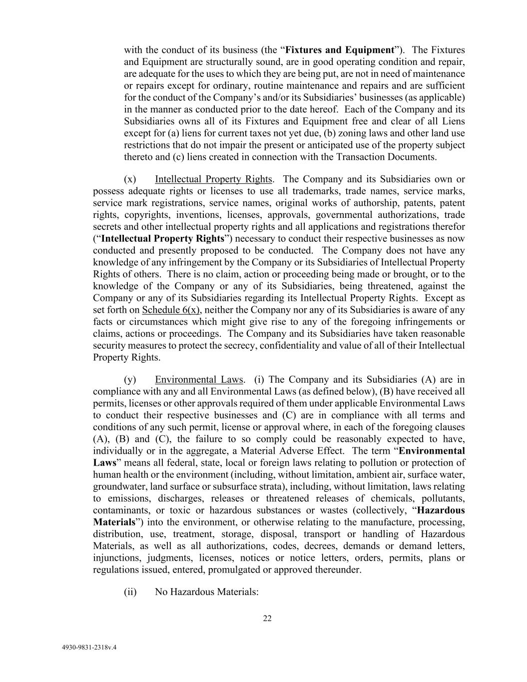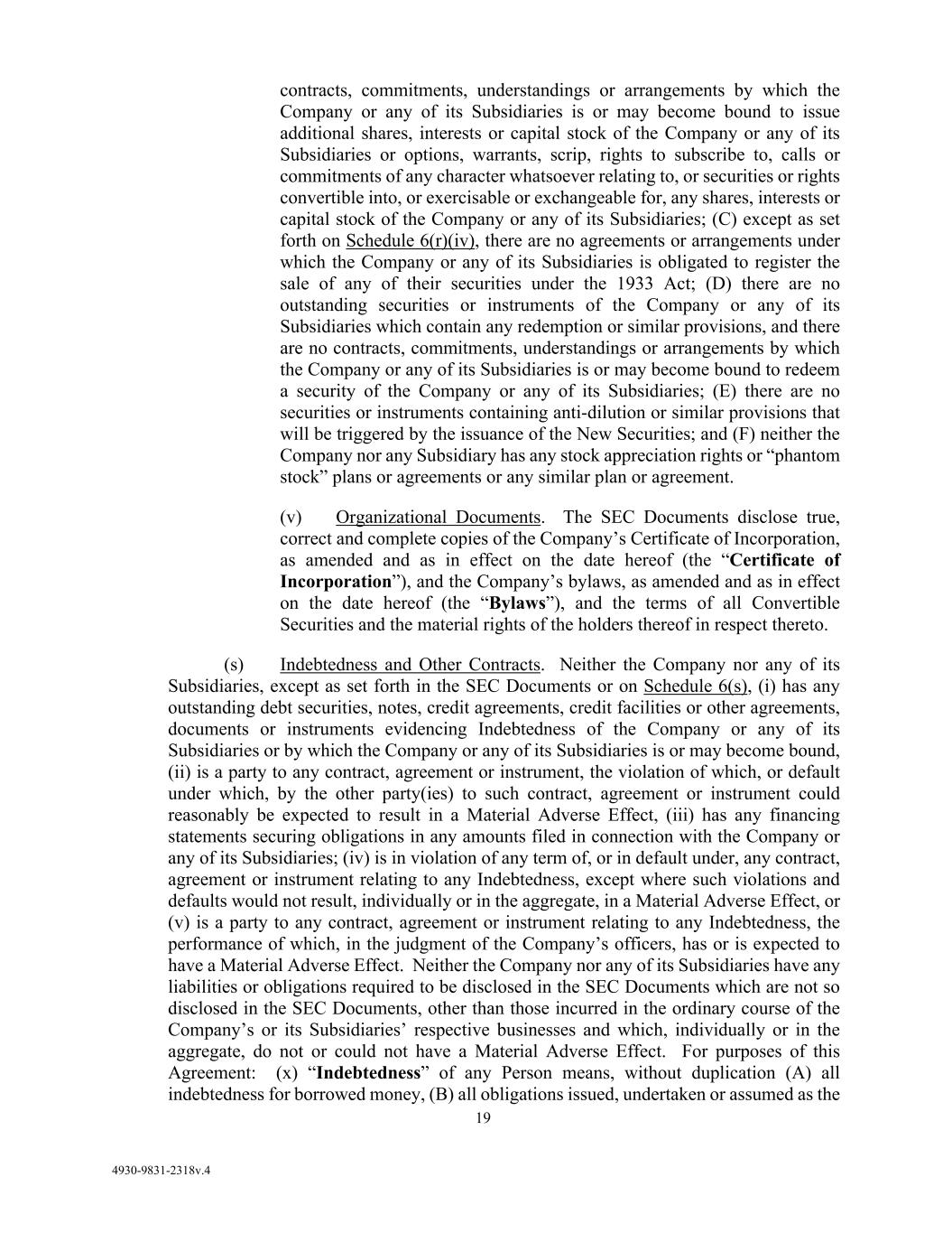 55 4937-6337-7752v.6 instruments, (D) all obligations evidenced by notes, bonds, debentures or similar instruments, including obligations so evidenced incurred in connection with the acquisition of property, assets or businesses, (E) all indebtedness created or arising under any conditional sale or other title retention agreement, or incurred as financing, in either case with respect to any property or assets acquired with the proceeds of such indebtedness (even though the rights and remedies of the seller or bank under such agreement in the event of default are limited to repossession or sale of such property), (F) all monetary obligations under any leasing or similar arrangement which, in connection with United States generally accepted accounting principles, consistently applied for the periods covered thereby, is classified as a capital lease, (G) all indebtedness referred to in clauses (A) through (F) above secured by (or for which the holder of such Indebtedness has an existing right, contingent or otherwise, to be secured by) any mortgage, deed of trust, lien, pledge, charge, security interest or other encumbrance of any nature whatsoever in or upon any property or assets (including accounts and contract rights) with respect to any asset or property owned by any Person, even though the Person which owns such assets or property has not assumed or become liable for the payment of such indebtedness, and (H) all Contingent Obligations in respect of indebtedness or obligations of others of the kinds referred to in clauses (A) through (G) above. (nn) “Intellectual Property Rights” means, with respect to the Company and its Subsidiaries, all of their rights or licenses to use all trademarks, trade names, service marks, service mark registrations, service names, original works of authorship, patents, patent rights, copyrights, inventions, licenses, approvals, governmental authorizations, trade secrets and other intellectual property rights and all applications and registrations therefor. (oo) “Investment” means any beneficial ownership (including stock, partnership or limited liability company interests) of or in any Person, or any loan, advance or capital contribution to any Person or the acquisition of all, or substantially all, of the assets of another Person or the purchase of any assets of another Person for greater than the fair market value of such assets. (pp) “Liquidation Event” means, whether in a single transaction or series of transactions, the voluntary or involuntary liquidation, dissolution or winding up of the Company or such Subsidiaries the assets of which constitute all or substantially all of the assets of the business of the Company and its Subsidiaries, taken as a whole. (qq) “Market Price” means, with respect to any Adjustment Date, the Closing Bid Price of the Common Stock as of the Trading Day ended immediately prior to such applicable Adjustment Date. (rr) “Material Adverse Effect” means any material adverse effect on the business, properties, assets, liabilities, operations, results of operations, condition (financial or otherwise) or prospects of the Company and its Subsidiaries, if any, individually or taken as a whole, or on the transactions contemplated hereby or on the other Transaction Documents (as defined below), or by the agreements and instruments to be