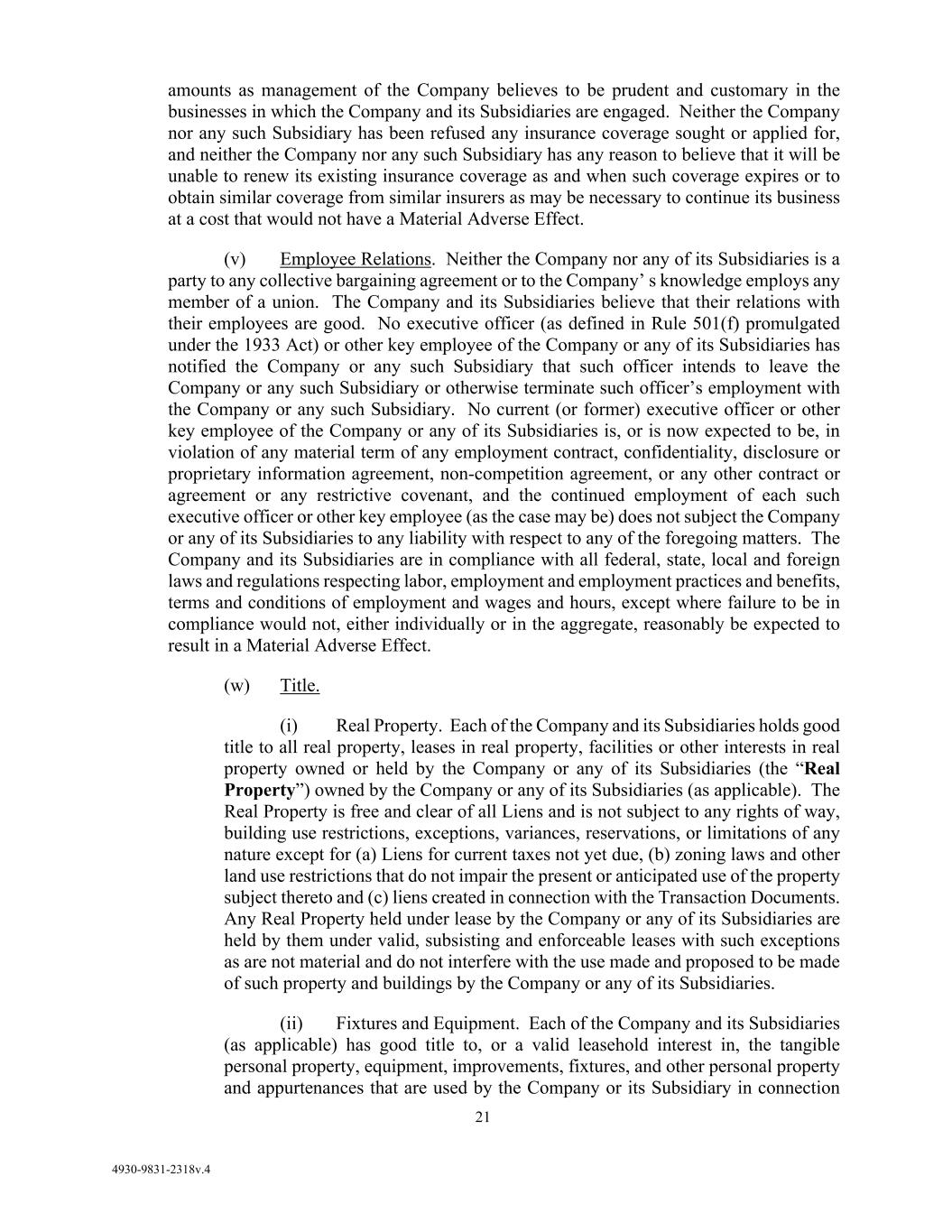 32 4937-6337-7752v.6 necessary, except where the failure to become or remain duly qualified or in good standing could not reasonably be expected to result in a Material Adverse Effect. (h) Maintenance of Properties, Etc. The Company shall maintain and preserve, and cause each of its Subsidiaries to maintain and preserve, all of its material properties which are necessary or useful in the proper conduct of its business in good working order and condition, ordinary wear and tear excepted, and comply, and cause each of its Subsidiaries to materially comply, at all times with the provisions of all leases to which it is a party as lessee or under which it occupies property, so as to prevent any loss or forfeiture thereof or thereunder. (i) Maintenance of Intellectual Property. The Company will, and will cause each of its Subsidiaries to, take all action necessary or advisable to maintain all of the Intellectual Property Rights of the Company and/or any of its Subsidiaries that are necessary or material to the conduct of its business in full force and effect. (j) Maintenance of Insurance. The Company shall maintain, and cause each of its Subsidiaries to maintain, insurance with responsible and reputable insurance companies or associations (including, without limitation, comprehensive general liability, hazard, rent and business interruption insurance) with respect to its properties (including all real properties leased or owned by it) and business, in such amounts and covering such risks as is required by any Governmental Authority having jurisdiction with respect thereto or as is carried generally in accordance with sound business practice by companies in similar businesses similarly situated. (k) Transactions with Affiliates. The Company shall not, nor shall it permit any of its Subsidiaries to, enter into, renew, extend or be a party to, any transaction or series of related transactions (including, without limitation, the purchase, sale, lease, transfer or exchange of property or assets of any kind or the rendering of services of any kind) with any affiliate, except transactions in the ordinary course of business in a manner and to an extent consistent with past practice and necessary or desirable for the prudent operation of its business, for fair consideration and on terms no less favorable to it or its Subsidiaries than would be obtainable in a comparable arm’s length transaction with a Person that is not an affiliate thereof. (l) Restricted Issuances. The Company shall not, directly or indirectly, without the prior written consent of the Required Holders, (i) issue any Preferred Shares (other than as contemplated by the Exchange Agreement and this Certificate of Designations), (ii) issue any other securities that would cause a breach or default under this Certificate of Designations or (iii) issue any securities at a New Issuance Price less than the Floor Price then in effect. (m) Stay, Extension and Usury Laws. To the extent that it may lawfully do so, the Company (A) agrees that it will not at any time insist upon, plead, or in any manner whatsoever claim or take the benefit or advantage of, any stay, extension or usury law (wherever or whenever enacted or in force) that may affect the covenants or the