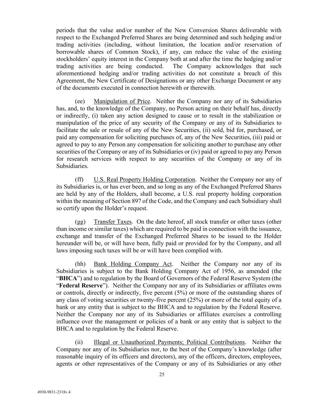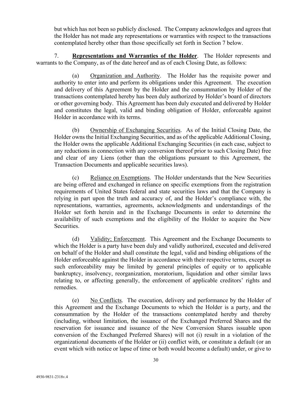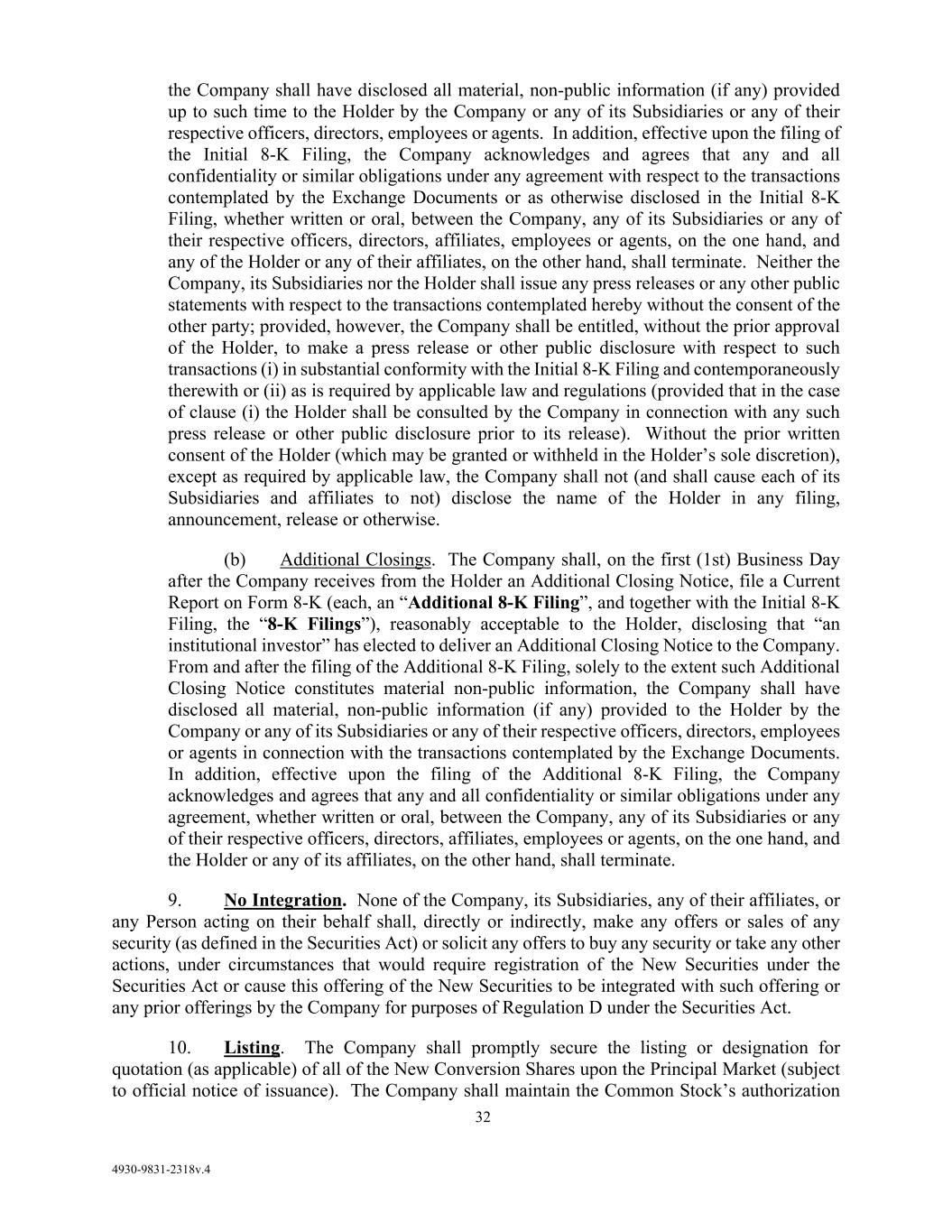 59 4937-6337-7752v.6 York time, as reported by Bloomberg, or, if no dollar volume-weighted average price is reported for such security by Bloomberg for such hours, the average of the highest closing bid price and the lowest closing ask price of any of the market makers for such security as reported in The Pink Open Market (or a similar organization or agency succeeding to its functions of reporting prices). If the VWAP cannot be calculated for such security on such date on any of the foregoing bases, the VWAP of such security on such date shall be the fair market value as mutually determined by the Company and the Required Holders. If the Company and the Required Holders are unable to agree upon the fair market value of such security, then such dispute shall be resolved in accordance with the procedures in Section 23. All such determinations shall be appropriately adjusted for any stock dividend, stock split, stock combination, recapitalization or other similar transaction during such period. 33. Disclosure. Upon receipt or delivery by the Company of any notice in accordance with the terms of this Certificate of Designations, unless the Company has in good faith determined that the matters relating to such notice do not constitute material, non-public information relating to the Company or any of its Subsidiaries, the Company shall on or prior to 9:00 am, New York city time on the Business Day immediately following such notice delivery date, publicly disclose such material, non-public information on a Current Report on Form 8-K or otherwise. In the event that the Company believes that a notice contains material, non-public information relating to the Company or any of its Subsidiaries, the Company so shall indicate to the applicable Holder explicitly in writing in such notice (or promptly (but no later than the next Business Day) following receipt of notice from such Holder, as applicable), and in the absence of any such written indication in such notice (or notification from the Company promptly (but no later than the next Business Day) following receipt of notice from such Holder), such Holder shall be entitled to presume that information contained in the notice does not constitute material, non-public information relating to the Company or any of its Subsidiaries. Nothing contained in this Section 33 shall limit any obligations of the Company, or any rights of any Holder, under Section 8 of the Exchange Agreement. 34. Absence of Trading and Disclosure Restrictions. The Company acknowledges and agrees that no Holder is a fiduciary or agent of the Company and that each Holder shall have no obligation to (a) maintain the confidentiality of any information provided by the Company or (b) refrain from trading any securities while in possession of such information in the absence of a written non-disclosure agreement signed by an officer of such Holder that explicitly provides for such confidentiality and trading restrictions. In the absence of such an executed, written non- disclosure agreement, the Company acknowledges that each Holder may freely trade in any securities issued by the Company, may possess and use any information provided by the Company in connection with such trading activity, and may disclose any such information to any third party. [The remainder of the page is intentionally left blank.]