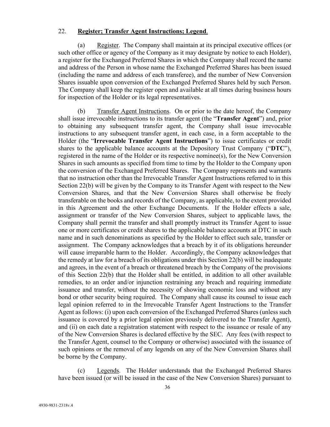 8 4937-6337-7752v.6 Certificates or in Book-Entry form (the “Registered Preferred Shares”). The entries in the Register shall be conclusive and binding for all purposes absent manifest error. The Company and each Holder of the Preferred Shares shall treat each Person whose name is recorded in the Register as the owner of a Preferred Share for all purposes (including, without limitation, the right to receive payments and Dividends hereunder) notwithstanding notice to the contrary. A Registered Preferred Share may be assigned, transferred or sold only by registration of such assignment or sale on the Register. Upon its receipt of a written request to assign, transfer or sell one or more Registered Preferred Shares by such Holder thereof, the Company shall record the information contained therein in the Register and issue one or more new Registered Preferred Shares in the same aggregate Stated Value as the Stated Value of the surrendered Registered Preferred Shares to the designated assignee or transferee pursuant to Section 18, provided that if the Company does not so record an assignment, transfer or sale (as the case may be) of such Registered Preferred Shares within one (1) Business Day of such a request, then the Register shall be automatically deemed updated to reflect such assignment, transfer or sale (as the case may be). Notwithstanding anything to the contrary set forth in this Section 4, following conversion of any Preferred Shares in accordance with the terms hereof, the applicable Holder shall not be required to physically surrender such Preferred Shares held in the form of a Preferred Share Certificate to the Company unless (A) the full or remaining number of Preferred Shares represented by the applicable Preferred Share Certificate are being converted (in which event such certificate(s) shall be delivered to the Company as contemplated by this Section 4(c)(iii)) or (B) such Holder has provided the Company with prior written notice (which notice may be included in a Conversion Notice) requesting reissuance of Preferred Shares upon physical surrender of the applicable Preferred Share Certificate. Each Holder and the Company shall maintain records showing the Stated Value and Dividends converted and/or paid (as the case may be) and the dates of such conversions and/or payments (as the case may be) or shall use such other method, reasonably satisfactory to such Holder and the Company, so as not to require physical surrender of a Preferred Share Certificate upon conversion. If the Company does not update the Register to record such Stated Value and Dividends converted and/or paid (as the case may be) and the dates of such conversions and/or payments (as the case may be) within one (1) Business Day of such occurrence, then the Register shall be automatically deemed updated to reflect such occurrence. In the event of any dispute or discrepancy, the records of the Company establishing the number of Preferred Shares to which the record holder is entitled shall be controlling and determinative in the absence of manifest error. A Holder and any transferee or assignee, by acceptance of a certificate, acknowledge and agree that, by reason of the provisions of this paragraph, following conversion of any Preferred Shares, the number of Preferred Shares represented by such certificate may be less than the number of Preferred Shares stated on the face thereof. Each Preferred Share Certificate shall bear the following legend: ANY TRANSFEREE OR ASSIGNEE OF THIS
