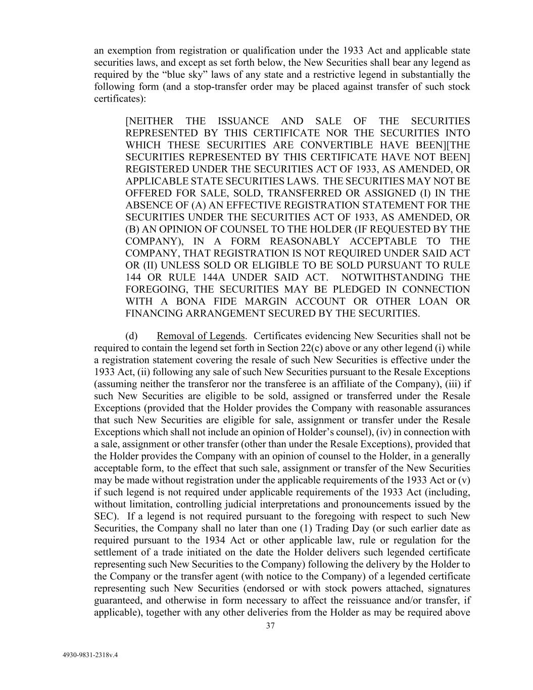 5 4937-6337-7752v.6 Stock may then be resold pursuant to Rule 144 or Section 4(a)(1) of the 1933 Act or an effective and available registration statement, in the form attached hereto as Exhibit II, of receipt of such Conversion Notice to such Holder and the Transfer Agent, which confirmation shall constitute an instruction to the Transfer Agent to process such Conversion Notice in accordance with the terms set forth herein. On or before the first (1st) Trading Day following each date on which the Company has received a Conversion Notice (or such earlier date as required pursuant to the 1934 Act or other applicable law, rule or regulation for the settlement of a trade initiated on the applicable Conversion Date of such Conversion Shares issuable pursuant to such Conversion Notice) (the “Share Delivery Deadline”), the Company shall (1) provided that the Transfer Agent is participating in the Depository Trust Company (“DTC”) Fast Automated Securities Transfer Program (“FAST”) and such shares of Common Stock (i) (A) may then be sold by the applicable Holder pursuant to an available and effective registration statement and (B) such Holder provides such documentation or other information evidencing the sale of the shares of Common Stock as the Company, the Transfer Agent or legal counsel to the Company shall reasonably request (which, for the avoidance of doubt, shall not include the requirement of a medallion guarantee or a legal opinion) or (ii) may be sold by such Holder pursuant to Rule 144 of the 1933 Act, as applicable, including the requirements under Rule 144(i) or Section 4(a)(1) of the 1933 Act (the “Resale Eligibility Conditions”), credit such aggregate number of Conversion Shares to which such Holder shall be entitled pursuant to such conversion to such Holder’s or its designee’s balance account with DTC through its Deposit/Withdrawal at Custodian system, or (2) if the Transfer Agent is not participating in FAST or the Resale Eligibility Conditions are not satisfied, upon the request of such Holder, issue and deliver (via reputable overnight courier) to the address as specified in such Conversion Notice, a certificate, registered in the name of such Holder or its designee, for the number of Conversion Shares to which such Holder shall be entitled. If the number of Preferred Shares represented by the Preferred Share Certificate(s) submitted for conversion pursuant to Section 4(c)(ii) is greater than the number of Preferred Shares being converted, then the Company shall, as soon as practicable and in no event later than one (1) Trading Day after receipt of the Preferred Share Certificate(s) and at its own expense, issue and mail to such Holder (or its designee) by overnight courier service a new Preferred Share Certificate or a new Book-Entry (in either case, in accordance with Section 18(d)) representing the number of Preferred Shares not converted. The Person or Persons entitled to receive the Conversion Shares issuable upon a conversion of Preferred Shares shall be treated for all purposes as the record holder or holders of such Conversion Shares on the Conversion Date; provided, that such Person shall be deemed to have waived any voting rights of any such Conversion Shares that may arise during the period commencing on such Conversion Date, through, and including, such