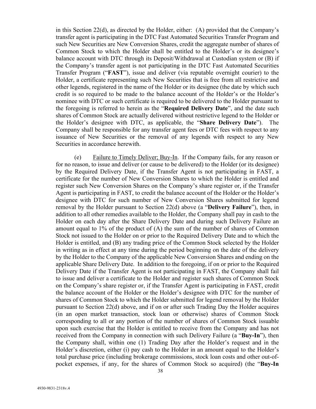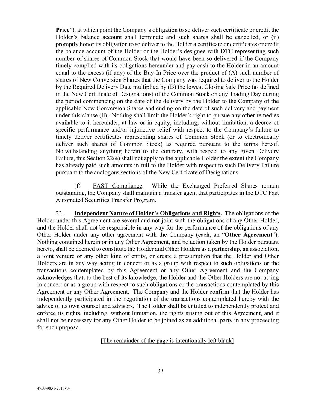 7 4937-6337-7752v.6 the excess (if any) of the Buy-In Price over the product of (x) such number of shares of Common Stock multiplied by (y) the lowest Closing Sale Price of the Common Stock on any Trading Day during the period commencing on the date of the applicable Conversion Notice and ending on the date of such issuance and payment under this clause (II) (each, a “Buy-In Payment Amount”). In addition to the foregoing, if on or prior to the Share Delivery Deadline the Transfer Agent is not participating in FAST or the Resale Eligibility Conditions are not satisfied, the Company shall fail to issue and deliver to such Holder (or its designee) a certificate and register such Conversion Shares on the Company’s share register or, if the Transfer Agent is participating in the FAST and the Resale Eligibility Conditions are satisfied, the Transfer Agent shall fail to credit the balance account of such Holder or such Holder’s designee, as applicable, with DTC for the number of Conversion Shares to which such Holder is entitled upon such Holder’s conversion hereunder or pursuant to the Company’s obligation pursuant to clause (ii) below, then, in addition to all other remedies available to such Holder, (X) the Company shall pay to such Holder, in cash, as liquidated damages and not as a penalty, for each $1,000 of Conversion Amount of the Preferred Shares being converted, $10 per Trading Day (increasing to $20 per Trading Day on the second Trading Day and increasing to $40 per Trading Day on the fifth Trading Day after such damages begin to accrue) for each Trading Day after the Share Delivery Deadline until such Conversion Shares are delivered or Holder rescinds such conversion and (Y) such Holder, upon written notice to the Company, may void its Conversion Notice with respect to, and retain or have returned, as the case may be, all, or any portion, of such Preferred Shares that has not been converted pursuant to such Conversion Notice; provided that the voiding of a Conversion Notice shall not affect the Company’s obligations to make any payments which have accrued prior to the date of such notice pursuant to this Section 4(c)(ii) or otherwise. Nothing herein shall limit a Holder’s right to pursue any other remedies available to it hereunder, at law or in equity, including, without limitation, a decree of specific performance and/or injunctive relief with respect to the Company’s failure to timely deliver certificates representing Conversion Shares (or to electronically deliver such Conversion Shares) upon the conversion of the Preferred Shares as required pursuant to the terms hereof. Notwithstanding anything herein to the contrary, with respect to any given Conversion Failure, this Section 4(c)(ii) shall not apply to a Holder to the extent the Company has already paid such amounts in full to such Holder with respect to such Conversion Failure pursuant to the analogous sections of the Exchange Agreement. (iii) Registration; Book-Entry. At the time of issuance of any Preferred Shares hereunder, the applicable Holder may, by written request (including by electronic-mail) to the Company, elect to receive such Preferred Shares in the form of one or more Preferred Share Certificates or in Book-Entry form. The Company (or the Transfer Agent, as custodian for the Preferred Shares) shall maintain a register (the “Register”) for the recordation of the names and addresses of the Holders of each Preferred Share and the Stated Value of the Preferred Shares and whether the Preferred Shares are held by such Holder in Preferred Share