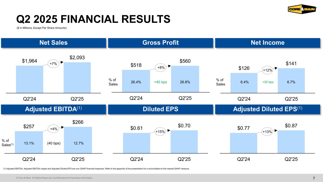 ST. LOUIS, Sept. 9, 2025—Core & Main, Inc. (NYSE: CNM) ("Core & Main"), a leading specialty distributor dedicated to advancing reliable infrastructure with local service, nationwide, today announced financial results for the second quarter ended August 3, 2025.