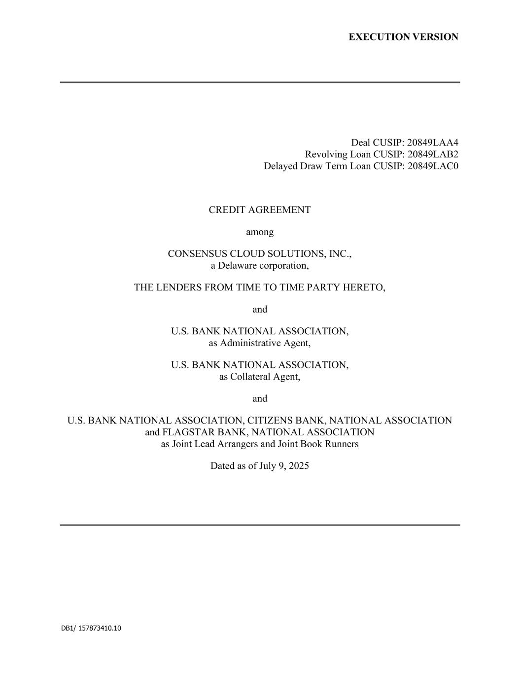DB1/ 157873410.10 EXECUTION VERSION Deal CUSIP: 20849LAA4 Revolving Loan CUSIP: 20849LAB2 Delayed Draw Term Loan CUSIP: 20849LAC0 CREDIT AGREEMENT among CONSENSUS CLOUD SOLUTIONS, INC., a Delaware corporation, THE LENDERS FROM TIME TO TIME PARTY HERETO, and U.S. BANK NATIONAL ASSOCIATION, as Administrative Agent, U.S. BANK NATIONAL ASSOCIATION, as Collateral Agent, and U.S. BANK NATIONAL ASSOCIATION, CITIZENS BANK, NATIONAL ASSOCIATION and FLAGSTAR BANK, NATIONAL ASSOCIATION as Joint Lead Arrangers and Joint Book Runners Dated as of July 9, 2025