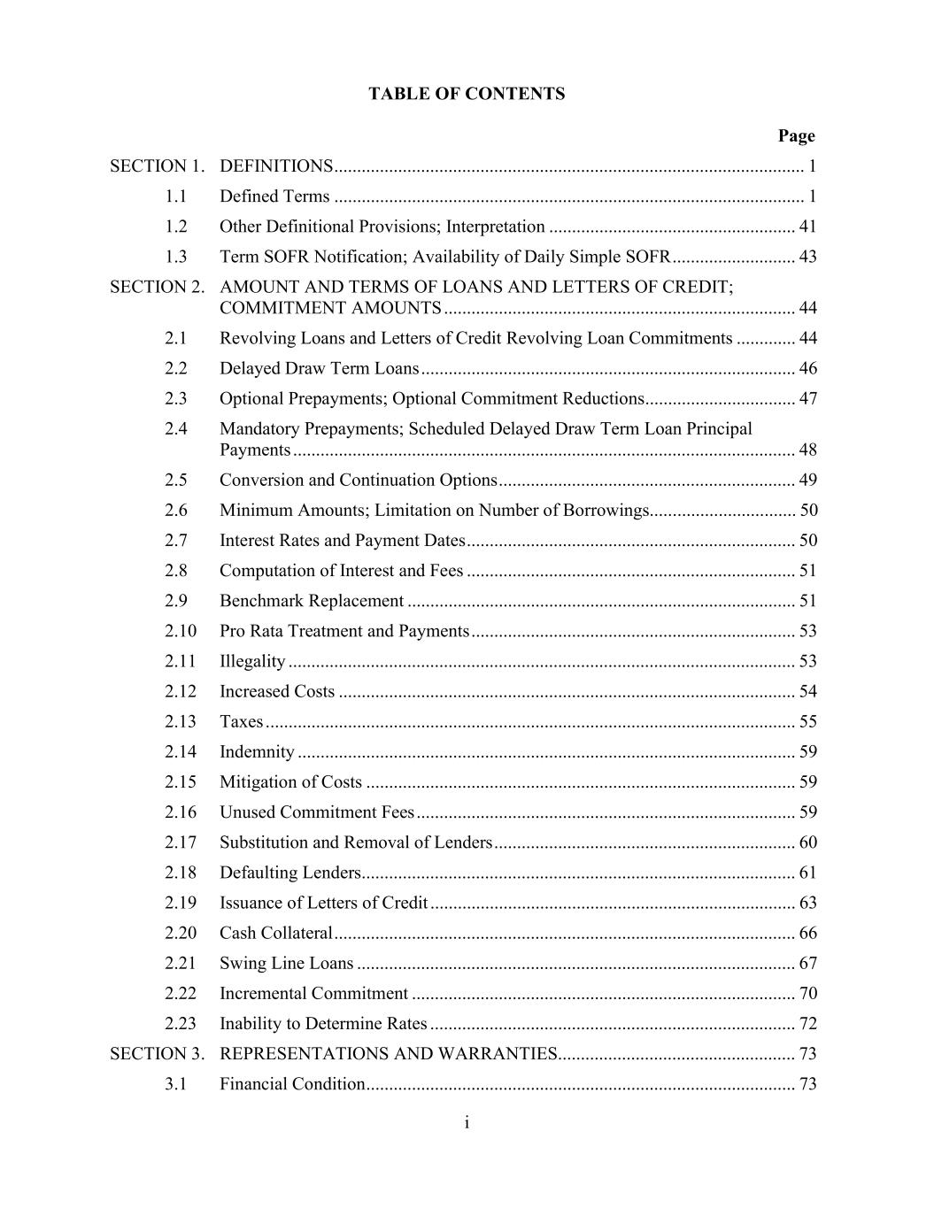 TABLE OF CONTENTS Page i SECTION 1. DEFINITIONS ....................................................................................................... 1 1.1 Defined Terms ....................................................................................................... 1 1.2 Other Definitional Provisions; Interpretation ...................................................... 41 1.3 Term SOFR Notification; Availability of Daily Simple SOFR ........................... 43 SECTION 2. AMOUNT AND TERMS OF LOANS AND LETTERS OF CREDIT; COMMITMENT AMOUNTS ............................................................................. 44 2.1 Revolving Loans and Letters of Credit Revolving Loan Commitments ............. 44 2.2 Delayed Draw Term Loans .................................................................................. 46 2.3 Optional Prepayments; Optional Commitment Reductions ................................. 47 2.4 Mandatory Prepayments; Scheduled Delayed Draw Term Loan Principal Payments .............................................................................................................. 48 2.5 Conversion and Continuation Options ................................................................. 49 2.6 Minimum Amounts; Limitation on Number of Borrowings................................ 50 2.7 Interest Rates and Payment Dates ........................................................................ 50 2.8 Computation of Interest and Fees ........................................................................ 51 2.9 Benchmark Replacement ..................................................................................... 51 2.10 Pro Rata Treatment and Payments ....................................................................... 53 2.11 Illegality ............................................................................................................... 53 2.12 Increased Costs .................................................................................................... 54 2.13 Taxes .................................................................................................................... 55 2.14 Indemnity ............................................................................................................. 59 2.15 Mitigation of Costs .............................................................................................. 59 2.16 Unused Commitment Fees ................................................................................... 59 2.17 Substitution and Removal of Lenders .................................................................. 60 2.18 Defaulting Lenders............................................................................................... 61 2.19 Issuance of Letters of Credit ................................................................................ 63 2.20 Cash Collateral ..................................................................................................... 66 2.21 Swing Line Loans ................................................................................................ 67 2.22 Incremental Commitment .................................................................................... 70 2.23 Inability to Determine Rates ................................................................................ 72 SECTION 3. REPRESENTATIONS AND WARRANTIES.................................................... 73 3.1 Financial Condition .............................................................................................. 73