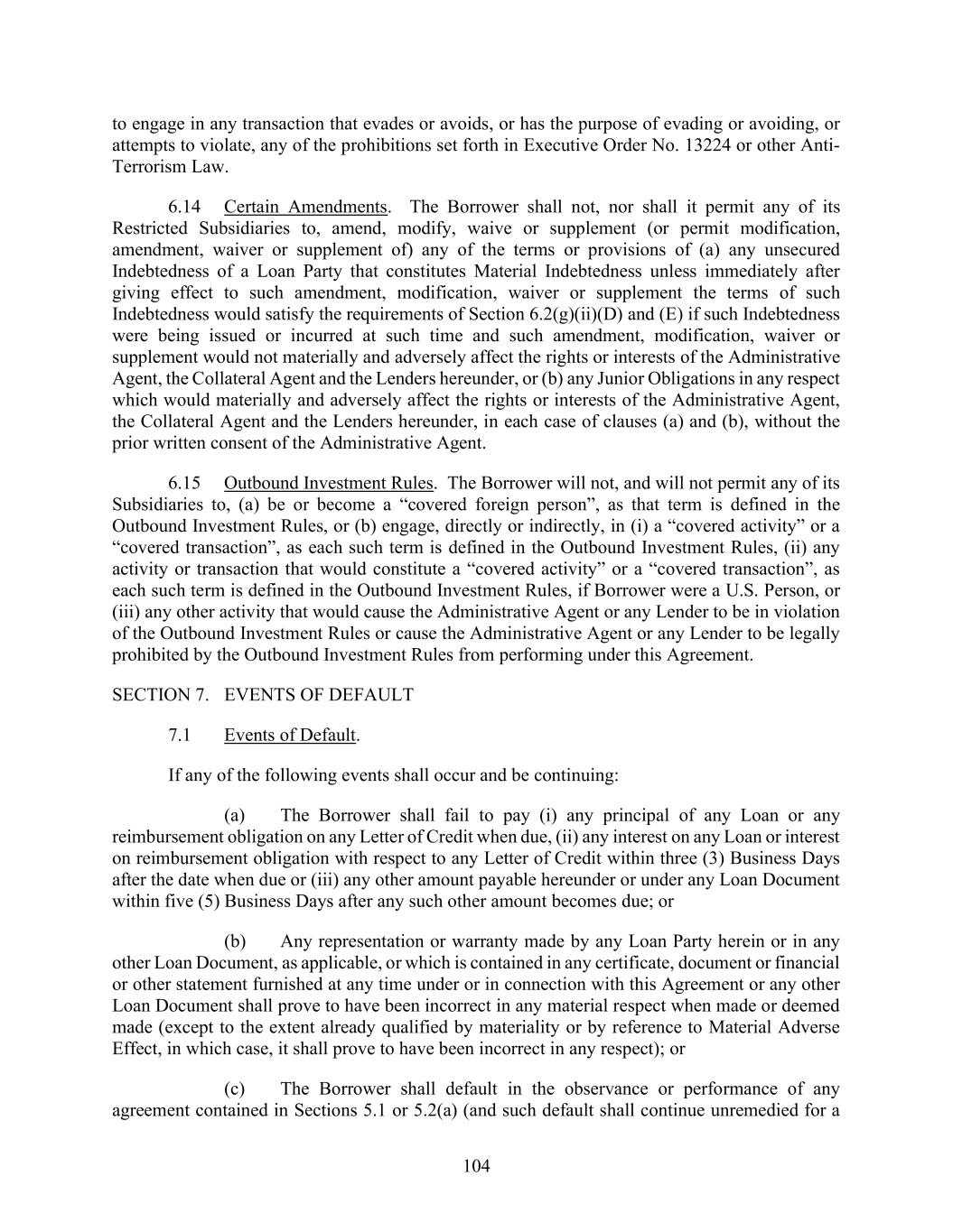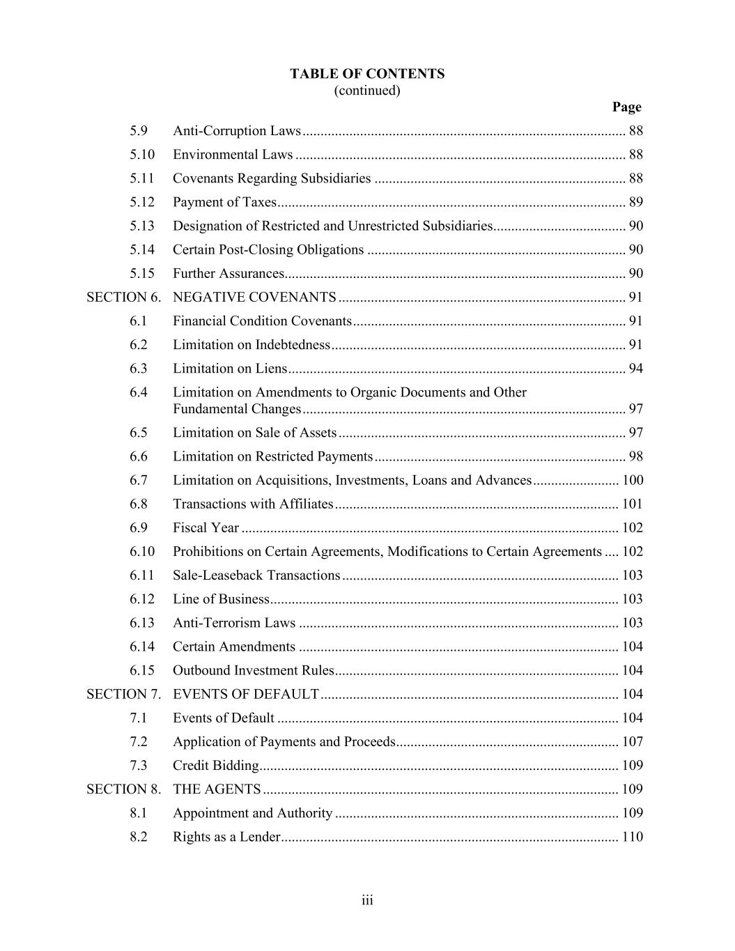 TABLE OF CONTENTS (continued) Page iii 5.9 Anti-Corruption Laws .......................................................................................... 88 5.10 Environmental Laws ............................................................................................ 88 5.11 Covenants Regarding Subsidiaries ...................................................................... 88 5.12 Payment of Taxes ................................................................................................. 89 5.13 Designation of Restricted and Unrestricted Subsidiaries..................................... 90 5.14 Certain Post-Closing Obligations ........................................................................ 90 5.15 Further Assurances............................................................................................... 90 SECTION 6. NEGATIVE COVENANTS ................................................................................ 91 6.1 Financial Condition Covenants ............................................................................ 91 6.2 Limitation on Indebtedness .................................................................................. 91 6.3 Limitation on Liens .............................................................................................. 94 6.4 Limitation on Amendments to Organic Documents and Other Fundamental Changes .......................................................................................... 97 6.5 Limitation on Sale of Assets ................................................................................ 97 6.6 Limitation on Restricted Payments ...................................................................... 98 6.7 Limitation on Acquisitions, Investments, Loans and Advances ........................ 100 6.8 Transactions with Affiliates ............................................................................... 101 6.9 Fiscal Year ......................................................................................................... 102 6.10 Prohibitions on Certain Agreements, Modifications to Certain Agreements .... 102 6.11 Sale-Leaseback Transactions ............................................................................. 103 6.12 Line of Business ................................................................................................. 103 6.13 Anti-Terrorism Laws ......................................................................................... 103 6.14 Certain Amendments ......................................................................................... 104 6.15 Outbound Investment Rules ............................................................................... 104 SECTION 7. EVENTS OF DEFAULT ................................................................................... 104 7.1 Events of Default ............................................................................................... 104 7.2 Application of Payments and Proceeds .............................................................. 107 7.3 Credit Bidding .................................................................................................... 109 SECTION 8. THE AGENTS ................................................................................................... 109 8.1 Appointment and Authority ............................................................................... 109 8.2 Rights as a Lender .............................................................................................. 110