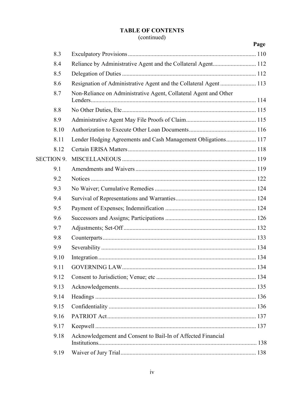 TABLE OF CONTENTS (continued) Page iv 8.3 Exculpatory Provisions ...................................................................................... 110 8.4 Reliance by Administrative Agent and the Collateral Agent ............................. 112 8.5 Delegation of Duties .......................................................................................... 112 8.6 Resignation of Administrative Agent and the Collateral Agent ........................ 113 8.7 Non-Reliance on Administrative Agent, Collateral Agent and Other Lenders ............................................................................................................... 114 8.8 No Other Duties, Etc .......................................................................................... 115 8.9 Administrative Agent May File Proofs of Claim ............................................... 115 8.10 Authorization to Execute Other Loan Documents ............................................. 116 8.11 Lender Hedging Agreements and Cash Management Obligations .................... 117 8.12 Certain ERISA Matters ...................................................................................... 118 SECTION 9. MISCELLANEOUS .......................................................................................... 119 9.1 Amendments and Waivers ................................................................................. 119 9.2 Notices ............................................................................................................... 122 9.3 No Waiver; Cumulative Remedies .................................................................... 124 9.4 Survival of Representations and Warranties ...................................................... 124 9.5 Payment of Expenses; Indemnification ............................................................. 124 9.6 Successors and Assigns; Participations ............................................................. 126 9.7 Adjustments; Set-Off ......................................................................................... 132 9.8 Counterparts ....................................................................................................... 133 9.9 Severability ........................................................................................................ 134 9.10 Integration .......................................................................................................... 134 9.11 GOVERNING LAW .......................................................................................... 134 9.12 Consent to Jurisdiction; Venue; etc ................................................................... 134 9.13 Acknowledgements ............................................................................................ 135 9.14 Headings ............................................................................................................ 136 9.15 Confidentiality ................................................................................................... 136 9.16 PATRIOT Act .................................................................................................... 137 9.17 Keepwell ............................................................................................................ 137 9.18 Acknowledgement and Consent to Bail-In of Affected Financial Institutions.......................................................................................................... 138 9.19 Waiver of Jury Trial ........................................................................................... 138