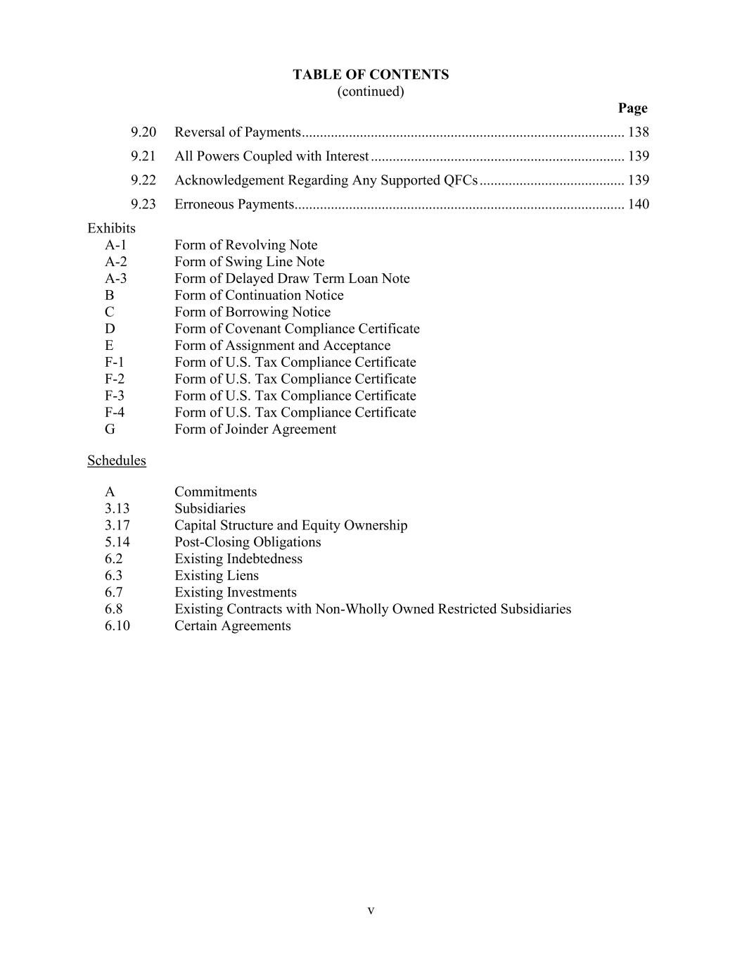 TABLE OF CONTENTS (continued) Page v 9.20 Reversal of Payments ......................................................................................... 138 9.21 All Powers Coupled with Interest ...................................................................... 139 9.22 Acknowledgement Regarding Any Supported QFCs ........................................ 139 9.23 Erroneous Payments........................................................................................... 140 Exhibits A-1 Form of Revolving Note A-2 Form of Swing Line Note A-3 Form of Delayed Draw Term Loan Note B Form of Continuation Notice C Form of Borrowing Notice D Form of Covenant Compliance Certificate E Form of Assignment and Acceptance F-1 Form of U.S. Tax Compliance Certificate F-2 Form of U.S. Tax Compliance Certificate F-3 Form of U.S. Tax Compliance Certificate F-4 Form of U.S. Tax Compliance Certificate G Form of Joinder Agreement Schedules A 3.13 3.17 5.14 6.2 6.3 6.7 6.8 6.10 Commitments Subsidiaries Capital Structure and Equity Ownership Post-Closing Obligations Existing Indebtedness Existing Liens Existing Investments Existing Contracts with Non-Wholly Owned Restricted Subsidiaries Certain Agreements