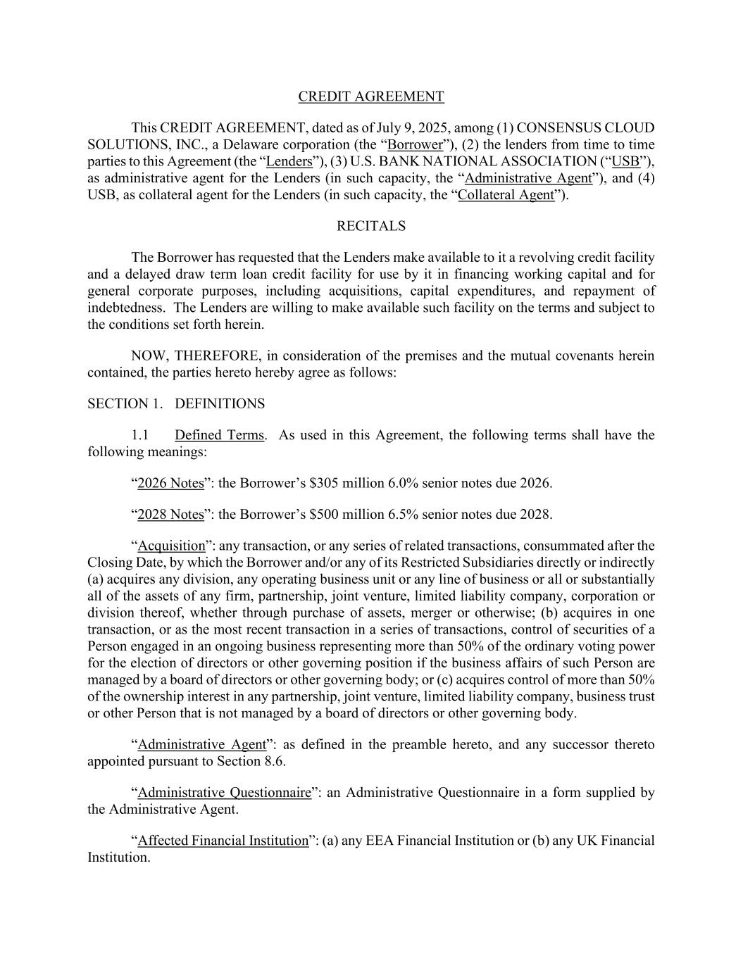 CREDIT AGREEMENT This CREDIT AGREEMENT, dated as of July 9, 2025, among (1) CONSENSUS CLOUD SOLUTIONS, INC., a Delaware corporation (the “Borrower”), (2) the lenders from time to time parties to this Agreement (the “Lenders”), (3) U.S. BANK NATIONAL ASSOCIATION (“USB”), as administrative agent for the Lenders (in such capacity, the “Administrative Agent”), and (4) USB, as collateral agent for the Lenders (in such capacity, the “Collateral Agent”). RECITALS The Borrower has requested that the Lenders make available to it a revolving credit facility and a delayed draw term loan credit facility for use by it in financing working capital and for general corporate purposes, including acquisitions, capital expenditures, and repayment of indebtedness. The Lenders are willing to make available such facility on the terms and subject to the conditions set forth herein. NOW, THEREFORE, in consideration of the premises and the mutual covenants herein contained, the parties hereto hereby agree as follows: SECTION 1. DEFINITIONS 1.1 Defined Terms. As used in this Agreement, the following terms shall have the following meanings: “2026 Notes”: the Borrower’s $305 million 6.0% senior notes due 2026. “2028 Notes”: the Borrower’s $500 million 6.5% senior notes due 2028. “Acquisition”: any transaction, or any series of related transactions, consummated after the Closing Date, by which the Borrower and/or any of its Restricted Subsidiaries directly or indirectly (a) acquires any division, any operating business unit or any line of business or all or substantially all of the assets of any firm, partnership, joint venture, limited liability company, corporation or division thereof, whether through purchase of assets, merger or otherwise; (b) acquires in one transaction, or as the most recent transaction in a series of transactions, control of securities of a Person engaged in an ongoing business representing more than 50% of the ordinary voting power for the election of directors or other governing position if the business affairs of such Person are managed by a board of directors or other governing body; or (c) acquires control of more than 50% of the ownership interest in any partnership, joint venture, limited liability company, business trust or other Person that is not managed by a board of directors or other governing body. “Administrative Agent”: as defined in the preamble hereto, and any successor thereto appointed pursuant to Section 8.6. “Administrative Questionnaire”: an Administrative Questionnaire in a form supplied by the Administrative Agent. “Affected Financial Institution”: (a) any EEA Financial Institution or (b) any UK Financial Institution.