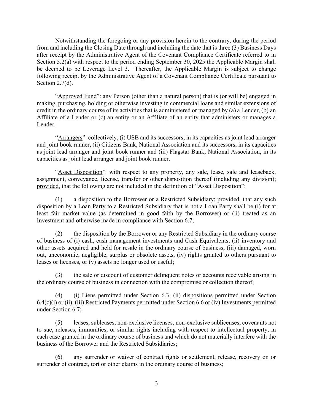 3 Notwithstanding the foregoing or any provision herein to the contrary, during the period from and including the Closing Date through and including the date that is three (3) Business Days after receipt by the Administrative Agent of the Covenant Compliance Certificate referred to in Section 5.2(a) with respect to the period ending September 30, 2025 the Applicable Margin shall be deemed to be Leverage Level 3. Thereafter, the Applicable Margin is subject to change following receipt by the Administrative Agent of a Covenant Compliance Certificate pursuant to Section 2.7(d). “Approved Fund”: any Person (other than a natural person) that is (or will be) engaged in making, purchasing, holding or otherwise investing in commercial loans and similar extensions of credit in the ordinary course of its activities that is administered or managed by (a) a Lender, (b) an Affiliate of a Lender or (c) an entity or an Affiliate of an entity that administers or manages a Lender. “Arrangers”: collectively, (i) USB and its successors, in its capacities as joint lead arranger and joint book runner, (ii) Citizens Bank, National Association and its successors, in its capacities as joint lead arranger and joint book runner and (iii) Flagstar Bank, National Association, in its capacities as joint lead arranger and joint book runner. “Asset Disposition”: with respect to any property, any sale, lease, sale and leaseback, assignment, conveyance, license, transfer or other disposition thereof (including any division); provided, that the following are not included in the definition of “Asset Disposition”: (1) a disposition to the Borrower or a Restricted Subsidiary; provided, that any such disposition by a Loan Party to a Restricted Subsidiary that is not a Loan Party shall be (i) for at least fair market value (as determined in good faith by the Borrower) or (ii) treated as an Investment and otherwise made in compliance with Section 6.7; (2) the disposition by the Borrower or any Restricted Subsidiary in the ordinary course of business of (i) cash, cash management investments and Cash Equivalents, (ii) inventory and other assets acquired and held for resale in the ordinary course of business, (iii) damaged, worn out, uneconomic, negligible, surplus or obsolete assets, (iv) rights granted to others pursuant to leases or licenses, or (v) assets no longer used or useful; (3) the sale or discount of customer delinquent notes or accounts receivable arising in the ordinary course of business in connection with the compromise or collection thereof; (4) (i) Liens permitted under Section 6.3, (ii) dispositions permitted under Section 6.4(c)(i) or (ii), (iii) Restricted Payments permitted under Section 6.6 or (iv) Investments permitted under Section 6.7; (5) leases, subleases, non-exclusive licenses, non-exclusive sublicenses, covenants not to sue, releases, immunities, or similar rights including with respect to intellectual property, in each case granted in the ordinary course of business and which do not materially interfere with the business of the Borrower and the Restricted Subsidiaries; (6) any surrender or waiver of contract rights or settlement, release, recovery on or surrender of contract, tort or other claims in the ordinary course of business;