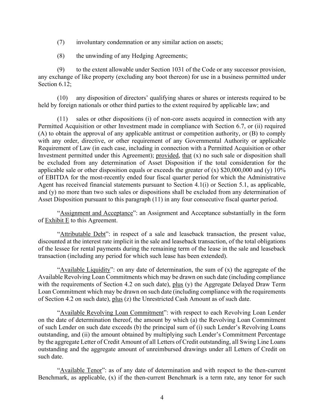 4 (7) involuntary condemnation or any similar action on assets; (8) the unwinding of any Hedging Agreements; (9) to the extent allowable under Section 1031 of the Code or any successor provision, any exchange of like property (excluding any boot thereon) for use in a business permitted under Section 6.12; (10) any disposition of directors’ qualifying shares or shares or interests required to be held by foreign nationals or other third parties to the extent required by applicable law; and (11) sales or other dispositions (i) of non-core assets acquired in connection with any Permitted Acquisition or other Investment made in compliance with Section 6.7, or (ii) required (A) to obtain the approval of any applicable antitrust or competition authority, or (B) to comply with any order, directive, or other requirement of any Governmental Authority or applicable Requirement of Law (in each case, including in connection with a Permitted Acquisition or other Investment permitted under this Agreement); provided, that (x) no such sale or disposition shall be excluded from any determination of Asset Disposition if the total consideration for the applicable sale or other disposition equals or exceeds the greater of (x) $20,000,000 and (y) 10% of EBITDA for the most-recently ended four fiscal quarter period for which the Administrative Agent has received financial statements pursuant to Section 4.1(i) or Section 5.1, as applicable, and (y) no more than two such sales or dispositions shall be excluded from any determination of Asset Disposition pursuant to this paragraph (11) in any four consecutive fiscal quarter period. “Assignment and Acceptance”: an Assignment and Acceptance substantially in the form of Exhibit E to this Agreement. “Attributable Debt”: in respect of a sale and leaseback transaction, the present value, discounted at the interest rate implicit in the sale and leaseback transaction, of the total obligations of the lessee for rental payments during the remaining term of the lease in the sale and leaseback transaction (including any period for which such lease has been extended). “Available Liquidity”: on any date of determination, the sum of (x) the aggregate of the Available Revolving Loan Commitments which may be drawn on such date (including compliance with the requirements of Section 4.2 on such date), plus (y) the Aggregate Delayed Draw Term Loan Commitment which may be drawn on such date (including compliance with the requirements of Section 4.2 on such date), plus (z) the Unrestricted Cash Amount as of such date. “Available Revolving Loan Commitment”: with respect to each Revolving Loan Lender on the date of determination thereof, the amount by which (a) the Revolving Loan Commitment of such Lender on such date exceeds (b) the principal sum of (i) such Lender’s Revolving Loans outstanding, and (ii) the amount obtained by multiplying such Lender’s Commitment Percentage by the aggregate Letter of Credit Amount of all Letters of Credit outstanding, all Swing Line Loans outstanding and the aggregate amount of unreimbursed drawings under all Letters of Credit on such date. “Available Tenor”: as of any date of determination and with respect to the then-current Benchmark, as applicable, (x) if the then-current Benchmark is a term rate, any tenor for such