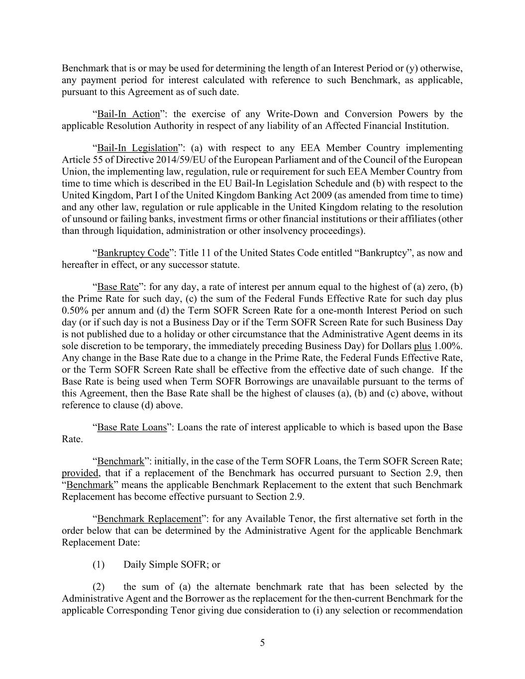 5 Benchmark that is or may be used for determining the length of an Interest Period or (y) otherwise, any payment period for interest calculated with reference to such Benchmark, as applicable, pursuant to this Agreement as of such date. “Bail-In Action”: the exercise of any Write-Down and Conversion Powers by the applicable Resolution Authority in respect of any liability of an Affected Financial Institution. “Bail-In Legislation”: (a) with respect to any EEA Member Country implementing Article 55 of Directive 2014/59/EU of the European Parliament and of the Council of the European Union, the implementing law, regulation, rule or requirement for such EEA Member Country from time to time which is described in the EU Bail-In Legislation Schedule and (b) with respect to the United Kingdom, Part I of the United Kingdom Banking Act 2009 (as amended from time to time) and any other law, regulation or rule applicable in the United Kingdom relating to the resolution of unsound or failing banks, investment firms or other financial institutions or their affiliates (other than through liquidation, administration or other insolvency proceedings). “Bankruptcy Code”: Title 11 of the United States Code entitled “Bankruptcy”, as now and hereafter in effect, or any successor statute. “Base Rate”: for any day, a rate of interest per annum equal to the highest of (a) zero, (b) the Prime Rate for such day, (c) the sum of the Federal Funds Effective Rate for such day plus 0.50% per annum and (d) the Term SOFR Screen Rate for a one-month Interest Period on such day (or if such day is not a Business Day or if the Term SOFR Screen Rate for such Business Day is not published due to a holiday or other circumstance that the Administrative Agent deems in its sole discretion to be temporary, the immediately preceding Business Day) for Dollars plus 1.00%. Any change in the Base Rate due to a change in the Prime Rate, the Federal Funds Effective Rate, or the Term SOFR Screen Rate shall be effective from the effective date of such change. If the Base Rate is being used when Term SOFR Borrowings are unavailable pursuant to the terms of this Agreement, then the Base Rate shall be the highest of clauses (a), (b) and (c) above, without reference to clause (d) above. “Base Rate Loans”: Loans the rate of interest applicable to which is based upon the Base Rate. “Benchmark”: initially, in the case of the Term SOFR Loans, the Term SOFR Screen Rate; provided, that if a replacement of the Benchmark has occurred pursuant to Section 2.9, then “Benchmark” means the applicable Benchmark Replacement to the extent that such Benchmark Replacement has become effective pursuant to Section 2.9. “Benchmark Replacement”: for any Available Tenor, the first alternative set forth in the order below that can be determined by the Administrative Agent for the applicable Benchmark Replacement Date: (1) Daily Simple SOFR; or (2) the sum of (a) the alternate benchmark rate that has been selected by the Administrative Agent and the Borrower as the replacement for the then-current Benchmark for the applicable Corresponding Tenor giving due consideration to (i) any selection or recommendation