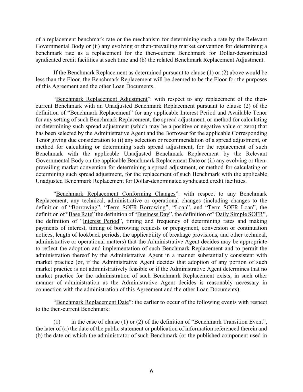 6 of a replacement benchmark rate or the mechanism for determining such a rate by the Relevant Governmental Body or (ii) any evolving or then-prevailing market convention for determining a benchmark rate as a replacement for the then-current Benchmark for Dollar-denominated syndicated credit facilities at such time and (b) the related Benchmark Replacement Adjustment. If the Benchmark Replacement as determined pursuant to clause (1) or (2) above would be less than the Floor, the Benchmark Replacement will be deemed to be the Floor for the purposes of this Agreement and the other Loan Documents. “Benchmark Replacement Adjustment”: with respect to any replacement of the then- current Benchmark with an Unadjusted Benchmark Replacement pursuant to clause (2) of the definition of “Benchmark Replacement” for any applicable Interest Period and Available Tenor for any setting of such Benchmark Replacement, the spread adjustment, or method for calculating or determining such spread adjustment (which may be a positive or negative value or zero) that has been selected by the Administrative Agent and the Borrower for the applicable Corresponding Tenor giving due consideration to (i) any selection or recommendation of a spread adjustment, or method for calculating or determining such spread adjustment, for the replacement of such Benchmark with the applicable Unadjusted Benchmark Replacement by the Relevant Governmental Body on the applicable Benchmark Replacement Date or (ii) any evolving or then- prevailing market convention for determining a spread adjustment, or method for calculating or determining such spread adjustment, for the replacement of such Benchmark with the applicable Unadjusted Benchmark Replacement for Dollar-denominated syndicated credit facilities. “Benchmark Replacement Conforming Changes”: with respect to any Benchmark Replacement, any technical, administrative or operational changes (including changes to the definition of “Borrowing”, “Term SOFR Borrowing”, “Loan”, and “Term SOFR Loan”, the definition of “Base Rate” the definition of “Business Day”, the definition of “Daily Simple SOFR”, the definition of “Interest Period”, timing and frequency of determining rates and making payments of interest, timing of borrowing requests or prepayment, conversion or continuation notices, length of lookback periods, the applicability of breakage provisions, and other technical, administrative or operational matters) that the Administrative Agent decides may be appropriate to reflect the adoption and implementation of such Benchmark Replacement and to permit the administration thereof by the Administrative Agent in a manner substantially consistent with market practice (or, if the Administrative Agent decides that adoption of any portion of such market practice is not administratively feasible or if the Administrative Agent determines that no market practice for the administration of such Benchmark Replacement exists, in such other manner of administration as the Administrative Agent decides is reasonably necessary in connection with the administration of this Agreement and the other Loan Documents). “Benchmark Replacement Date”: the earlier to occur of the following events with respect to the then-current Benchmark: (1) in the case of clause (1) or (2) of the definition of “Benchmark Transition Event”, the later of (a) the date of the public statement or publication of information referenced therein and (b) the date on which the administrator of such Benchmark (or the published component used in