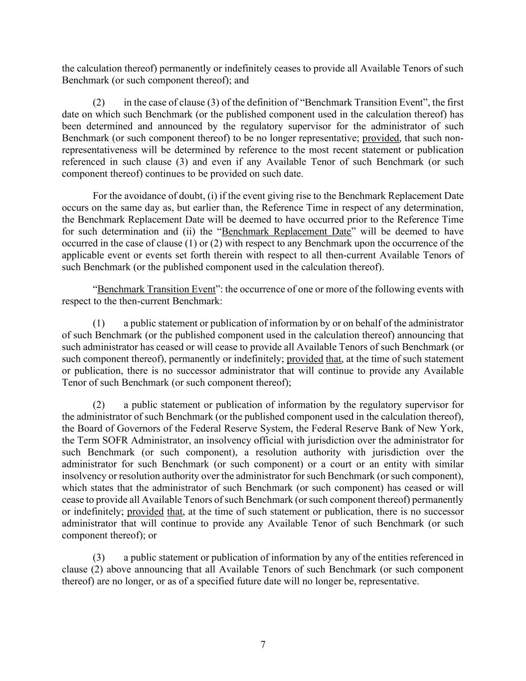 7 the calculation thereof) permanently or indefinitely ceases to provide all Available Tenors of such Benchmark (or such component thereof); and (2) in the case of clause (3) of the definition of “Benchmark Transition Event”, the first date on which such Benchmark (or the published component used in the calculation thereof) has been determined and announced by the regulatory supervisor for the administrator of such Benchmark (or such component thereof) to be no longer representative; provided, that such non- representativeness will be determined by reference to the most recent statement or publication referenced in such clause (3) and even if any Available Tenor of such Benchmark (or such component thereof) continues to be provided on such date. For the avoidance of doubt, (i) if the event giving rise to the Benchmark Replacement Date occurs on the same day as, but earlier than, the Reference Time in respect of any determination, the Benchmark Replacement Date will be deemed to have occurred prior to the Reference Time for such determination and (ii) the “Benchmark Replacement Date” will be deemed to have occurred in the case of clause (1) or (2) with respect to any Benchmark upon the occurrence of the applicable event or events set forth therein with respect to all then-current Available Tenors of such Benchmark (or the published component used in the calculation thereof). “Benchmark Transition Event”: the occurrence of one or more of the following events with respect to the then-current Benchmark: (1) a public statement or publication of information by or on behalf of the administrator of such Benchmark (or the published component used in the calculation thereof) announcing that such administrator has ceased or will cease to provide all Available Tenors of such Benchmark (or such component thereof), permanently or indefinitely; provided that, at the time of such statement or publication, there is no successor administrator that will continue to provide any Available Tenor of such Benchmark (or such component thereof); (2) a public statement or publication of information by the regulatory supervisor for the administrator of such Benchmark (or the published component used in the calculation thereof), the Board of Governors of the Federal Reserve System, the Federal Reserve Bank of New York, the Term SOFR Administrator, an insolvency official with jurisdiction over the administrator for such Benchmark (or such component), a resolution authority with jurisdiction over the administrator for such Benchmark (or such component) or a court or an entity with similar insolvency or resolution authority over the administrator for such Benchmark (or such component), which states that the administrator of such Benchmark (or such component) has ceased or will cease to provide all Available Tenors of such Benchmark (or such component thereof) permanently or indefinitely; provided that, at the time of such statement or publication, there is no successor administrator that will continue to provide any Available Tenor of such Benchmark (or such component thereof); or (3) a public statement or publication of information by any of the entities referenced in clause (2) above announcing that all Available Tenors of such Benchmark (or such component thereof) are no longer, or as of a specified future date will no longer be, representative.