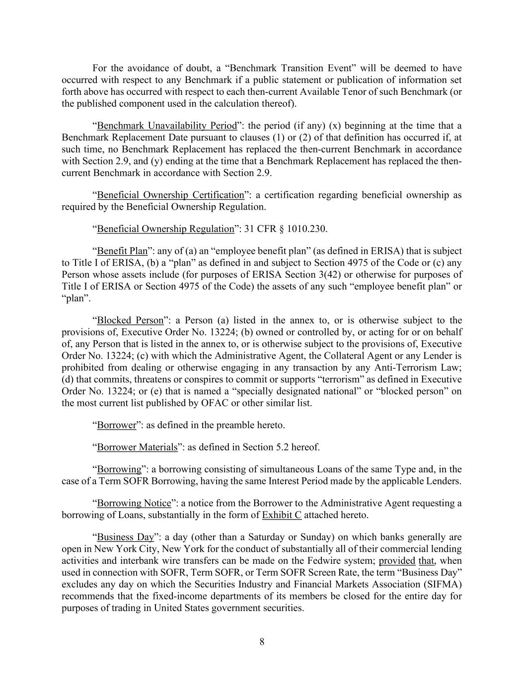 8 For the avoidance of doubt, a “Benchmark Transition Event” will be deemed to have occurred with respect to any Benchmark if a public statement or publication of information set forth above has occurred with respect to each then-current Available Tenor of such Benchmark (or the published component used in the calculation thereof). “Benchmark Unavailability Period”: the period (if any) (x) beginning at the time that a Benchmark Replacement Date pursuant to clauses (1) or (2) of that definition has occurred if, at such time, no Benchmark Replacement has replaced the then-current Benchmark in accordance with Section 2.9, and (y) ending at the time that a Benchmark Replacement has replaced the then- current Benchmark in accordance with Section 2.9. “Beneficial Ownership Certification”: a certification regarding beneficial ownership as required by the Beneficial Ownership Regulation. “Beneficial Ownership Regulation”: 31 CFR § 1010.230. “Benefit Plan”: any of (a) an “employee benefit plan” (as defined in ERISA) that is subject to Title I of ERISA, (b) a “plan” as defined in and subject to Section 4975 of the Code or (c) any Person whose assets include (for purposes of ERISA Section 3(42) or otherwise for purposes of Title I of ERISA or Section 4975 of the Code) the assets of any such “employee benefit plan” or “plan”. “Blocked Person”: a Person (a) listed in the annex to, or is otherwise subject to the provisions of, Executive Order No. 13224; (b) owned or controlled by, or acting for or on behalf of, any Person that is listed in the annex to, or is otherwise subject to the provisions of, Executive Order No. 13224; (c) with which the Administrative Agent, the Collateral Agent or any Lender is prohibited from dealing or otherwise engaging in any transaction by any Anti-Terrorism Law; (d) that commits, threatens or conspires to commit or supports “terrorism” as defined in Executive Order No. 13224; or (e) that is named a “specially designated national” or “blocked person” on the most current list published by OFAC or other similar list. “Borrower”: as defined in the preamble hereto. “Borrower Materials”: as defined in Section 5.2 hereof. “Borrowing”: a borrowing consisting of simultaneous Loans of the same Type and, in the case of a Term SOFR Borrowing, having the same Interest Period made by the applicable Lenders. “Borrowing Notice”: a notice from the Borrower to the Administrative Agent requesting a borrowing of Loans, substantially in the form of Exhibit C attached hereto. “Business Day”: a day (other than a Saturday or Sunday) on which banks generally are open in New York City, New York for the conduct of substantially all of their commercial lending activities and interbank wire transfers can be made on the Fedwire system; provided that, when used in connection with SOFR, Term SOFR, or Term SOFR Screen Rate, the term “Business Day” excludes any day on which the Securities Industry and Financial Markets Association (SIFMA) recommends that the fixed-income departments of its members be closed for the entire day for purposes of trading in United States government securities.