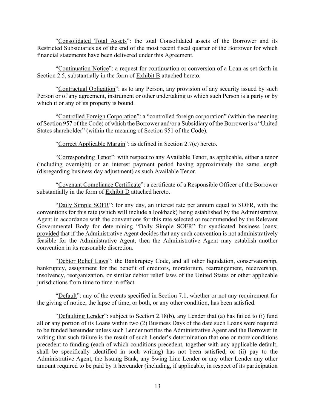 13 “Consolidated Total Assets”: the total Consolidated assets of the Borrower and its Restricted Subsidiaries as of the end of the most recent fiscal quarter of the Borrower for which financial statements have been delivered under this Agreement. “Continuation Notice”: a request for continuation or conversion of a Loan as set forth in Section 2.5, substantially in the form of Exhibit B attached hereto. “Contractual Obligation”: as to any Person, any provision of any security issued by such Person or of any agreement, instrument or other undertaking to which such Person is a party or by which it or any of its property is bound. “Controlled Foreign Corporation”: a “controlled foreign corporation” (within the meaning of Section 957 of the Code) of which the Borrower and/or a Subsidiary of the Borrower is a “United States shareholder” (within the meaning of Section 951 of the Code). “Correct Applicable Margin”: as defined in Section 2.7(e) hereto. “Corresponding Tenor”: with respect to any Available Tenor, as applicable, either a tenor (including overnight) or an interest payment period having approximately the same length (disregarding business day adjustment) as such Available Tenor. “Covenant Compliance Certificate”: a certificate of a Responsible Officer of the Borrower substantially in the form of Exhibit D attached hereto. “Daily Simple SOFR”: for any day, an interest rate per annum equal to SOFR, with the conventions for this rate (which will include a lookback) being established by the Administrative Agent in accordance with the conventions for this rate selected or recommended by the Relevant Governmental Body for determining “Daily Simple SOFR” for syndicated business loans; provided that if the Administrative Agent decides that any such convention is not administratively feasible for the Administrative Agent, then the Administrative Agent may establish another convention in its reasonable discretion. “Debtor Relief Laws”: the Bankruptcy Code, and all other liquidation, conservatorship, bankruptcy, assignment for the benefit of creditors, moratorium, rearrangement, receivership, insolvency, reorganization, or similar debtor relief laws of the United States or other applicable jurisdictions from time to time in effect. “Default”: any of the events specified in Section 7.1, whether or not any requirement for the giving of notice, the lapse of time, or both, or any other condition, has been satisfied. “Defaulting Lender”: subject to Section 2.18(b), any Lender that (a) has failed to (i) fund all or any portion of its Loans within two (2) Business Days of the date such Loans were required to be funded hereunder unless such Lender notifies the Administrative Agent and the Borrower in writing that such failure is the result of such Lender’s determination that one or more conditions precedent to funding (each of which conditions precedent, together with any applicable default, shall be specifically identified in such writing) has not been satisfied, or (ii) pay to the Administrative Agent, the Issuing Bank, any Swing Line Lender or any other Lender any other amount required to be paid by it hereunder (including, if applicable, in respect of its participation