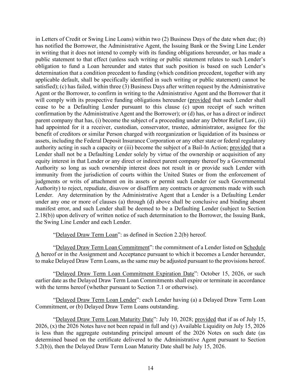 14 in Letters of Credit or Swing Line Loans) within two (2) Business Days of the date when due; (b) has notified the Borrower, the Administrative Agent, the Issuing Bank or the Swing Line Lender in writing that it does not intend to comply with its funding obligations hereunder, or has made a public statement to that effect (unless such writing or public statement relates to such Lender’s obligation to fund a Loan hereunder and states that such position is based on such Lender’s determination that a condition precedent to funding (which condition precedent, together with any applicable default, shall be specifically identified in such writing or public statement) cannot be satisfied); (c) has failed, within three (3) Business Days after written request by the Administrative Agent or the Borrower, to confirm in writing to the Administrative Agent and the Borrower that it will comply with its prospective funding obligations hereunder (provided that such Lender shall cease to be a Defaulting Lender pursuant to this clause (c) upon receipt of such written confirmation by the Administrative Agent and the Borrower); or (d) has, or has a direct or indirect parent company that has, (i) become the subject of a proceeding under any Debtor Relief Law, (ii) had appointed for it a receiver, custodian, conservator, trustee, administrator, assignee for the benefit of creditors or similar Person charged with reorganization or liquidation of its business or assets, including the Federal Deposit Insurance Corporation or any other state or federal regulatory authority acting in such a capacity or (iii) become the subject of a Bail-In Action; provided that a Lender shall not be a Defaulting Lender solely by virtue of the ownership or acquisition of any equity interest in that Lender or any direct or indirect parent company thereof by a Governmental Authority so long as such ownership interest does not result in or provide such Lender with immunity from the jurisdiction of courts within the United States or from the enforcement of judgments or writs of attachment on its assets or permit such Lender (or such Governmental Authority) to reject, repudiate, disavow or disaffirm any contracts or agreements made with such Lender. Any determination by the Administrative Agent that a Lender is a Defaulting Lender under any one or more of clauses (a) through (d) above shall be conclusive and binding absent manifest error, and such Lender shall be deemed to be a Defaulting Lender (subject to Section 2.18(b)) upon delivery of written notice of such determination to the Borrower, the Issuing Bank, the Swing Line Lender and each Lender. “Delayed Draw Term Loan”: as defined in Section 2.2(b) hereof. “Delayed Draw Term Loan Commitment”: the commitment of a Lender listed on Schedule A hereof or in the Assignment and Acceptance pursuant to which it becomes a Lender hereunder, to make Delayed Draw Term Loans, as the same may be adjusted pursuant to the provisions hereof. “Delayed Draw Term Loan Commitment Expiration Date”: October 15, 2026, or such earlier date as the Delayed Draw Term Loan Commitments shall expire or terminate in accordance with the terms hereof (whether pursuant to Section 7.1 or otherwise). “Delayed Draw Term Loan Lender”: each Lender having (a) a Delayed Draw Term Loan Commitment, or (b) Delayed Draw Term Loans outstanding. “Delayed Draw Term Loan Maturity Date”: July 10, 2028; provided that if as of July 15, 2026, (x) the 2026 Notes have not been repaid in full and (y) Available Liquidity on July 15, 2026 is less than the aggregate outstanding principal amount of the 2026 Notes on such date (as determined based on the certificate delivered to the Administrative Agent pursuant to Section 5.2(b)), then the Delayed Draw Term Loan Maturity Date shall be July 15, 2026.