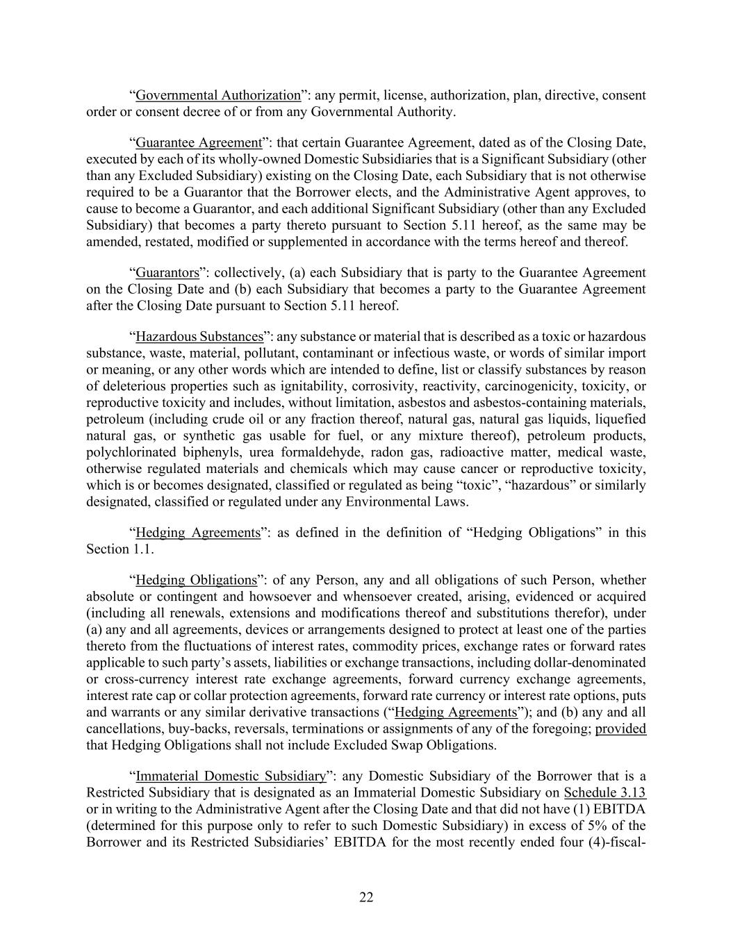 22 “Governmental Authorization”: any permit, license, authorization, plan, directive, consent order or consent decree of or from any Governmental Authority. “Guarantee Agreement”: that certain Guarantee Agreement, dated as of the Closing Date, executed by each of its wholly-owned Domestic Subsidiaries that is a Significant Subsidiary (other than any Excluded Subsidiary) existing on the Closing Date, each Subsidiary that is not otherwise required to be a Guarantor that the Borrower elects, and the Administrative Agent approves, to cause to become a Guarantor, and each additional Significant Subsidiary (other than any Excluded Subsidiary) that becomes a party thereto pursuant to Section 5.11 hereof, as the same may be amended, restated, modified or supplemented in accordance with the terms hereof and thereof. “Guarantors”: collectively, (a) each Subsidiary that is party to the Guarantee Agreement on the Closing Date and (b) each Subsidiary that becomes a party to the Guarantee Agreement after the Closing Date pursuant to Section 5.11 hereof. “Hazardous Substances”: any substance or material that is described as a toxic or hazardous substance, waste, material, pollutant, contaminant or infectious waste, or words of similar import or meaning, or any other words which are intended to define, list or classify substances by reason of deleterious properties such as ignitability, corrosivity, reactivity, carcinogenicity, toxicity, or reproductive toxicity and includes, without limitation, asbestos and asbestos-containing materials, petroleum (including crude oil or any fraction thereof, natural gas, natural gas liquids, liquefied natural gas, or synthetic gas usable for fuel, or any mixture thereof), petroleum products, polychlorinated biphenyls, urea formaldehyde, radon gas, radioactive matter, medical waste, otherwise regulated materials and chemicals which may cause cancer or reproductive toxicity, which is or becomes designated, classified or regulated as being “toxic”, “hazardous” or similarly designated, classified or regulated under any Environmental Laws. “Hedging Agreements”: as defined in the definition of “Hedging Obligations” in this Section 1.1. “Hedging Obligations”: of any Person, any and all obligations of such Person, whether absolute or contingent and howsoever and whensoever created, arising, evidenced or acquired (including all renewals, extensions and modifications thereof and substitutions therefor), under (a) any and all agreements, devices or arrangements designed to protect at least one of the parties thereto from the fluctuations of interest rates, commodity prices, exchange rates or forward rates applicable to such party’s assets, liabilities or exchange transactions, including dollar-denominated or cross-currency interest rate exchange agreements, forward currency exchange agreements, interest rate cap or collar protection agreements, forward rate currency or interest rate options, puts and warrants or any similar derivative transactions (“Hedging Agreements”); and (b) any and all cancellations, buy-backs, reversals, terminations or assignments of any of the foregoing; provided that Hedging Obligations shall not include Excluded Swap Obligations. “Immaterial Domestic Subsidiary”: any Domestic Subsidiary of the Borrower that is a Restricted Subsidiary that is designated as an Immaterial Domestic Subsidiary on Schedule 3.13 or in writing to the Administrative Agent after the Closing Date and that did not have (1) EBITDA (determined for this purpose only to refer to such Domestic Subsidiary) in excess of 5% of the Borrower and its Restricted Subsidiaries’ EBITDA for the most recently ended four (4)-fiscal-