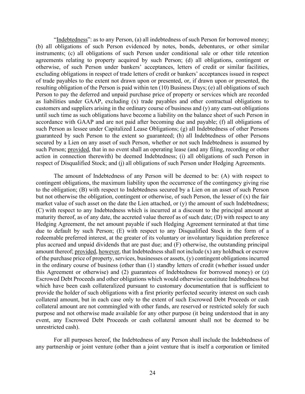 24 “Indebtedness”: as to any Person, (a) all indebtedness of such Person for borrowed money; (b) all obligations of such Person evidenced by notes, bonds, debentures, or other similar instruments; (c) all obligations of such Person under conditional sale or other title retention agreements relating to property acquired by such Person; (d) all obligations, contingent or otherwise, of such Person under bankers’ acceptances, letters of credit or similar facilities, excluding obligations in respect of trade letters of credit or bankers’ acceptances issued in respect of trade payables to the extent not drawn upon or presented, or, if drawn upon or presented, the resulting obligation of the Person is paid within ten (10) Business Days; (e) all obligations of such Person to pay the deferred and unpaid purchase price of property or services which are recorded as liabilities under GAAP, excluding (x) trade payables and other contractual obligations to customers and suppliers arising in the ordinary course of business and (y) any earn-out obligations until such time as such obligations have become a liability on the balance sheet of such Person in accordance with GAAP and are not paid after becoming due and payable; (f) all obligations of such Person as lessee under Capitalized Lease Obligations; (g) all Indebtedness of other Persons guaranteed by such Person to the extent so guaranteed; (h) all Indebtedness of other Persons secured by a Lien on any asset of such Person, whether or not such Indebtedness is assumed by such Person; provided, that in no event shall an operating lease (and any filing, recording or other action in connection therewith) be deemed Indebtedness; (i) all obligations of such Person in respect of Disqualified Stock; and (j) all obligations of such Person under Hedging Agreements. The amount of Indebtedness of any Person will be deemed to be: (A) with respect to contingent obligations, the maximum liability upon the occurrence of the contingency giving rise to the obligation; (B) with respect to Indebtedness secured by a Lien on an asset of such Person but not otherwise the obligation, contingent or otherwise, of such Person, the lesser of (x) the fair market value of such asset on the date the Lien attached, or (y) the amount of such Indebtedness; (C) with respect to any Indebtedness which is incurred at a discount to the principal amount at maturity thereof, as of any date, the accreted value thereof as of such date; (D) with respect to any Hedging Agreement, the net amount payable if such Hedging Agreement terminated at that time due to default by such Person; (E) with respect to any Disqualified Stock in the form of a redeemable preferred interest, at the greater of its voluntary or involuntary liquidation preference plus accrued and unpaid dividends that are past due; and (F) otherwise, the outstanding principal amount thereof; provided, however, that Indebtedness shall not include (x) any holdback or escrow of the purchase price of property, services, businesses or assets, (y) contingent obligations incurred in the ordinary course of business (other than (1) standby letters of credit (whether issued under this Agreement or otherwise) and (2) guarantees of Indebtedness for borrowed money) or (z) Escrowed Debt Proceeds and other obligations which would otherwise constitute Indebtedness but which have been cash collateralized pursuant to customary documentation that is sufficient to provide the holder of such obligations with a first priority perfected security interest on such cash collateral amount, but in each case only to the extent of such Escrowed Debt Proceeds or cash collateral amount are not commingled with other funds, are reserved or restricted solely for such purpose and not otherwise made available for any other purpose (it being understood that in any event, any Escrowed Debt Proceeds or cash collateral amount shall not be deemed to be unrestricted cash). For all purposes hereof, the Indebtedness of any Person shall include the Indebtedness of any partnership or joint venture (other than a joint venture that is itself a corporation or limited