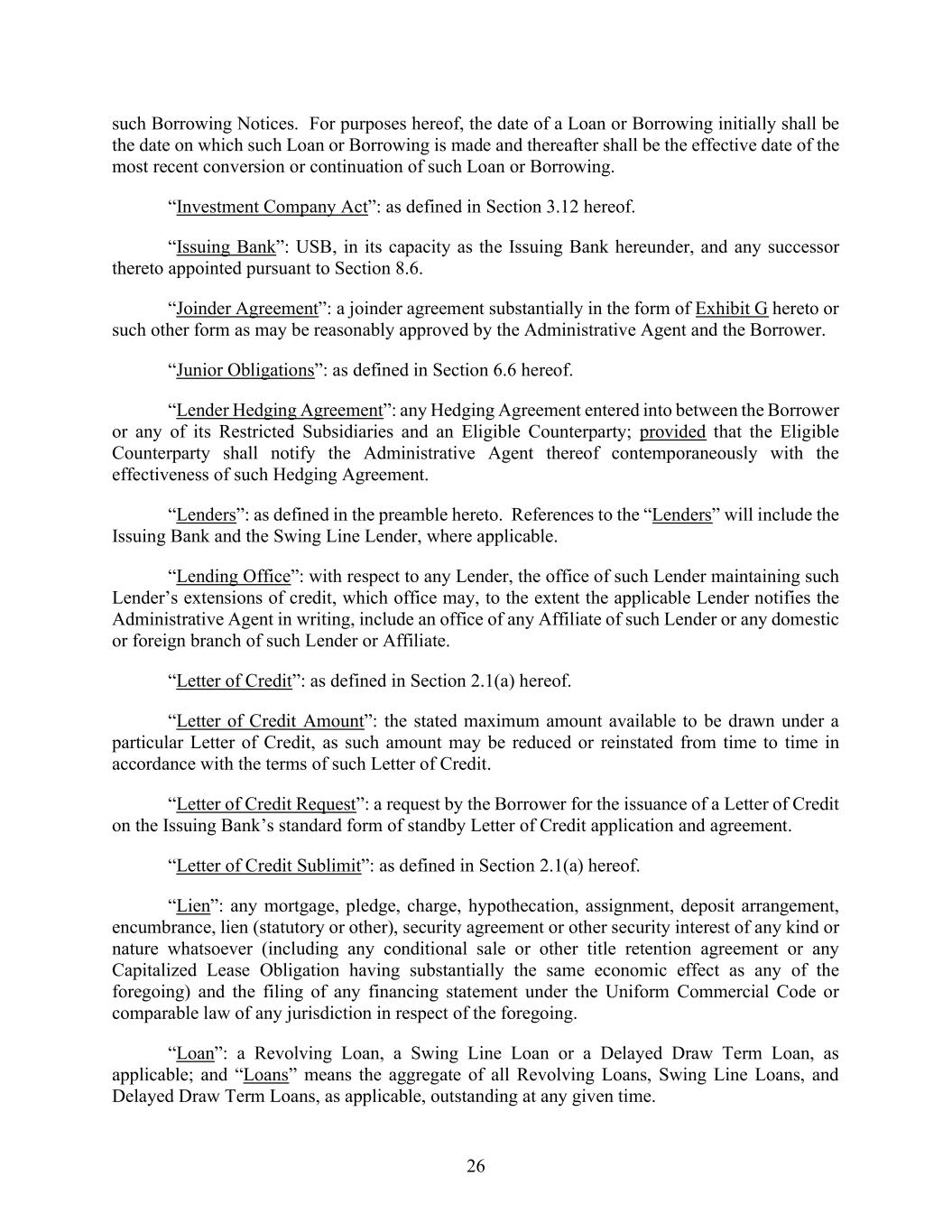 26 such Borrowing Notices. For purposes hereof, the date of a Loan or Borrowing initially shall be the date on which such Loan or Borrowing is made and thereafter shall be the effective date of the most recent conversion or continuation of such Loan or Borrowing. “Investment Company Act”: as defined in Section 3.12 hereof. “Issuing Bank”: USB, in its capacity as the Issuing Bank hereunder, and any successor thereto appointed pursuant to Section 8.6. “Joinder Agreement”: a joinder agreement substantially in the form of Exhibit G hereto or such other form as may be reasonably approved by the Administrative Agent and the Borrower. “Junior Obligations”: as defined in Section 6.6 hereof. “Lender Hedging Agreement”: any Hedging Agreement entered into between the Borrower or any of its Restricted Subsidiaries and an Eligible Counterparty; provided that the Eligible Counterparty shall notify the Administrative Agent thereof contemporaneously with the effectiveness of such Hedging Agreement. “Lenders”: as defined in the preamble hereto. References to the “Lenders” will include the Issuing Bank and the Swing Line Lender, where applicable. “Lending Office”: with respect to any Lender, the office of such Lender maintaining such Lender’s extensions of credit, which office may, to the extent the applicable Lender notifies the Administrative Agent in writing, include an office of any Affiliate of such Lender or any domestic or foreign branch of such Lender or Affiliate. “Letter of Credit”: as defined in Section 2.1(a) hereof. “Letter of Credit Amount”: the stated maximum amount available to be drawn under a particular Letter of Credit, as such amount may be reduced or reinstated from time to time in accordance with the terms of such Letter of Credit. “Letter of Credit Request”: a request by the Borrower for the issuance of a Letter of Credit on the Issuing Bank’s standard form of standby Letter of Credit application and agreement. “Letter of Credit Sublimit”: as defined in Section 2.1(a) hereof. “Lien”: any mortgage, pledge, charge, hypothecation, assignment, deposit arrangement, encumbrance, lien (statutory or other), security agreement or other security interest of any kind or nature whatsoever (including any conditional sale or other title retention agreement or any Capitalized Lease Obligation having substantially the same economic effect as any of the foregoing) and the filing of any financing statement under the Uniform Commercial Code or comparable law of any jurisdiction in respect of the foregoing. “Loan”: a Revolving Loan, a Swing Line Loan or a Delayed Draw Term Loan, as applicable; and “Loans” means the aggregate of all Revolving Loans, Swing Line Loans, and Delayed Draw Term Loans, as applicable, outstanding at any given time.