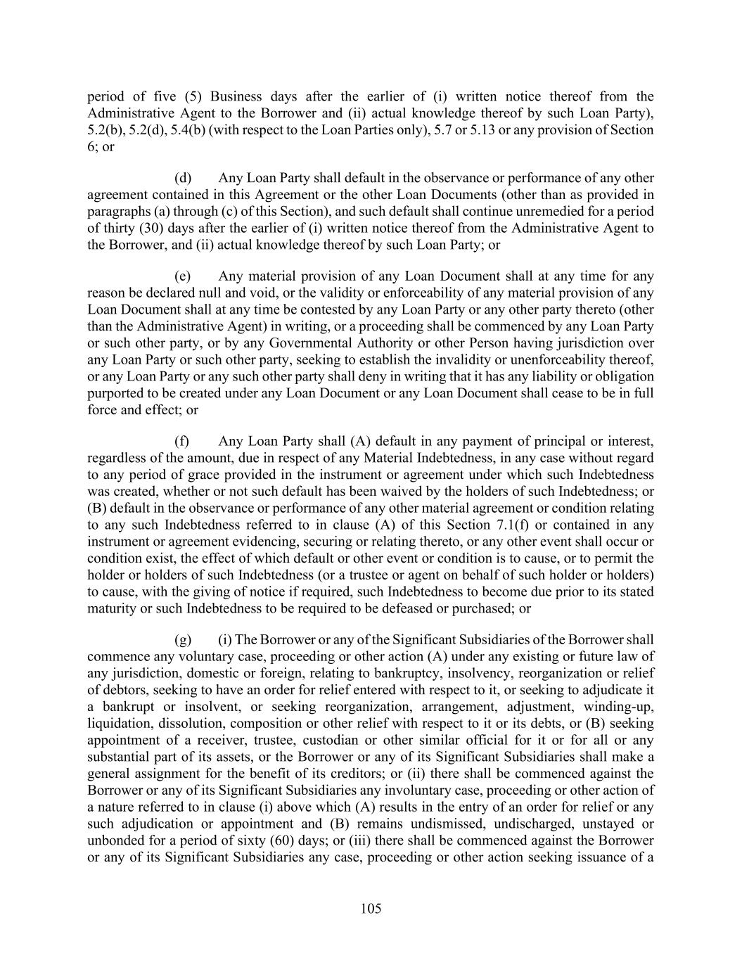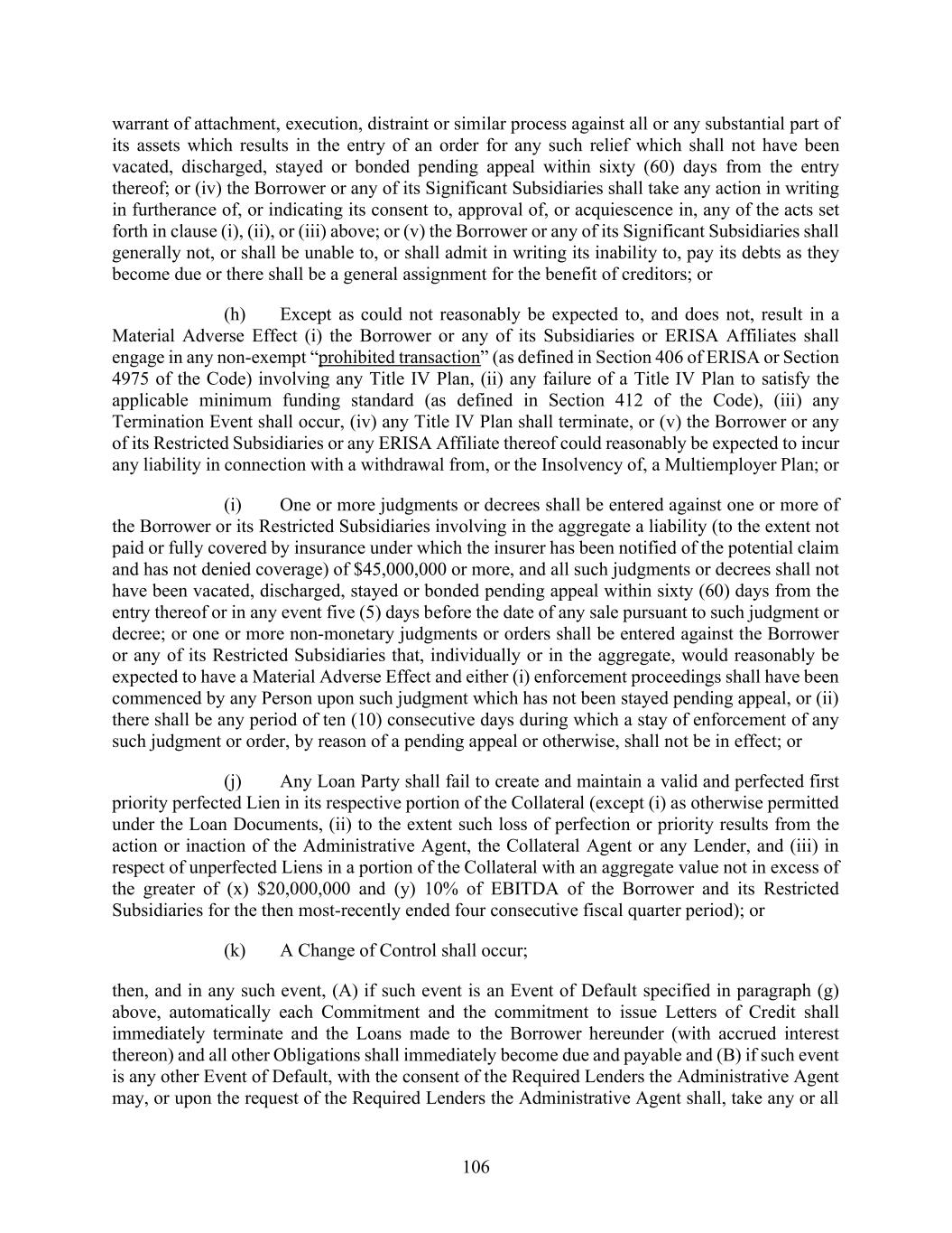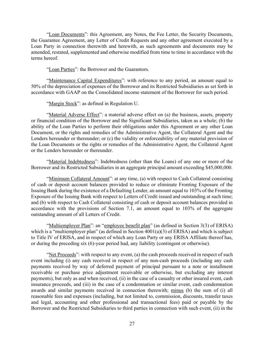 27 “Loan Documents”: this Agreement, any Notes, the Fee Letter, the Security Documents, the Guarantee Agreement, any Letter of Credit Requests and any other agreement executed by a Loan Party in connection therewith and herewith, as such agreements and documents may be amended, restated, supplemented and otherwise modified from time to time in accordance with the terms hereof. “Loan Parties”: the Borrower and the Guarantors. “Maintenance Capital Expenditures”: with reference to any period, an amount equal to 50% of the depreciation of expenses of the Borrower and its Restricted Subsidiaries as set forth in accordance with GAAP on the Consolidated income statement of the Borrower for such period. “Margin Stock”: as defined in Regulation U. “Material Adverse Effect”: a material adverse effect on (a) the business, assets, property or financial condition of the Borrower and the Significant Subsidiaries, taken as a whole; (b) the ability of the Loan Parties to perform their obligations under this Agreement or any other Loan Document, or the rights and remedies of the Administrative Agent, the Collateral Agent and the Lenders hereunder or thereunder; or (c) the validity or enforceability of any material provision of the Loan Documents or the rights or remedies of the Administrative Agent, the Collateral Agent or the Lenders hereunder or thereunder. “Material Indebtedness”: Indebtedness (other than the Loans) of any one or more of the Borrower and its Restricted Subsidiaries in an aggregate principal amount exceeding $45,000,000. “Minimum Collateral Amount”: at any time, (a) with respect to Cash Collateral consisting of cash or deposit account balances provided to reduce or eliminate Fronting Exposure of the Issuing Bank during the existence of a Defaulting Lender, an amount equal to 103% of the Fronting Exposure of the Issuing Bank with respect to Letters of Credit issued and outstanding at such time; and (b) with respect to Cash Collateral consisting of cash or deposit account balances provided in accordance with the provisions of Section 7.1, an amount equal to 103% of the aggregate outstanding amount of all Letters of Credit. “Multiemployer Plan”: an “employee benefit plan” (as defined in Section 3(3) of ERISA) which is a “multiemployer plan” (as defined in Section 4001(a)(3) of ERISA) and which is subject to Title IV of ERISA, and in respect of which any Loan Party or any ERISA Affiliate thereof has, or during the preceding six (6)-year period had, any liability (contingent or otherwise). “Net Proceeds”: with respect to any event, (a) the cash proceeds received in respect of such event including (i) any cash received in respect of any non-cash proceeds (including any cash payments received by way of deferred payment of principal pursuant to a note or installment receivable or purchase price adjustment receivable or otherwise, but excluding any interest payments), but only as and when received, (ii) in the case of a casualty or other insured event, cash insurance proceeds, and (iii) in the case of a condemnation or similar event, cash condemnation awards and similar payments received in connection therewith; minus (b) the sum of (i) all reasonable fees and expenses (including, but not limited to, commission, discounts, transfer taxes and legal, accounting and other professional and transactional fees) paid or payable by the Borrower and the Restricted Subsidiaries to third parties in connection with such event, (ii) in the