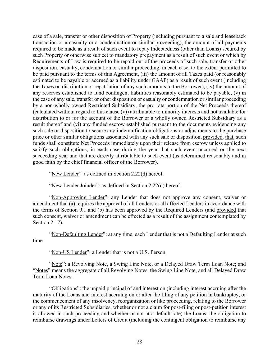 28 case of a sale, transfer or other disposition of Property (including pursuant to a sale and leaseback transaction or a casualty or a condemnation or similar proceeding), the amount of all payments required to be made as a result of such event to repay Indebtedness (other than Loans) secured by such Property or otherwise subject to mandatory prepayment as a result of such event or which by Requirements of Law is required to be repaid out of the proceeds of such sale, transfer or other disposition, casualty, condemnation or similar proceeding, in each case, to the extent permitted to be paid pursuant to the terms of this Agreement, (iii) the amount of all Taxes paid (or reasonably estimated to be payable or accrued as a liability under GAAP) as a result of such event (including the Taxes on distribution or repatriation of any such amounts to the Borrower), (iv) the amount of any reserves established to fund contingent liabilities reasonably estimated to be payable, (v) in the case of any sale, transfer or other disposition or casualty or condemnation or similar proceeding by a non-wholly owned Restricted Subsidiary, the pro rata portion of the Net Proceeds thereof (calculated without regard to this clause (v)) attributable to minority interests and not available for distribution to or for the account of the Borrower or a wholly owned Restricted Subsidiary as a result thereof and (vi) any funded escrow established pursuant to the documents evidencing any such sale or disposition to secure any indemnification obligations or adjustments to the purchase price or other similar obligations associated with any such sale or disposition, provided, that, such funds shall constitute Net Proceeds immediately upon their release from escrow unless applied to satisfy such obligations, in each case during the year that such event occurred or the next succeeding year and that are directly attributable to such event (as determined reasonably and in good faith by the chief financial officer of the Borrower). “New Lender”: as defined in Section 2.22(d) hereof. “New Lender Joinder”: as defined in Section 2.22(d) hereof. “Non-Approving Lender”: any Lender that does not approve any consent, waiver or amendment that (a) requires the approval of all Lenders or all affected Lenders in accordance with the terms of Section 9.1 and (b) has been approved by the Required Lenders (and provided that such consent, waiver or amendment can be effected as a result of the assignment contemplated by Section 2.17). “Non-Defaulting Lender”: at any time, each Lender that is not a Defaulting Lender at such time. “Non-US Lender”: a Lender that is not a U.S. Person. “Note”: a Revolving Note, a Swing Line Note, or a Delayed Draw Term Loan Note; and “Notes” means the aggregate of all Revolving Notes, the Swing Line Note, and all Delayed Draw Term Loan Notes. “Obligations”: the unpaid principal of and interest on (including interest accruing after the maturity of the Loans and interest accruing on or after the filing of any petition in bankruptcy, or the commencement of any insolvency, reorganization or like proceeding, relating to the Borrower or any of its Restricted Subsidiaries, whether or not a claim for post-filing or post-petition interest is allowed in such proceeding and whether or not at a default rate) the Loans, the obligation to reimburse drawings under Letters of Credit (including the contingent obligation to reimburse any