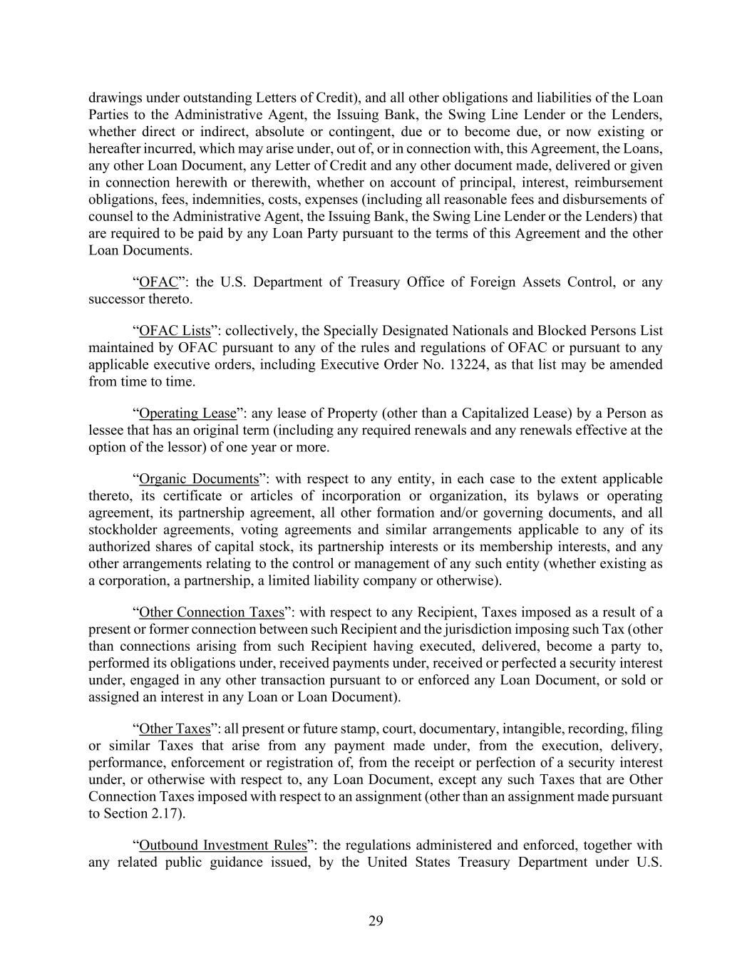 29 drawings under outstanding Letters of Credit), and all other obligations and liabilities of the Loan Parties to the Administrative Agent, the Issuing Bank, the Swing Line Lender or the Lenders, whether direct or indirect, absolute or contingent, due or to become due, or now existing or hereafter incurred, which may arise under, out of, or in connection with, this Agreement, the Loans, any other Loan Document, any Letter of Credit and any other document made, delivered or given in connection herewith or therewith, whether on account of principal, interest, reimbursement obligations, fees, indemnities, costs, expenses (including all reasonable fees and disbursements of counsel to the Administrative Agent, the Issuing Bank, the Swing Line Lender or the Lenders) that are required to be paid by any Loan Party pursuant to the terms of this Agreement and the other Loan Documents. “OFAC”: the U.S. Department of Treasury Office of Foreign Assets Control, or any successor thereto. “OFAC Lists”: collectively, the Specially Designated Nationals and Blocked Persons List maintained by OFAC pursuant to any of the rules and regulations of OFAC or pursuant to any applicable executive orders, including Executive Order No. 13224, as that list may be amended from time to time. “Operating Lease”: any lease of Property (other than a Capitalized Lease) by a Person as lessee that has an original term (including any required renewals and any renewals effective at the option of the lessor) of one year or more. “Organic Documents”: with respect to any entity, in each case to the extent applicable thereto, its certificate or articles of incorporation or organization, its bylaws or operating agreement, its partnership agreement, all other formation and/or governing documents, and all stockholder agreements, voting agreements and similar arrangements applicable to any of its authorized shares of capital stock, its partnership interests or its membership interests, and any other arrangements relating to the control or management of any such entity (whether existing as a corporation, a partnership, a limited liability company or otherwise). “Other Connection Taxes”: with respect to any Recipient, Taxes imposed as a result of a present or former connection between such Recipient and the jurisdiction imposing such Tax (other than connections arising from such Recipient having executed, delivered, become a party to, performed its obligations under, received payments under, received or perfected a security interest under, engaged in any other transaction pursuant to or enforced any Loan Document, or sold or assigned an interest in any Loan or Loan Document). “Other Taxes”: all present or future stamp, court, documentary, intangible, recording, filing or similar Taxes that arise from any payment made under, from the execution, delivery, performance, enforcement or registration of, from the receipt or perfection of a security interest under, or otherwise with respect to, any Loan Document, except any such Taxes that are Other Connection Taxes imposed with respect to an assignment (other than an assignment made pursuant to Section 2.17). “Outbound Investment Rules”: the regulations administered and enforced, together with any related public guidance issued, by the United States Treasury Department under U.S.