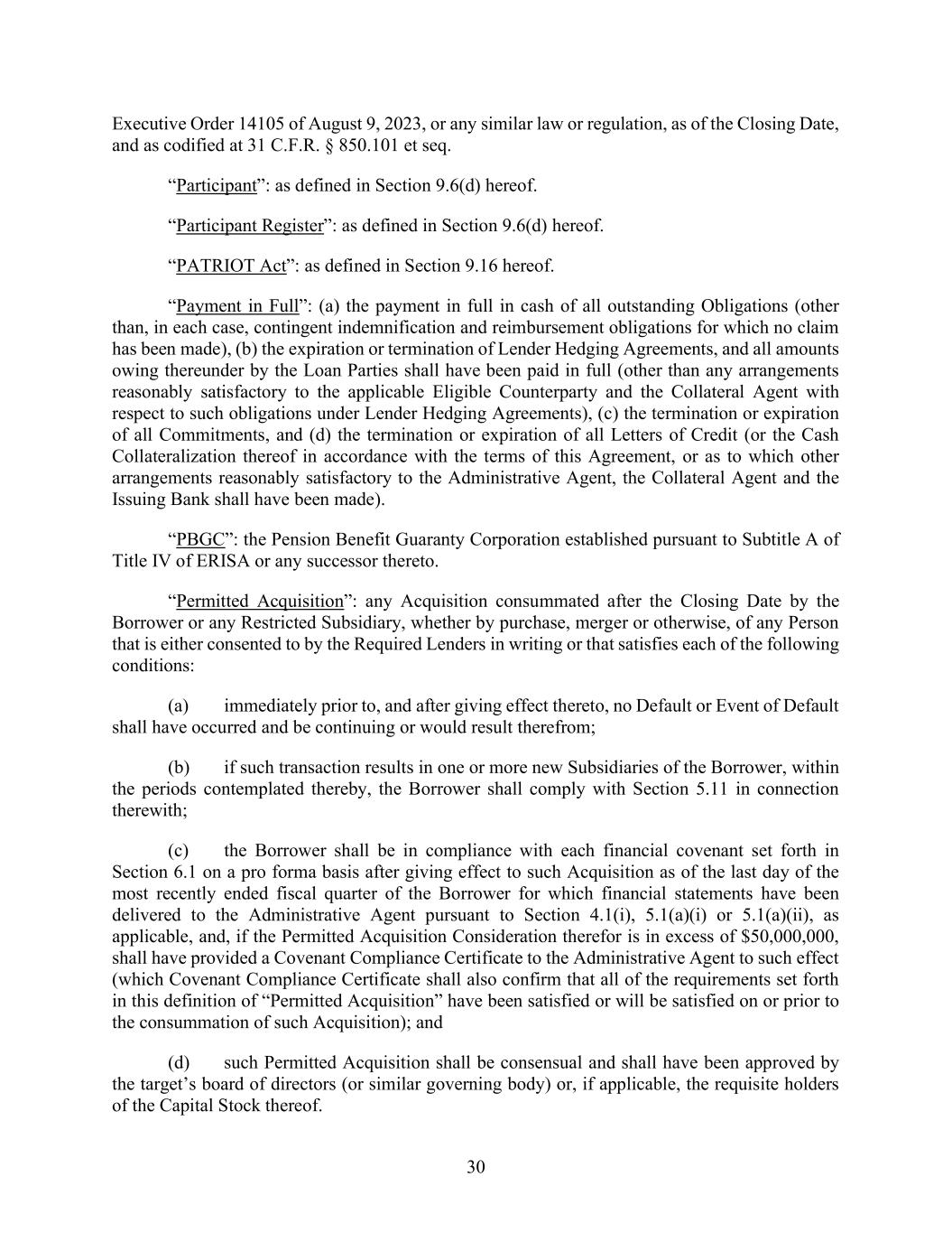 30 Executive Order 14105 of August 9, 2023, or any similar law or regulation, as of the Closing Date, and as codified at 31 C.F.R. § 850.101 et seq. “Participant”: as defined in Section 9.6(d) hereof. “Participant Register”: as defined in Section 9.6(d) hereof. “PATRIOT Act”: as defined in Section 9.16 hereof. “Payment in Full”: (a) the payment in full in cash of all outstanding Obligations (other than, in each case, contingent indemnification and reimbursement obligations for which no claim has been made), (b) the expiration or termination of Lender Hedging Agreements, and all amounts owing thereunder by the Loan Parties shall have been paid in full (other than any arrangements reasonably satisfactory to the applicable Eligible Counterparty and the Collateral Agent with respect to such obligations under Lender Hedging Agreements), (c) the termination or expiration of all Commitments, and (d) the termination or expiration of all Letters of Credit (or the Cash Collateralization thereof in accordance with the terms of this Agreement, or as to which other arrangements reasonably satisfactory to the Administrative Agent, the Collateral Agent and the Issuing Bank shall have been made). “PBGC”: the Pension Benefit Guaranty Corporation established pursuant to Subtitle A of Title IV of ERISA or any successor thereto. “Permitted Acquisition”: any Acquisition consummated after the Closing Date by the Borrower or any Restricted Subsidiary, whether by purchase, merger or otherwise, of any Person that is either consented to by the Required Lenders in writing or that satisfies each of the following conditions: (a) immediately prior to, and after giving effect thereto, no Default or Event of Default shall have occurred and be continuing or would result therefrom; (b) if such transaction results in one or more new Subsidiaries of the Borrower, within the periods contemplated thereby, the Borrower shall comply with Section 5.11 in connection therewith; (c) the Borrower shall be in compliance with each financial covenant set forth in Section 6.1 on a pro forma basis after giving effect to such Acquisition as of the last day of the most recently ended fiscal quarter of the Borrower for which financial statements have been delivered to the Administrative Agent pursuant to Section 4.1(i), 5.1(a)(i) or 5.1(a)(ii), as applicable, and, if the Permitted Acquisition Consideration therefor is in excess of $50,000,000, shall have provided a Covenant Compliance Certificate to the Administrative Agent to such effect (which Covenant Compliance Certificate shall also confirm that all of the requirements set forth in this definition of “Permitted Acquisition” have been satisfied or will be satisfied on or prior to the consummation of such Acquisition); and (d) such Permitted Acquisition shall be consensual and shall have been approved by the target’s board of directors (or similar governing body) or, if applicable, the requisite holders of the Capital Stock thereof.