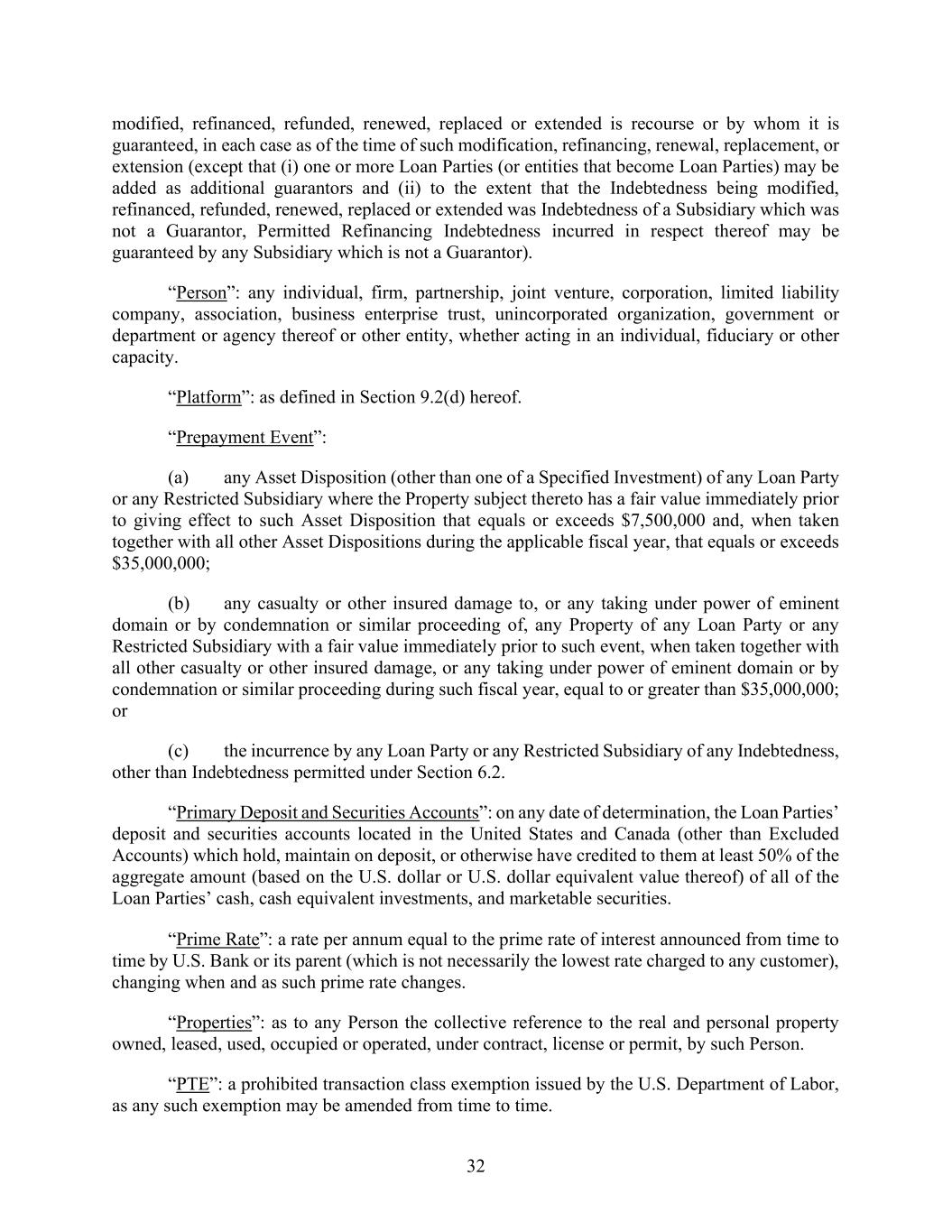 32 modified, refinanced, refunded, renewed, replaced or extended is recourse or by whom it is guaranteed, in each case as of the time of such modification, refinancing, renewal, replacement, or extension (except that (i) one or more Loan Parties (or entities that become Loan Parties) may be added as additional guarantors and (ii) to the extent that the Indebtedness being modified, refinanced, refunded, renewed, replaced or extended was Indebtedness of a Subsidiary which was not a Guarantor, Permitted Refinancing Indebtedness incurred in respect thereof may be guaranteed by any Subsidiary which is not a Guarantor). “Person”: any individual, firm, partnership, joint venture, corporation, limited liability company, association, business enterprise trust, unincorporated organization, government or department or agency thereof or other entity, whether acting in an individual, fiduciary or other capacity. “Platform”: as defined in Section 9.2(d) hereof. “Prepayment Event”: (a) any Asset Disposition (other than one of a Specified Investment) of any Loan Party or any Restricted Subsidiary where the Property subject thereto has a fair value immediately prior to giving effect to such Asset Disposition that equals or exceeds $7,500,000 and, when taken together with all other Asset Dispositions during the applicable fiscal year, that equals or exceeds $35,000,000; (b) any casualty or other insured damage to, or any taking under power of eminent domain or by condemnation or similar proceeding of, any Property of any Loan Party or any Restricted Subsidiary with a fair value immediately prior to such event, when taken together with all other casualty or other insured damage, or any taking under power of eminent domain or by condemnation or similar proceeding during such fiscal year, equal to or greater than $35,000,000; or (c) the incurrence by any Loan Party or any Restricted Subsidiary of any Indebtedness, other than Indebtedness permitted under Section 6.2. “Primary Deposit and Securities Accounts”: on any date of determination, the Loan Parties’ deposit and securities accounts located in the United States and Canada (other than Excluded Accounts) which hold, maintain on deposit, or otherwise have credited to them at least 50% of the aggregate amount (based on the U.S. dollar or U.S. dollar equivalent value thereof) of all of the Loan Parties’ cash, cash equivalent investments, and marketable securities. “Prime Rate”: a rate per annum equal to the prime rate of interest announced from time to time by U.S. Bank or its parent (which is not necessarily the lowest rate charged to any customer), changing when and as such prime rate changes. “Properties”: as to any Person the collective reference to the real and personal property owned, leased, used, occupied or operated, under contract, license or permit, by such Person. “PTE”: a prohibited transaction class exemption issued by the U.S. Department of Labor, as any such exemption may be amended from time to time.