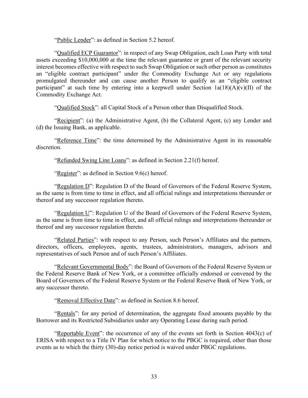 33 “Public Lender”: as defined in Section 5.2 hereof. “Qualified ECP Guarantor”: in respect of any Swap Obligation, each Loan Party with total assets exceeding $10,000,000 at the time the relevant guarantee or grant of the relevant security interest becomes effective with respect to such Swap Obligation or such other person as constitutes an “eligible contract participant” under the Commodity Exchange Act or any regulations promulgated thereunder and can cause another Person to qualify as an “eligible contract participant” at such time by entering into a keepwell under Section 1a(18)(A)(v)(II) of the Commodity Exchange Act. “Qualified Stock”: all Capital Stock of a Person other than Disqualified Stock. “Recipient”: (a) the Administrative Agent, (b) the Collateral Agent, (c) any Lender and (d) the Issuing Bank, as applicable. “Reference Time”: the time determined by the Administrative Agent in its reasonable discretion. “Refunded Swing Line Loans”: as defined in Section 2.21(f) hereof. “Register”: as defined in Section 9.6(c) hereof. “Regulation D”: Regulation D of the Board of Governors of the Federal Reserve System, as the same is from time to time in effect, and all official rulings and interpretations thereunder or thereof and any successor regulation thereto. “Regulation U”: Regulation U of the Board of Governors of the Federal Reserve System, as the same is from time to time in effect, and all official rulings and interpretations thereunder or thereof and any successor regulation thereto. “Related Parties”: with respect to any Person, such Person’s Affiliates and the partners, directors, officers, employees, agents, trustees, administrators, managers, advisors and representatives of such Person and of such Person’s Affiliates. “Relevant Governmental Body”: the Board of Governors of the Federal Reserve System or the Federal Reserve Bank of New York, or a committee officially endorsed or convened by the Board of Governors of the Federal Reserve System or the Federal Reserve Bank of New York, or any successor thereto. “Removal Effective Date”: as defined in Section 8.6 hereof. “Rentals”: for any period of determination, the aggregate fixed amounts payable by the Borrower and its Restricted Subsidiaries under any Operating Lease during such period. “Reportable Event”: the occurrence of any of the events set forth in Section 4043(c) of ERISA with respect to a Title IV Plan for which notice to the PBGC is required, other than those events as to which the thirty (30)-day notice period is waived under PBGC regulations.