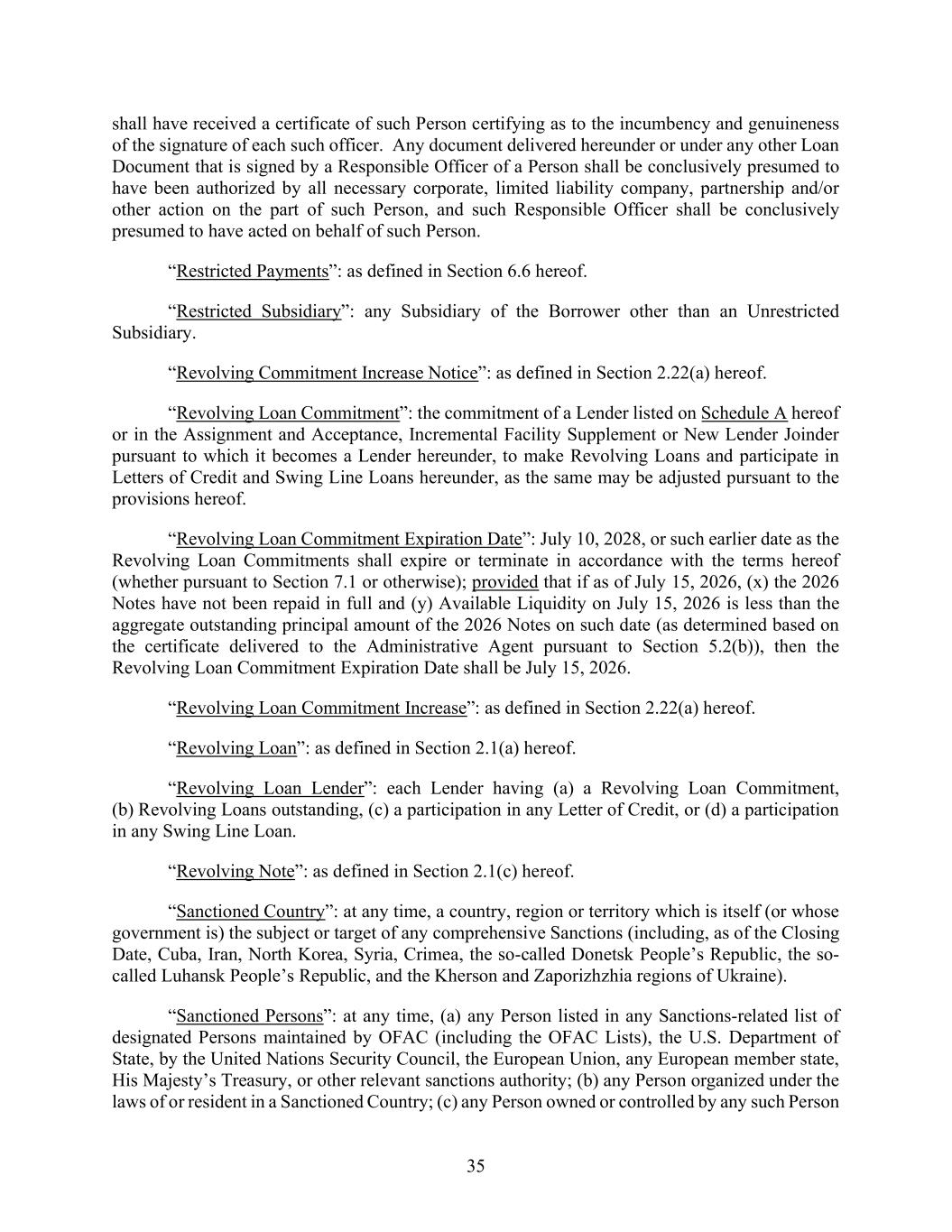 35 shall have received a certificate of such Person certifying as to the incumbency and genuineness of the signature of each such officer. Any document delivered hereunder or under any other Loan Document that is signed by a Responsible Officer of a Person shall be conclusively presumed to have been authorized by all necessary corporate, limited liability company, partnership and/or other action on the part of such Person, and such Responsible Officer shall be conclusively presumed to have acted on behalf of such Person. “Restricted Payments”: as defined in Section 6.6 hereof. “Restricted Subsidiary”: any Subsidiary of the Borrower other than an Unrestricted Subsidiary. “Revolving Commitment Increase Notice”: as defined in Section 2.22(a) hereof. “Revolving Loan Commitment”: the commitment of a Lender listed on Schedule A hereof or in the Assignment and Acceptance, Incremental Facility Supplement or New Lender Joinder pursuant to which it becomes a Lender hereunder, to make Revolving Loans and participate in Letters of Credit and Swing Line Loans hereunder, as the same may be adjusted pursuant to the provisions hereof. “Revolving Loan Commitment Expiration Date”: July 10, 2028, or such earlier date as the Revolving Loan Commitments shall expire or terminate in accordance with the terms hereof (whether pursuant to Section 7.1 or otherwise); provided that if as of July 15, 2026, (x) the 2026 Notes have not been repaid in full and (y) Available Liquidity on July 15, 2026 is less than the aggregate outstanding principal amount of the 2026 Notes on such date (as determined based on the certificate delivered to the Administrative Agent pursuant to Section 5.2(b)), then the Revolving Loan Commitment Expiration Date shall be July 15, 2026. “Revolving Loan Commitment Increase”: as defined in Section 2.22(a) hereof. “Revolving Loan”: as defined in Section 2.1(a) hereof. “Revolving Loan Lender”: each Lender having (a) a Revolving Loan Commitment, (b) Revolving Loans outstanding, (c) a participation in any Letter of Credit, or (d) a participation in any Swing Line Loan. “Revolving Note”: as defined in Section 2.1(c) hereof. “Sanctioned Country”: at any time, a country, region or territory which is itself (or whose government is) the subject or target of any comprehensive Sanctions (including, as of the Closing Date, Cuba, Iran, North Korea, Syria, Crimea, the so-called Donetsk People’s Republic, the so- called Luhansk People’s Republic, and the Kherson and Zaporizhzhia regions of Ukraine). “Sanctioned Persons”: at any time, (a) any Person listed in any Sanctions-related list of designated Persons maintained by OFAC (including the OFAC Lists), the U.S. Department of State, by the United Nations Security Council, the European Union, any European member state, His Majesty’s Treasury, or other relevant sanctions authority; (b) any Person organized under the laws of or resident in a Sanctioned Country; (c) any Person owned or controlled by any such Person