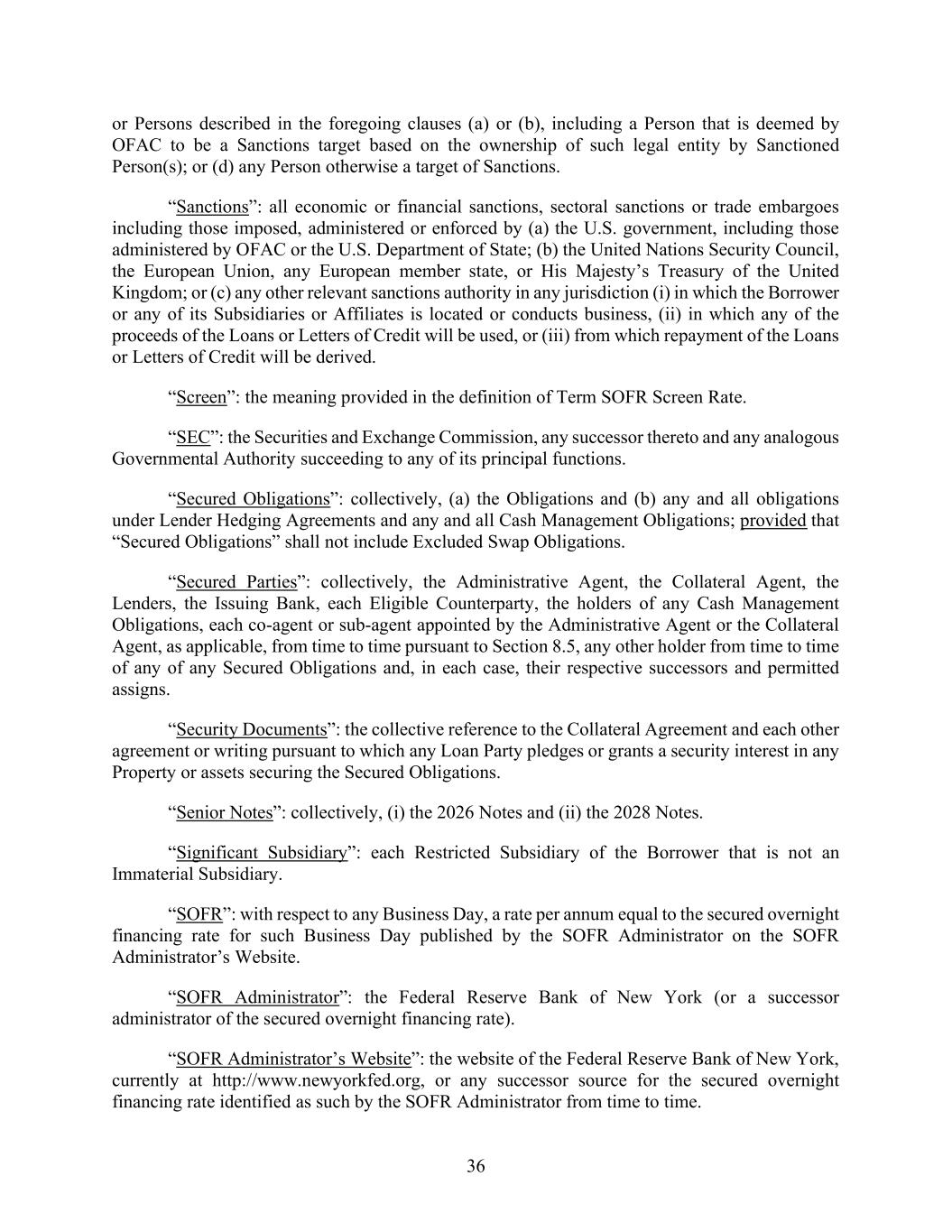 36 or Persons described in the foregoing clauses (a) or (b), including a Person that is deemed by OFAC to be a Sanctions target based on the ownership of such legal entity by Sanctioned Person(s); or (d) any Person otherwise a target of Sanctions. “Sanctions”: all economic or financial sanctions, sectoral sanctions or trade embargoes including those imposed, administered or enforced by (a) the U.S. government, including those administered by OFAC or the U.S. Department of State; (b) the United Nations Security Council, the European Union, any European member state, or His Majesty’s Treasury of the United Kingdom; or (c) any other relevant sanctions authority in any jurisdiction (i) in which the Borrower or any of its Subsidiaries or Affiliates is located or conducts business, (ii) in which any of the proceeds of the Loans or Letters of Credit will be used, or (iii) from which repayment of the Loans or Letters of Credit will be derived. “Screen”: the meaning provided in the definition of Term SOFR Screen Rate. “SEC”: the Securities and Exchange Commission, any successor thereto and any analogous Governmental Authority succeeding to any of its principal functions. “Secured Obligations”: collectively, (a) the Obligations and (b) any and all obligations under Lender Hedging Agreements and any and all Cash Management Obligations; provided that “Secured Obligations” shall not include Excluded Swap Obligations. “Secured Parties”: collectively, the Administrative Agent, the Collateral Agent, the Lenders, the Issuing Bank, each Eligible Counterparty, the holders of any Cash Management Obligations, each co-agent or sub-agent appointed by the Administrative Agent or the Collateral Agent, as applicable, from time to time pursuant to Section 8.5, any other holder from time to time of any of any Secured Obligations and, in each case, their respective successors and permitted assigns. “Security Documents”: the collective reference to the Collateral Agreement and each other agreement or writing pursuant to which any Loan Party pledges or grants a security interest in any Property or assets securing the Secured Obligations. “Senior Notes”: collectively, (i) the 2026 Notes and (ii) the 2028 Notes. “Significant Subsidiary”: each Restricted Subsidiary of the Borrower that is not an Immaterial Subsidiary. “SOFR”: with respect to any Business Day, a rate per annum equal to the secured overnight financing rate for such Business Day published by the SOFR Administrator on the SOFR Administrator’s Website. “SOFR Administrator”: the Federal Reserve Bank of New York (or a successor administrator of the secured overnight financing rate). “SOFR Administrator’s Website”: the website of the Federal Reserve Bank of New York, currently at http://www.newyorkfed.org, or any successor source for the secured overnight financing rate identified as such by the SOFR Administrator from time to time.