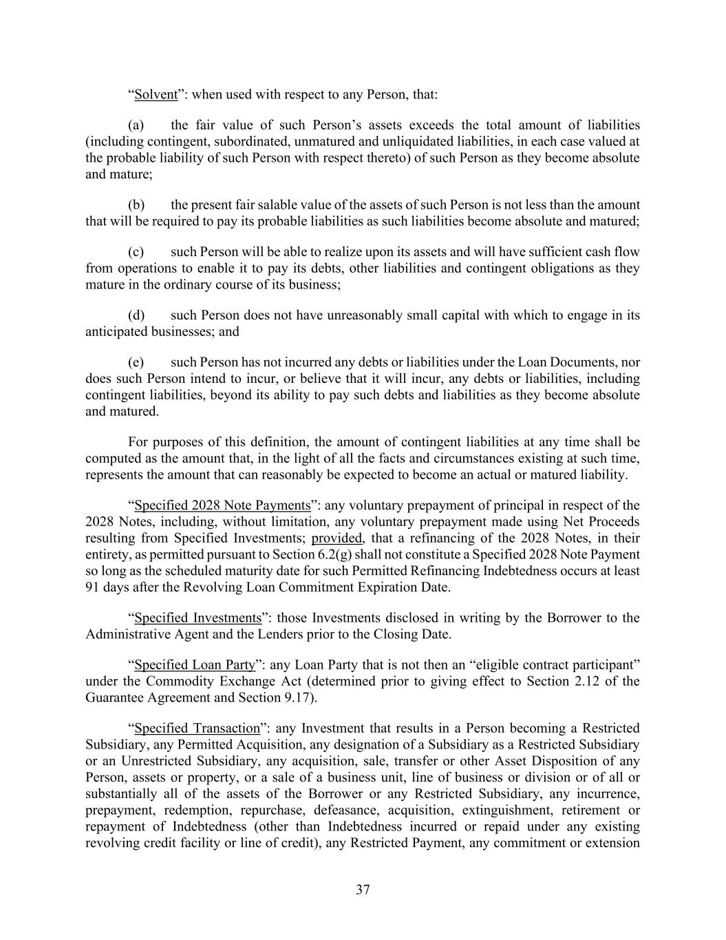 37 “Solvent”: when used with respect to any Person, that: (a) the fair value of such Person’s assets exceeds the total amount of liabilities (including contingent, subordinated, unmatured and unliquidated liabilities, in each case valued at the probable liability of such Person with respect thereto) of such Person as they become absolute and mature; (b) the present fair salable value of the assets of such Person is not less than the amount that will be required to pay its probable liabilities as such liabilities become absolute and matured; (c) such Person will be able to realize upon its assets and will have sufficient cash flow from operations to enable it to pay its debts, other liabilities and contingent obligations as they mature in the ordinary course of its business; (d) such Person does not have unreasonably small capital with which to engage in its anticipated businesses; and (e) such Person has not incurred any debts or liabilities under the Loan Documents, nor does such Person intend to incur, or believe that it will incur, any debts or liabilities, including contingent liabilities, beyond its ability to pay such debts and liabilities as they become absolute and matured. For purposes of this definition, the amount of contingent liabilities at any time shall be computed as the amount that, in the light of all the facts and circumstances existing at such time, represents the amount that can reasonably be expected to become an actual or matured liability. “Specified 2028 Note Payments”: any voluntary prepayment of principal in respect of the 2028 Notes, including, without limitation, any voluntary prepayment made using Net Proceeds resulting from Specified Investments; provided, that a refinancing of the 2028 Notes, in their entirety, as permitted pursuant to Section 6.2(g) shall not constitute a Specified 2028 Note Payment so long as the scheduled maturity date for such Permitted Refinancing Indebtedness occurs at least 91 days after the Revolving Loan Commitment Expiration Date. “Specified Investments”: those Investments disclosed in writing by the Borrower to the Administrative Agent and the Lenders prior to the Closing Date. “Specified Loan Party”: any Loan Party that is not then an “eligible contract participant” under the Commodity Exchange Act (determined prior to giving effect to Section 2.12 of the Guarantee Agreement and Section 9.17). “Specified Transaction”: any Investment that results in a Person becoming a Restricted Subsidiary, any Permitted Acquisition, any designation of a Subsidiary as a Restricted Subsidiary or an Unrestricted Subsidiary, any acquisition, sale, transfer or other Asset Disposition of any Person, assets or property, or a sale of a business unit, line of business or division or of all or substantially all of the assets of the Borrower or any Restricted Subsidiary, any incurrence, prepayment, redemption, repurchase, defeasance, acquisition, extinguishment, retirement or repayment of Indebtedness (other than Indebtedness incurred or repaid under any existing revolving credit facility or line of credit), any Restricted Payment, any commitment or extension